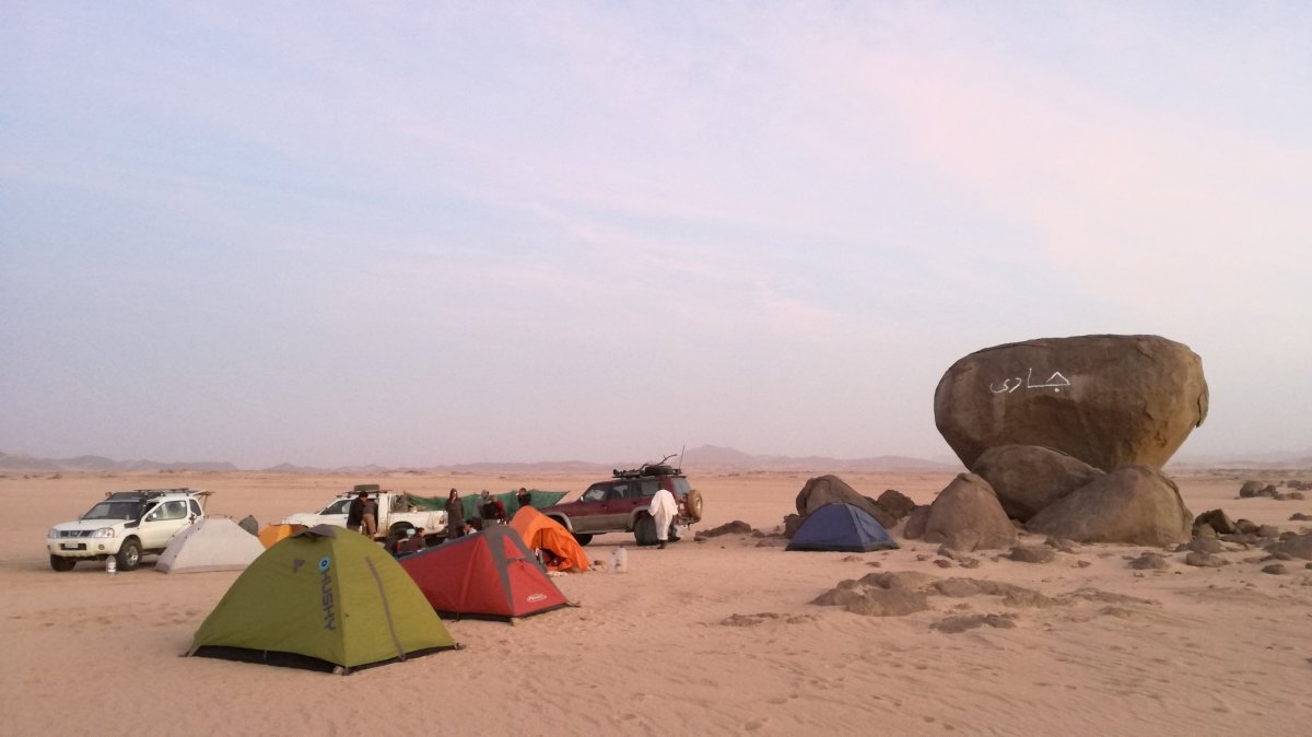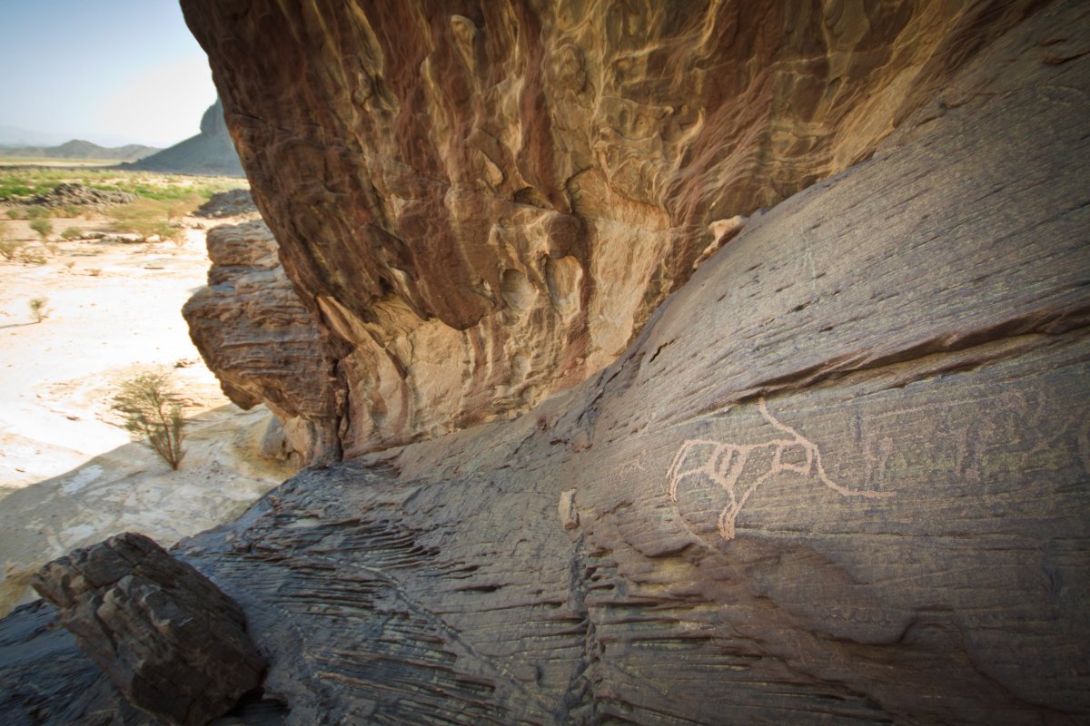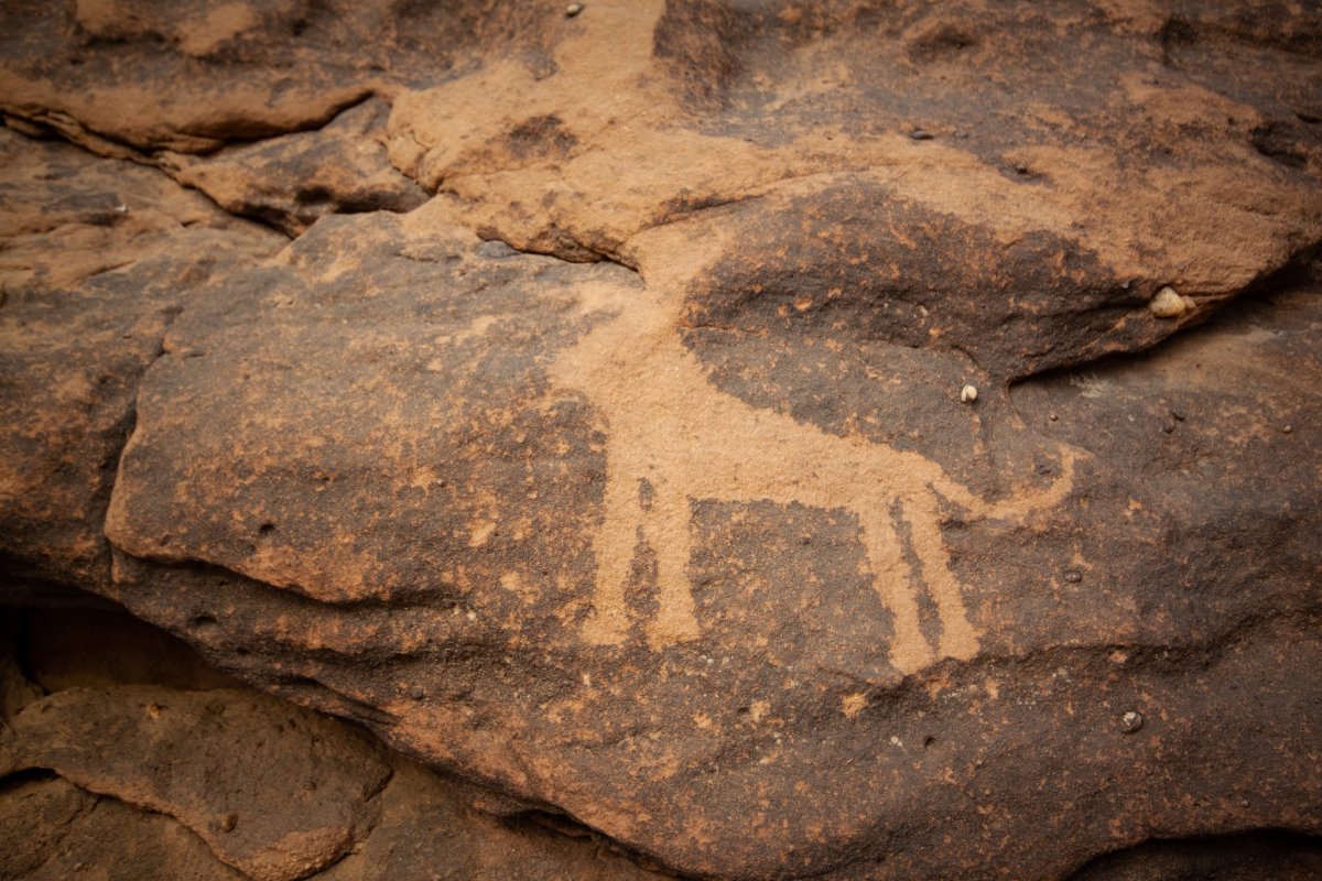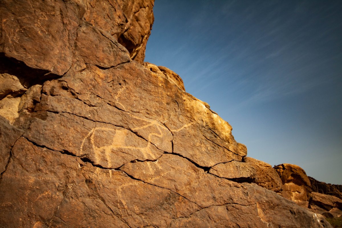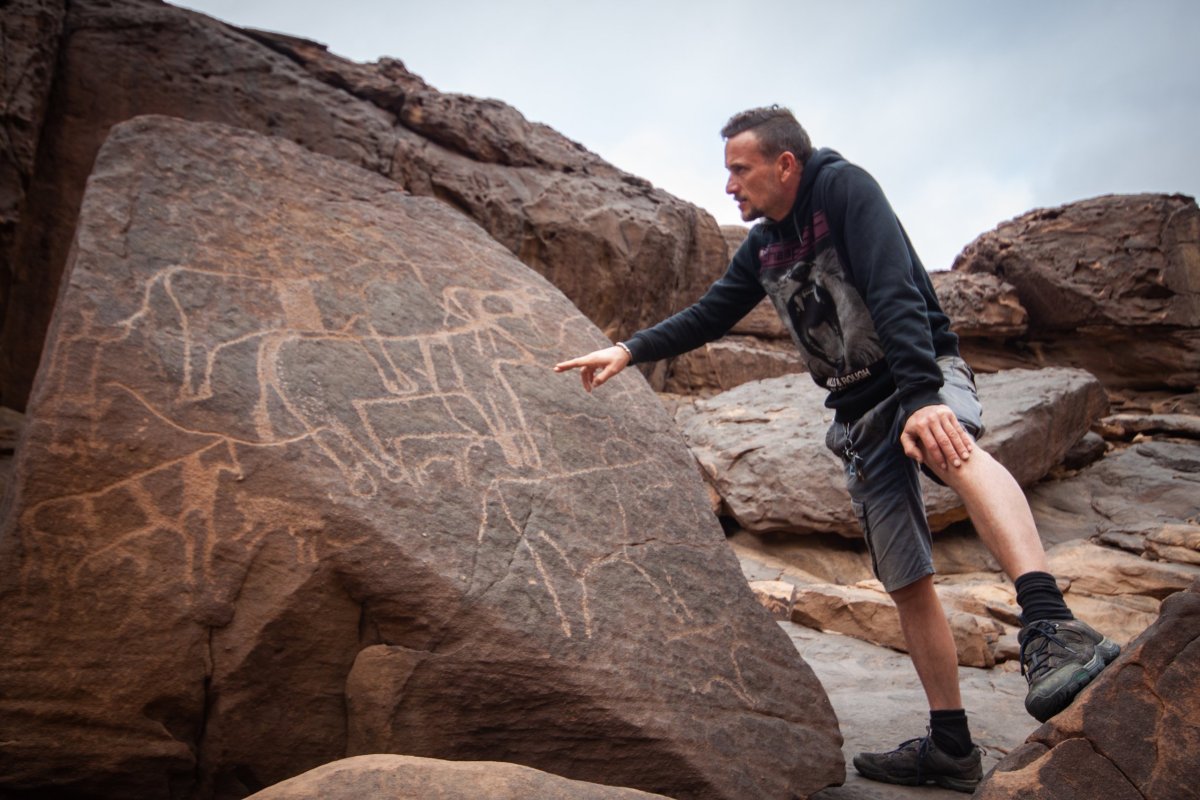 Za východu slunce, pod zlatavými paprsky oblézáme masivní skálu tyčící se hrdě k nebesům. Ta by mohla vyprávět, co všechno viděla za ty tisíce let. Zatím se nedaří. Hledáme tvar čehokoliv, co by mohlo kdysi dávno sloužit jako orientační bod. To přeci bývalo dost důležité pro pouštní karavany nebo právě pro lovce-sběrače, kteří kočovali za potravou. Jeden balvan vypadá jako hlava velblouda, jdeme tím směrem. Projdeme vyprahlým korytem řeky, úžlabinou ve skále a před námi se otevírá pláň lapená do náruče členitého skaliska.