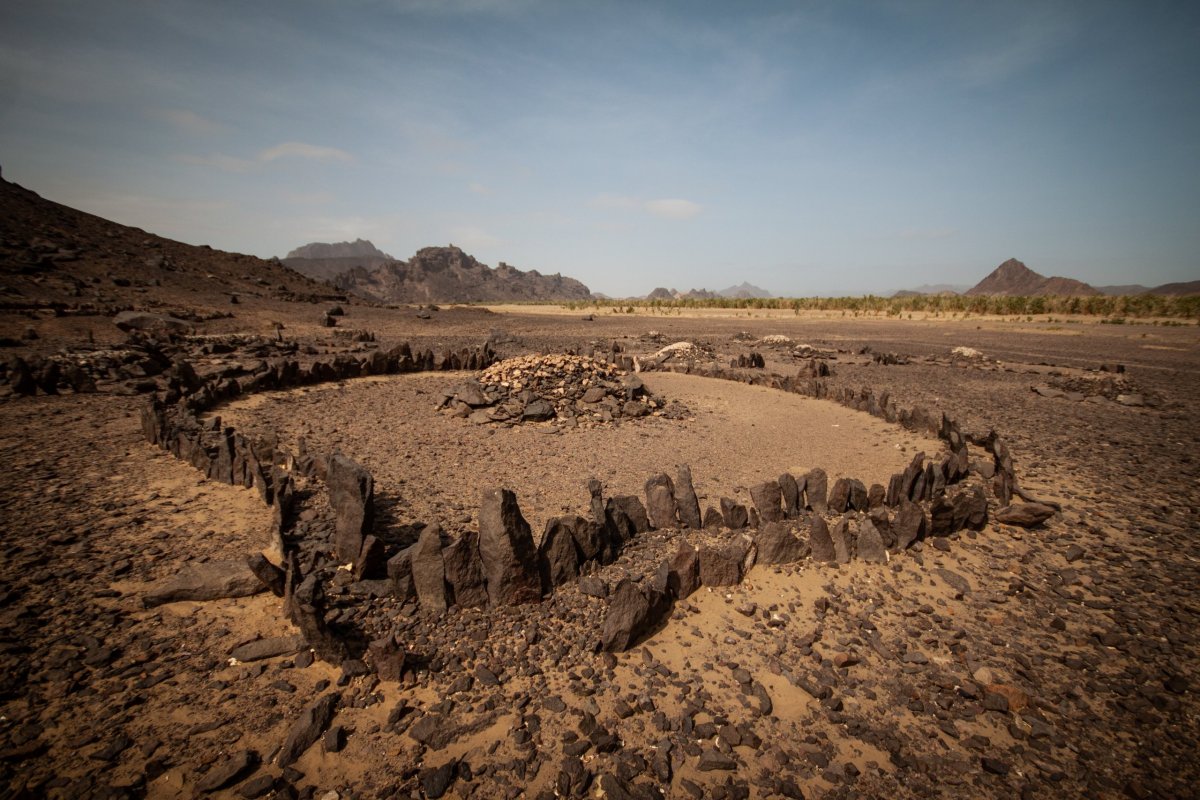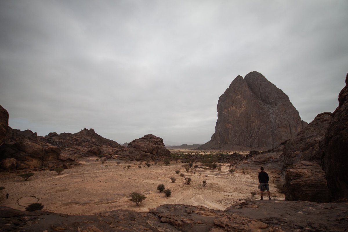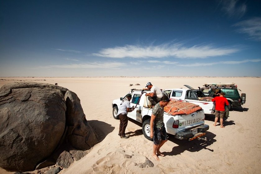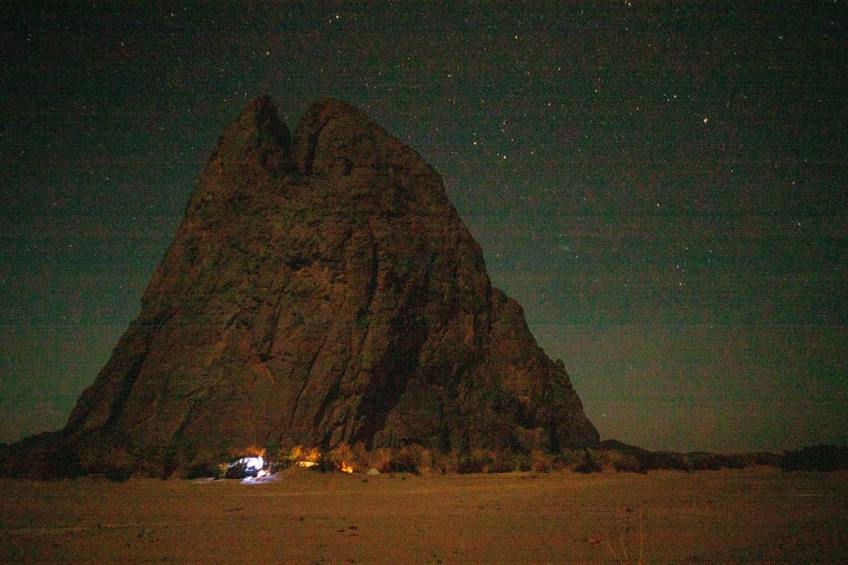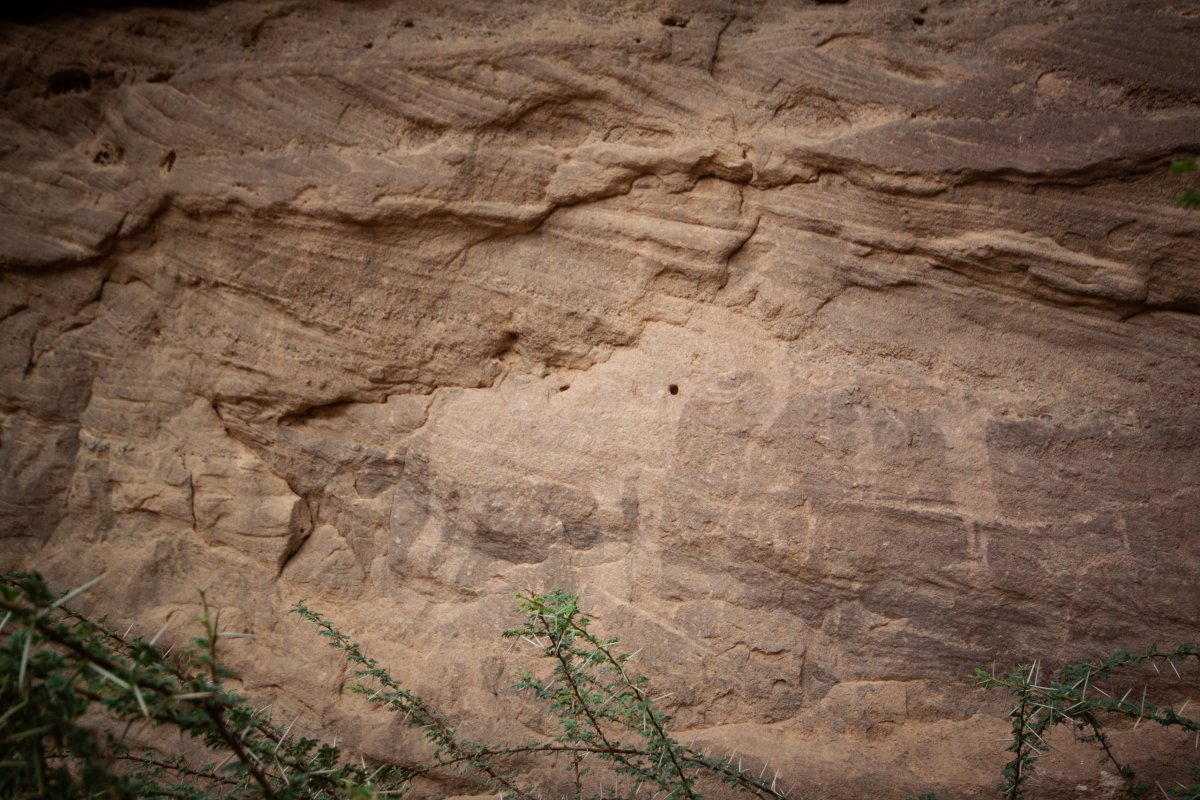 Za východu slunce, pod zlatavými paprsky oblézáme masivní skálu tyčící se hrdě k nebesům. Ta by mohla vyprávět, co všechno viděla za ty tisíce let. Zatím se nedaří. Hledáme tvar čehokoliv, co by mohlo kdysi dávno sloužit jako orientační bod. To přeci bývalo dost důležité pro pouštní karavany nebo právě pro lovce-sběrače, kteří kočovali za potravou. Jeden balvan vypadá jako hlava velblouda, jdeme tím směrem. Projdeme vyprahlým korytem řeky, úžlabinou ve skále a před námi se otevírá pláň lapená do náruče členitého skaliska.