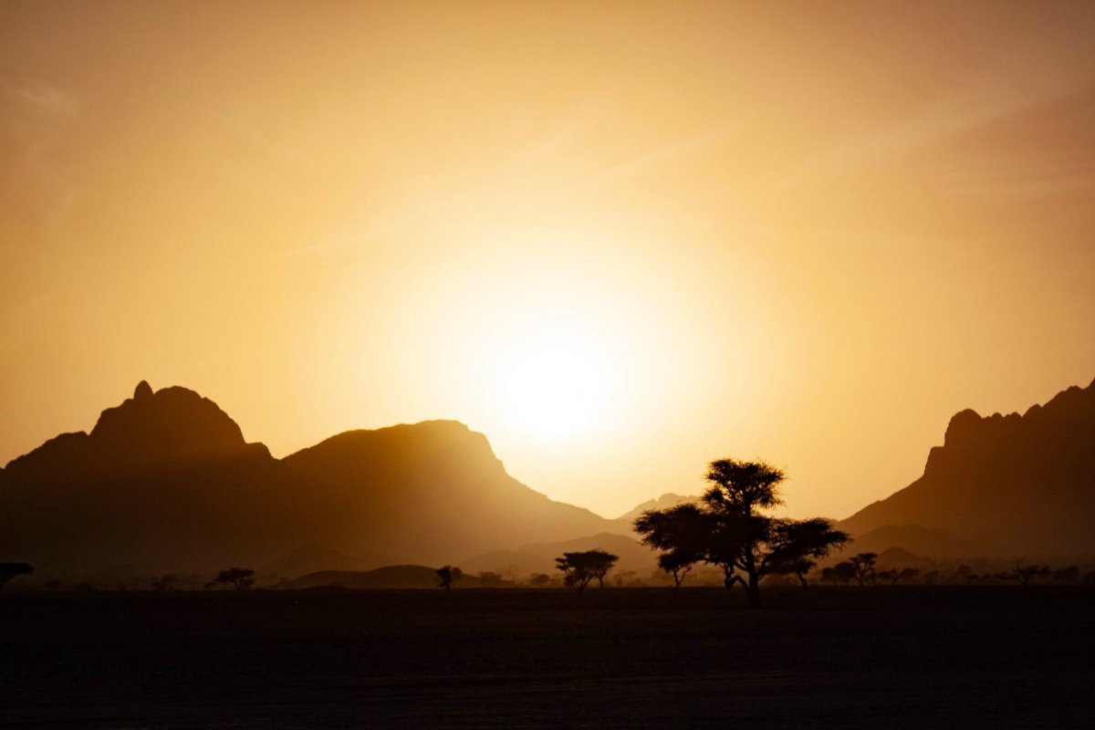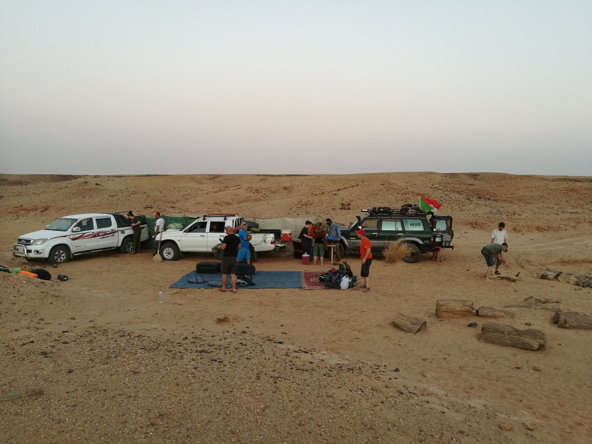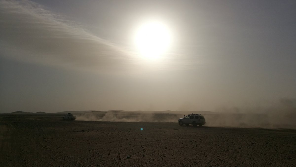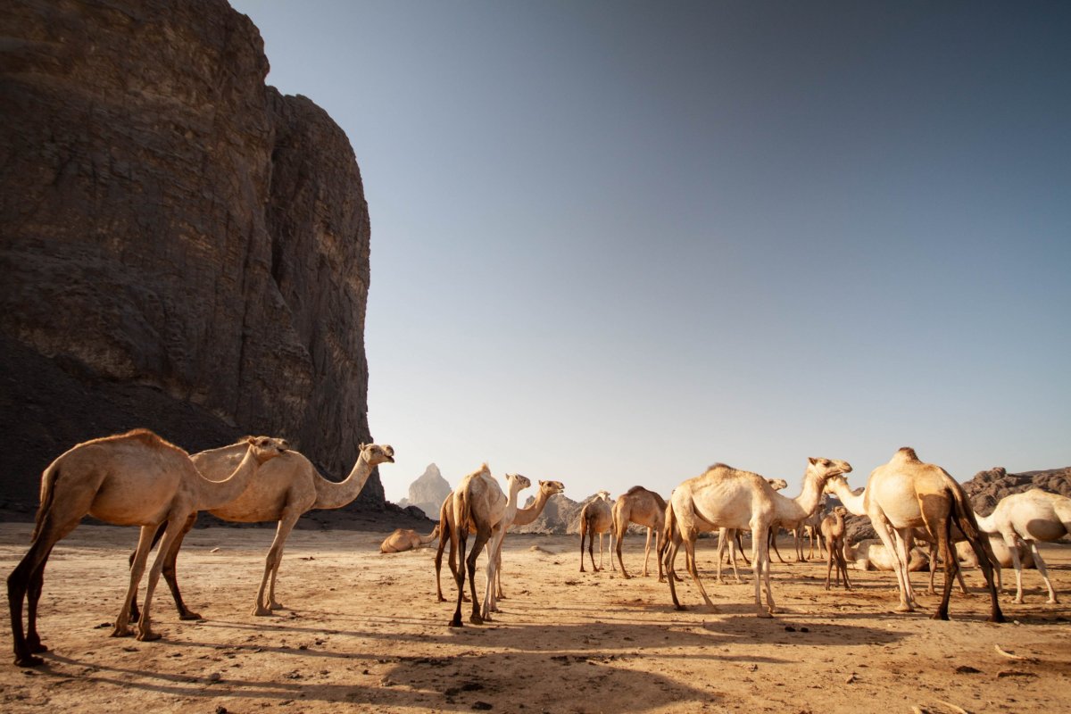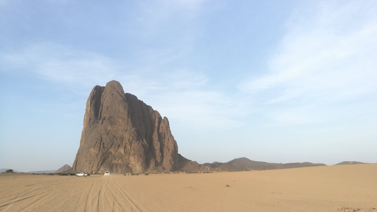 Za východu slunce, pod zlatavými paprsky oblézáme masivní skálu tyčící se hrdě k nebesům. Ta by mohla vyprávět, co všechno viděla za ty tisíce let. Zatím se nedaří. Hledáme tvar čehokoliv, co by mohlo kdysi dávno sloužit jako orientační bod. To přeci bývalo dost důležité pro pouštní karavany nebo právě pro lovce-sběrače, kteří kočovali za potravou. Jeden balvan vypadá jako hlava velblouda, jdeme tím směrem. Projdeme vyprahlým korytem řeky, úžlabinou ve skále a před námi se otevírá pláň lapená do náruče členitého skaliska.