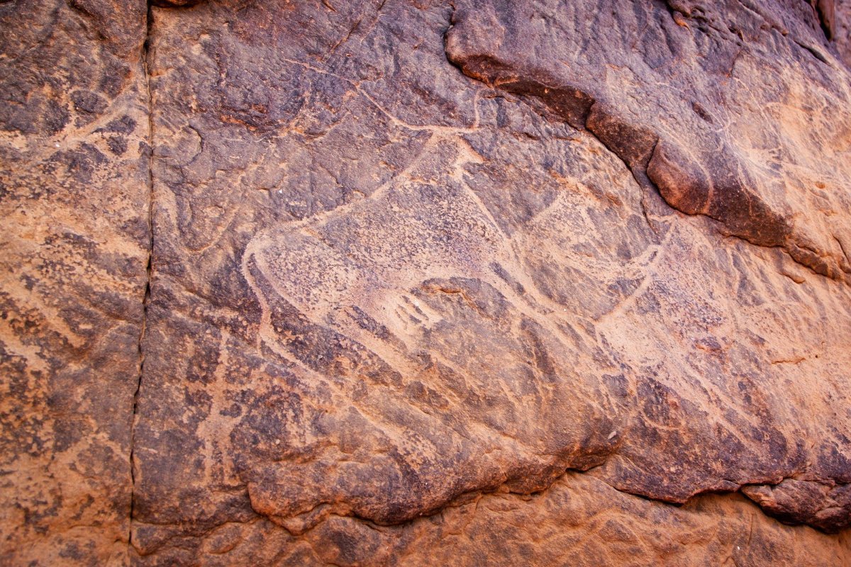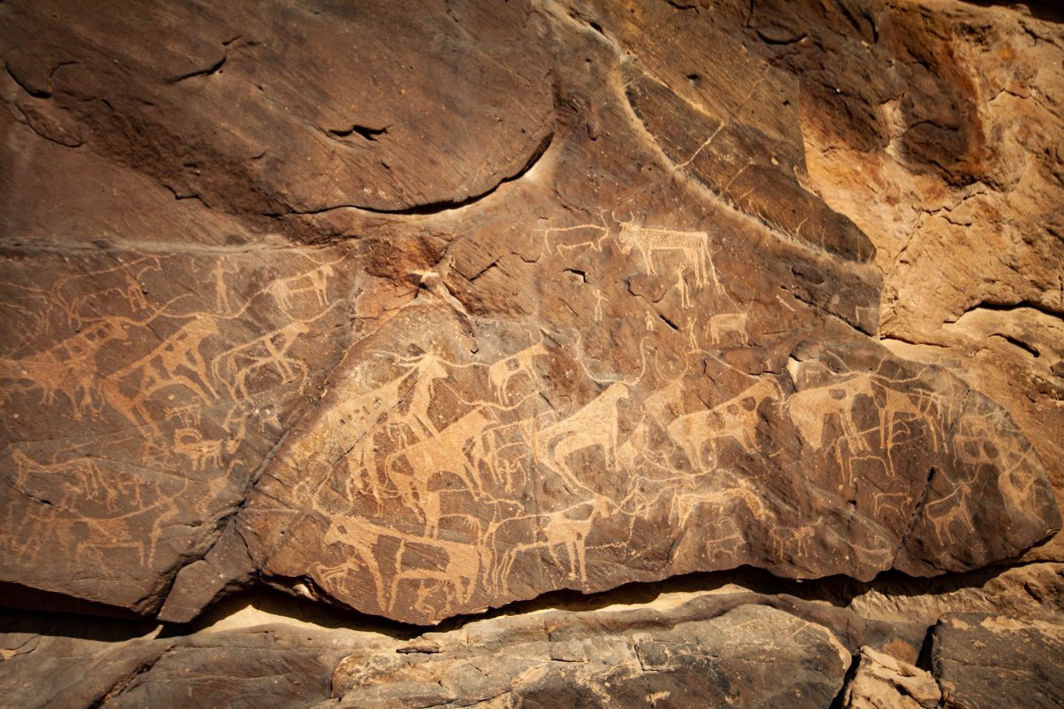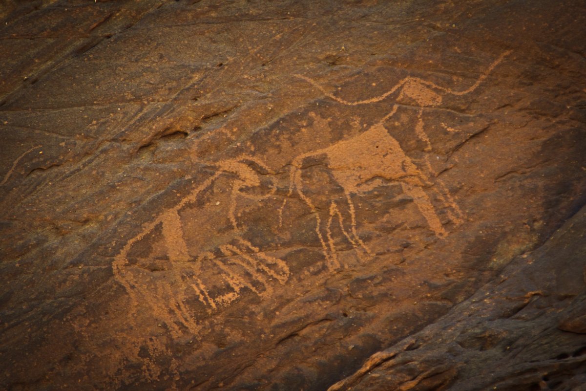 Mezi početným stádem krav nacházíme scénu z lovu antilopy. O kus dál pobíhá slon a za rohem číhá kočkovitá šelma. Podle detailů na těle to vypadá na levharta. To je jasný důkaz toho, jaká zvěř v těchto končinách kdysi dávno opravdu žila. Mezi primitivními rytinami a kresbami jsou i dokonalé obrazy s vypracovaným detailem, když si uvědomíme, v jaké fázi vývoje tenkrát lidé byli a jaké malířské pomůcky měli k dispozici, smekám. Nejstarší jsou rytiny, postupem se vyvíjeli a používali jiné nástroje. Proto některé kresby jsou spíše rytinami, protože byly ryté do kamene, a některé do červena nebo do černa, to značí použití hlinky nebo uhlíků z ohně. Umění v této oblasti se připisuje neolitickému období, presentován kult plodnosti ve vztahu k chovu dobytka. Mnohem později zde domorodci prezentovali velbloudy, proto někde právě velbloudi překrývají původní obrazce. Zkoumáme, diskutujeme, představujeme si a vytváříme příběhy k jednotlivým obrazům. Z jednotlivých kreseb lze i vyčíst z jakého období jsou a jak se tamní obyvatelé vyvíjeli. Ty kde lovci loví s oštěpy a sekerami jsou nejstarší, později na řadu přišly luky a šípy. Cítíme blažený pocit uspokojení. Zdolali jsme záludnou poušť a našli místa, které spatřila opravdu jen hrstka smrtelníků.