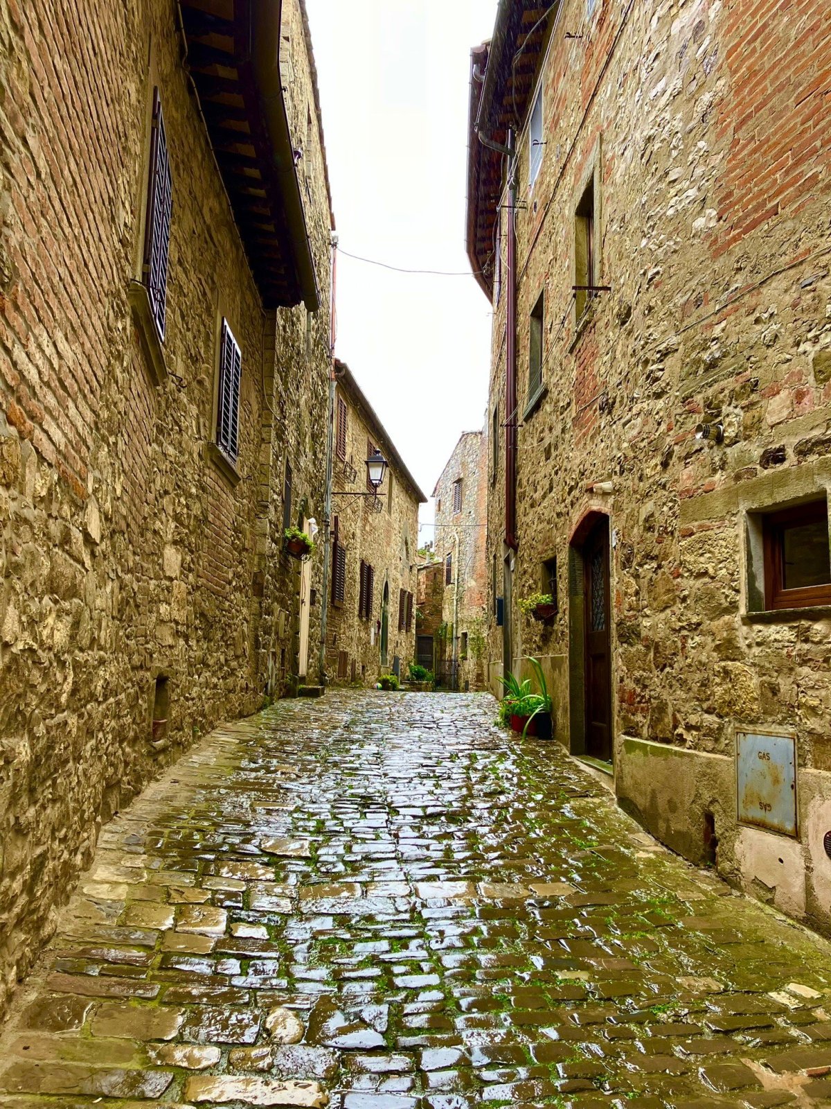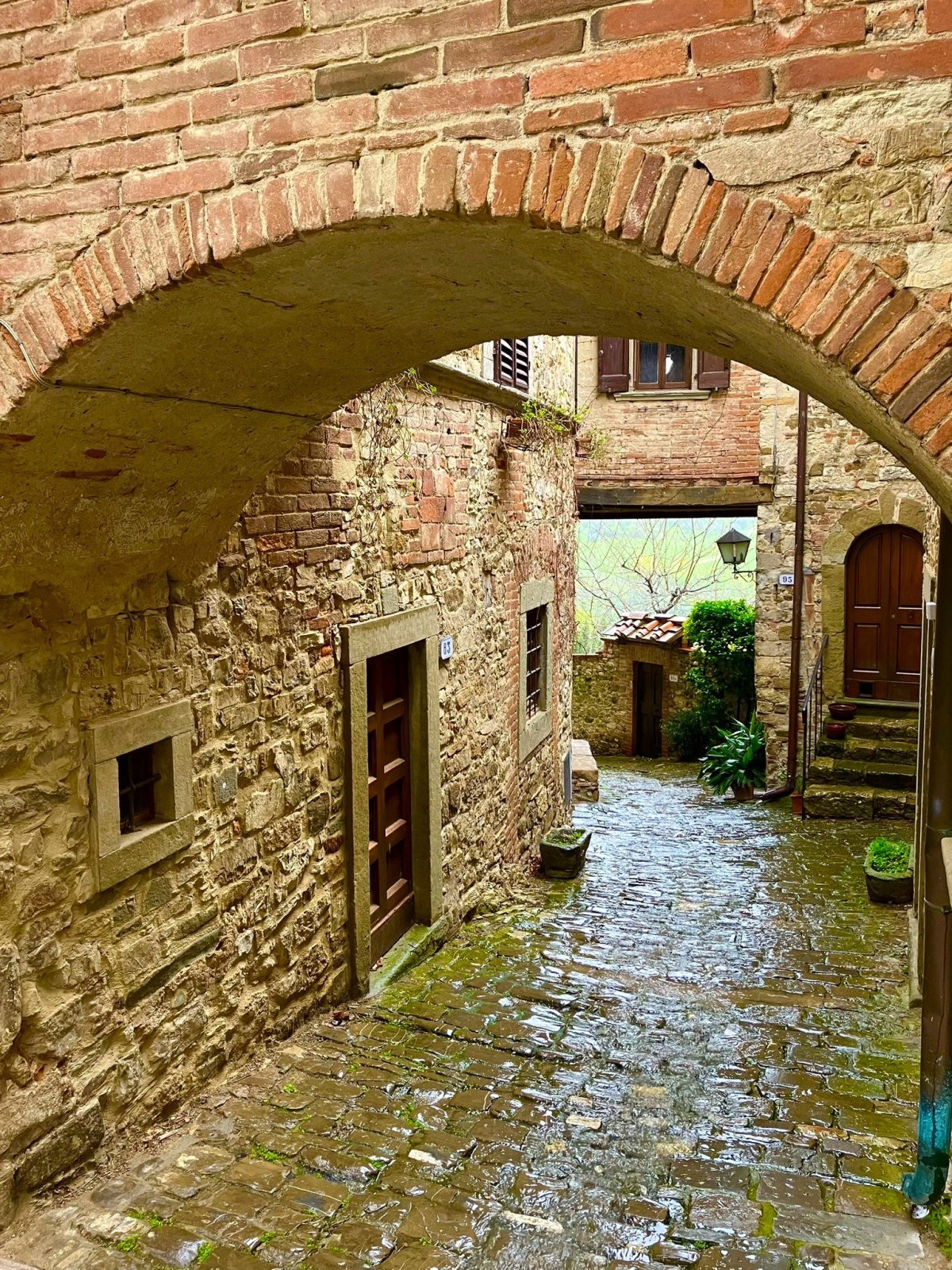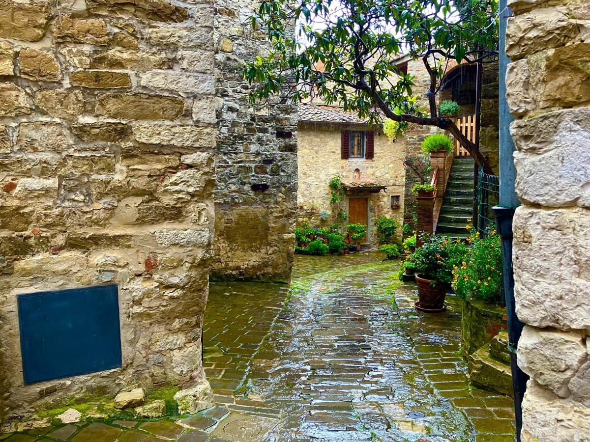 Největším zážitkem z trasy je pro nás středověká vesnička Montefioralle z 11. století, monumentálně usazená jako obří hrad na kopci kousek nad Greve in Chianti. Prý se zde narodil slavný cestovatel Amerigo Vespucci. Za deště máme tu čest projít si fantastickou spleť uliček v centru o samotě.