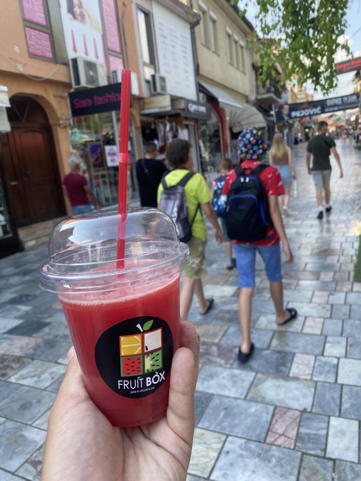 A proč rychlotrip? Protože jsem dopoledne odjížděl z Tirany do Ohridu. Bus měl zpoždění a tak jsem měl na Ohrid pouze necelou hodinu. Hned jsem svištěl k jezeru, dal si melounový džusík za cca 30 korun a švihal zpátky na bus směr Skopje.