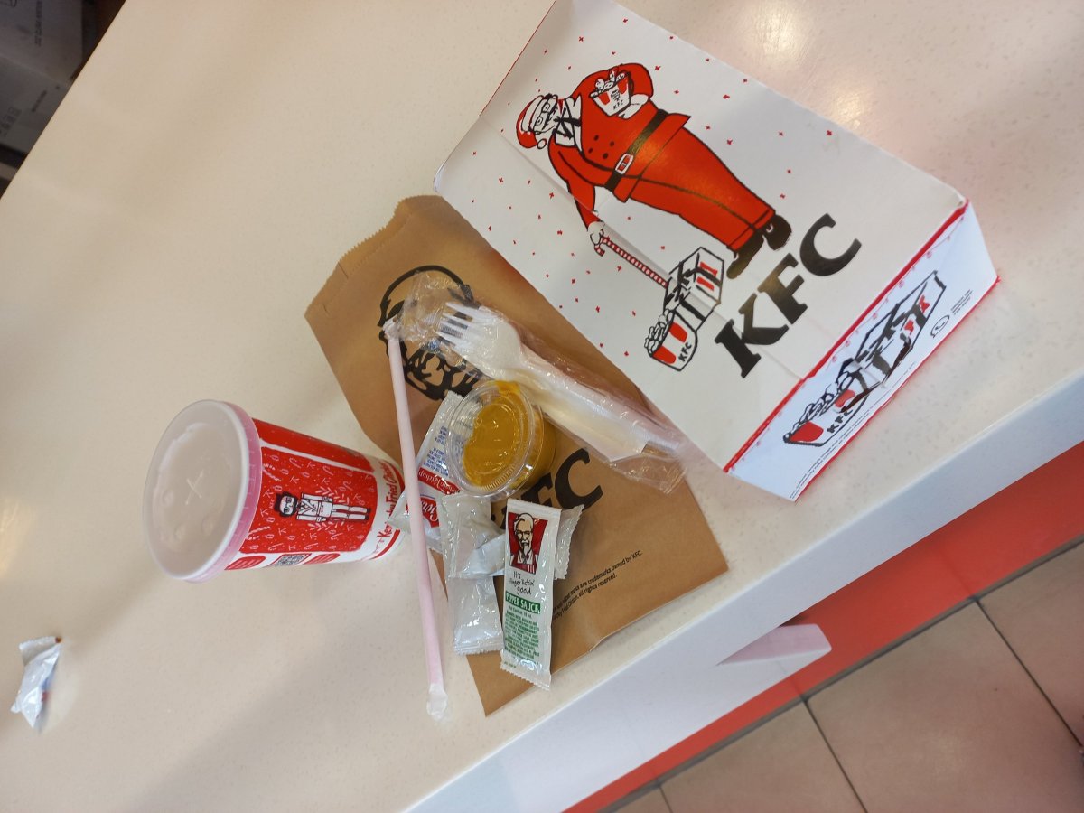 KFC box (2xkousek kuřete, 2xhranolky, nápoj, omáčky): 145,-