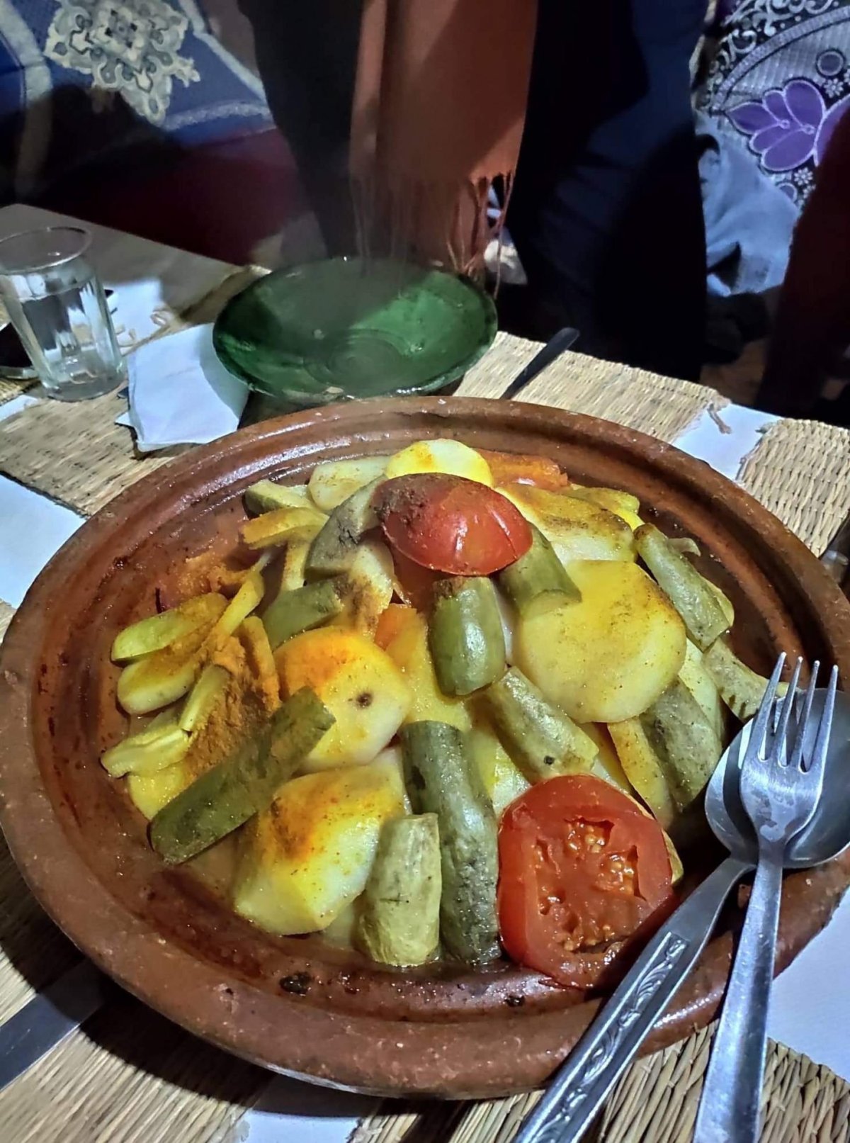 Večer nám Bivouac připravil výbornou večeři. Rýžovou polévku, Tajin(národní marocké jídlo) a ovoce. Od stolu jsme po dlouhé době odcházeli opravdu suprově najezeni a přesunuli jsme se k ohni, který pro nás sympaťák z pouště připravil. Opět jsme se dozvěděli spoustu zajímavých věcí, včetně života v poušti a vztahy Maroka se sousedními státy.