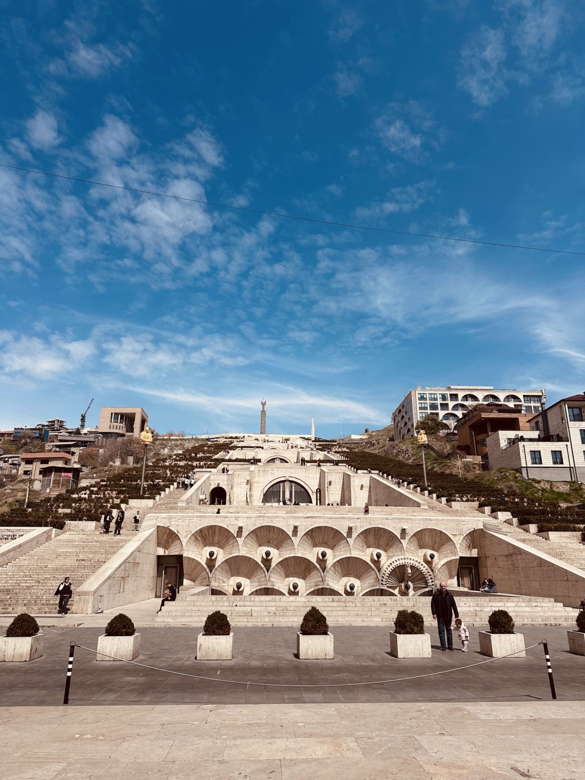 - Kaskádu: Monumentální schodiště, které je galerií pod širým nebem. Když vyjdete až nahoru, máte Jerevan jako na dlani a za ním se tyčí majestátní Ararat. Je to místo, kde místní večer popíjejí víno a užívají si život.Stavba architekta Jima Torosjana ze 70. let minulého století je v podstatě obří vápencové schodiště proložené terasami, které zdobí zeleň, fontány a nápadité sochy.