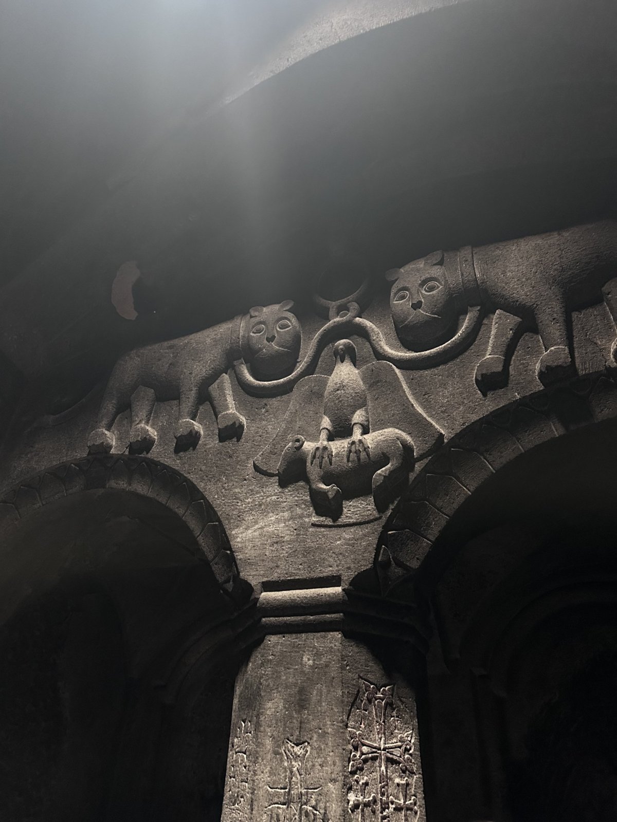 - Je to mistrovské dílo. Uvnitř je šero, vlhko a ticho, které přerušuje jen kapání vody nebo šeptání modliteb. Kamenné kříže (chačkary) vytesané s neuvěřitelným detailem jsou rozeseté všude kolem. Tady pochopíte, proč jsou Arméni tak hrdí na svou víru – ty stavby vypadají, že tu budou stát další tisíc let, bez ohledu na to, co se děje v údolí.