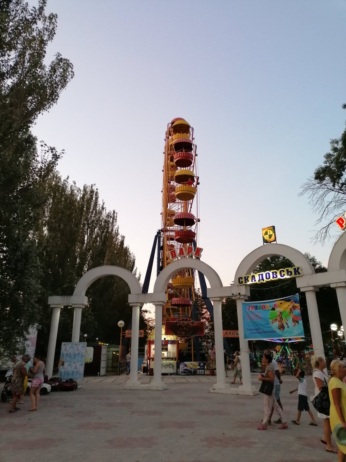 A tak jsme si po delší cestě, doprovázené koupí chmelového nápoje (při ceně 20 uah za kelímek se opravdu nedalo odolat) a pravého chersonského melounu zašli do hotelu v centru města, Admiral Nelson. Zařízení příjemné, jen bazén byl samonosný nadzemní Intex s neupevněnými schůdky, tedy přístup do něj ne úplně bezpečný. Navečer jsme se ještě vydali na obhlídku Skadovska, kdy jsme v drogerii Eva zjistili nepříjemnou skutečnost, že Revolut nám nic nevydá, ani nikomu nic nezaplatí. Zašli jsme do zábavního parku na echt ruské kolo, které jsme naposledy viděli značně zrezlé v Černobylu, jehož magnetka mi zdobí ledničku. Pak jsme si v místní vývařovně dali čeburek s masem a sýrem (skutečně moc dobré) a hovězí vývar s velkou dávkou masových pelmení.