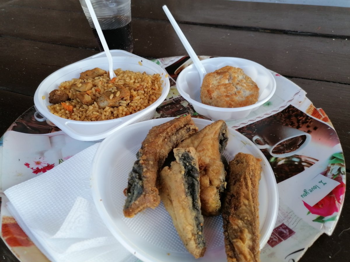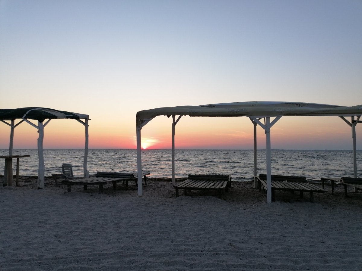 V pondělí 16.8. jsme posnídali v hotelu Admiral Nelson. Byť bazén nic moc, kvalita snídaně tento nedostatek vyvážila. Na švédském stole byly placičky ze sekaného masa, kyjevský kotlet, kousky masa, připomínající náš ovar, různé druhy závitků z baklažánů, lilků, rajčat, výběr byl opravdu bohatý. Chutnala mi mléčná kaše s krupicí, mnohem řidší, než jsem zvyklá připravovat a hodně oslazená medem. Vzhledem k tomu, jak malé množství peněz jsme vybrali a kolik už utratili bez možností platby kartou, začalo hledání nějakého bankomatu, který nám finance vydá. Asi na popáté vybráno 5 tis. hřiven z karty mBank. Předtím buď přímo odmítnuto, nebo ATM nefungoval, nebo chtěl 150 uah poplatek. Jakmile jsme měli dostatek peněz, šli jsme k přístavišti a chtěli rezervovat loď. Ta na maják byla beznadějně plná. Tak jsme přešli k dalšímu molu, ze kterého jsme chvíli před polednem vyrazili na ostrov Dzharylhach, do hluboké zátoky. Cesta stála 170 uah, ale my jsme zvolili variantu s možností přespání za 250 uah. Paní u lodí nám zavolala na ostrov s tím, že nám rezervovala stan (palatku) za cenu 400 uah. Asi za 15 minut už jsme přistávali na Dzharylhachi. Ubytovali jsme se a šli na oběd, kde jsme si dali smaženého rejnoka a dzharylhachskou uchu. Pivo bylo na ostrově trochu dražší, než na pevnině (40 uah), zohledňující zvýšené náklady na přepravu a chlazení (není tam el., vše jen na generátor). K dispozici je možnost nabití telefonu za 30 uah a je k dispozici i pitná voda. U kempu je jeden záchod tureckého typu, který byl sice navečer již značně znečištěn, ale brzy ráno obsluha zafungovala a bylo uklizeno). Asi 200 metrů od kempu je další občerstvovací místo, kde mají pivo levnější, za 35 hřiven. Při jeho koupi barman vytáhl z lednice mísu krevet s očima, ať že si vezmu. Chvíli jsem na to koukala, kreveta na mě, barman taky, proč že si neberu. Nevěděla jsem do nedávna, že nasolená kreveta je místním široce konzumovaným zákuskem k pivu. Z ostrova chvíli před 18 hodinou vypadnou všichni turisté, kteří přijeli jen na den, a pak je krásný klid. Ze stanu jsme pozorovali západ slunce, po němž jsme za chvíli ocenili přidělené deky, protože u moře fouká.