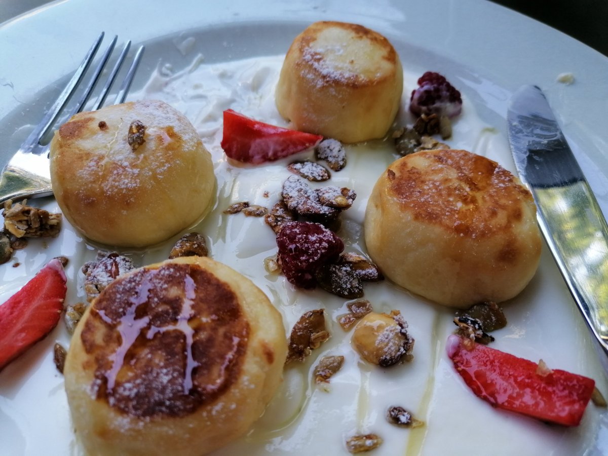 V sobotu 21.8. jsme chvíli před 7 hodinou posnídali ještě v Lazurném několik zakoupených různobarevných čurčchel, vypila jsem v rámci jízdenky zakoupenou kávu a pak už jsme vysedali opět tam, kde jsme před více než týdnem nasedali, tedy na kyjevském nádraží v již mnohem více ukrajinskofonním prostředí v západním stylu, kde se člověk domluví i anglicky. U moře jsem nezaznamenala místa, kde by byla možná komunikace jinak, než rusky, tedy jsem byla ráda za výuku paní soudružky učitelky Slatkovské ze ZŠ Antonínská. Přejeli jsme metrem na Kreschatyk, který byl s ohledem na blížící se oslavy 30.výročí nezávislosti Ukrajiny vyzdoben a tam, kde jsou fontány, byly tribuny. Zašli jsme na první snídani do Puzaty Chaty, pak jsme se chvíli prošli, abychom vytrávili a zašli známou cestou do Chicken Kyiv na místní snídani. Kromě waflí se slaninou a sýrovou omáčkou, vaječnou omeletou s hedvábně našlehaným bílkem a omáčkou s kaviárem, pomazánkami s čerstvým chlebem, jsme dále posnídali i sirniki s ovocem, vlašskými ořechy, medem a tvarohem. K tomu sklenku šampaňského. Vzhledem k tomu, kolik jsme na naší cestě potkali medúz, přivítali jsme jejich expozici na Maidanu. V Aroma káva jsem si dala kávový koktejl s černým rybízem, doteď nevím, jestli to bylo chutné, či ne. Přejeli jsme metrem na zastávku Hidropark. Lodičkou, která vypadala, že se každou chvíli potopí, jsme přejeli na protější břeh řeky Dněpr s písečnou čistější pláží, kde jsme se chvíli slunili a koupali v řece. Pak jsme se stejnou cestou vrátili. Chtěli jsme zajít do naší oblíbené gruzínské restaurace Kvevri, ta však kvůli koronaviru zavřela krám a (snad) zbyla ještě jedna ve městě. Tak jsme zašli ještě na ostrově na šašlik, metrem se pak přesunuli na nádraží, kde jsme v Menya Musashi naše ukrajinské hodování zakončili XL ramenem. Taxíkem jsme přejeli k hotelu Arcobaleno a usnuli.