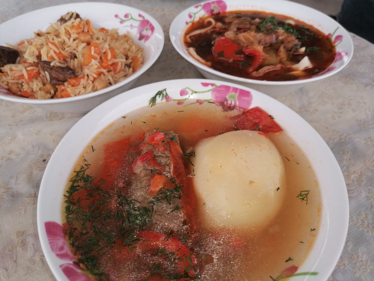 Ve středu 18.8. jsme tedy po zaplavání v bazénu vyrazili, tentokrát už opravdu do Lazurného. V místní cukrárně jsme si nakoupili pár zákusků, výborný meruňkový s tvarohem, čokoládový s několika druhy náplně. Paní prodavačka neustále vychvalovala své zboží a popisovala náplně. I když v ruštině mám, co se týče jídla, relativně slušnou slovní zásobu, na toto jsme nestačila. Asi po necelé hodině jsme přijeli do Lazurného. Obhlédli jsme si místní trh, kterému před pláží vévodí několik stánků s uzbeckou kuchyní, z níž mě kromě známého plovu obzvlášť chutnala polévka lagman (silný hovězí vývar s kořením a kulatými nudlemi).