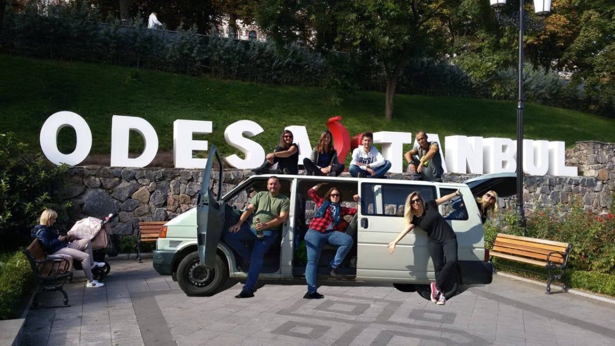 Před polednem vystoupíme u raketovky a děcka jdou na prohlídku a odpálit si raketu na USA. Kdo nechtěl, relaxuje na dece u auta. Pak společná fotka a hurá do Oděsy. Jenže cesta se zdála lepší v květnu. Nebo je to tím, že nám háže zadek. Představte si malinkou loďku v obrovských vlnách. Ale na kolech. V našem případě. Řidič není výjimkou - aj za volantem se houpe žaludek :D . Jet tudy naší Kateřinkou někdo s kocovinou, tak nevim nevim. Cestou se podaří najít servis, tak projistotu měníme hadičku, aby vydržela dýl. Pán mě ujišťuje, že vydrží než budu šedivá (kontroluju vlasy, pro jistotu :D). A taky si zkoušim smlouvat - tady už se točí velké peníze - ač snad nejzapadlejší servis, tak se jede za eura. Ale povedlo se usmlouvat na třetinu. Hurá, už je vše v cajku! :) ...až na to houpání...