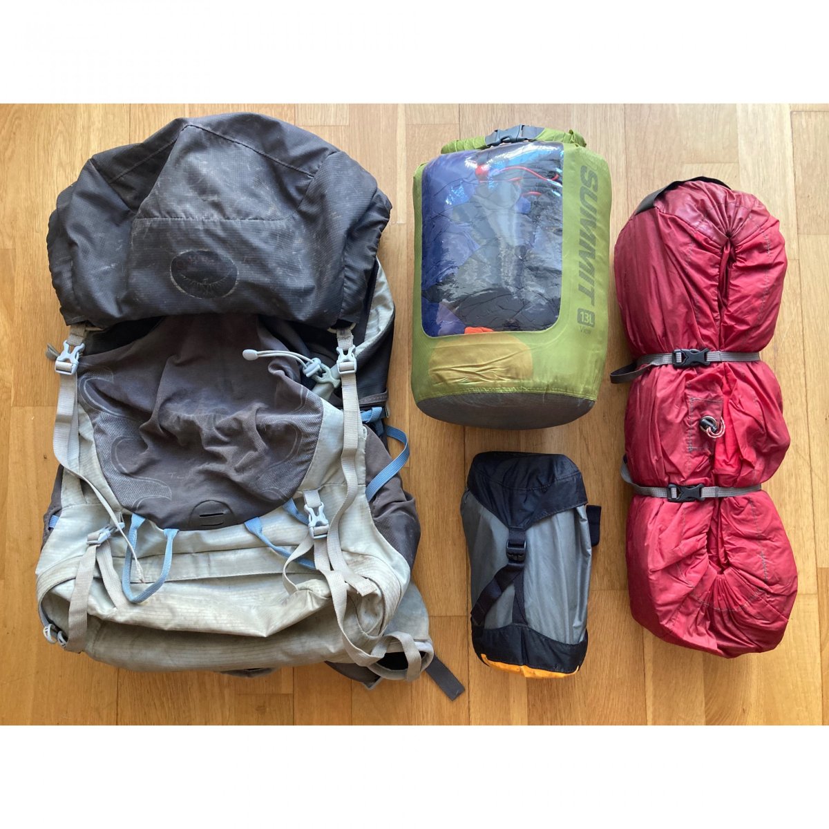 - batoh pouzivam HMG 3400 Southwest, je sice drahy, ale za mna perfektny... ma 55 litrov a cca 900 gramov... perfektne sa nosi a ani pocas tury v celodennom dazdi vobec nepremokol...
