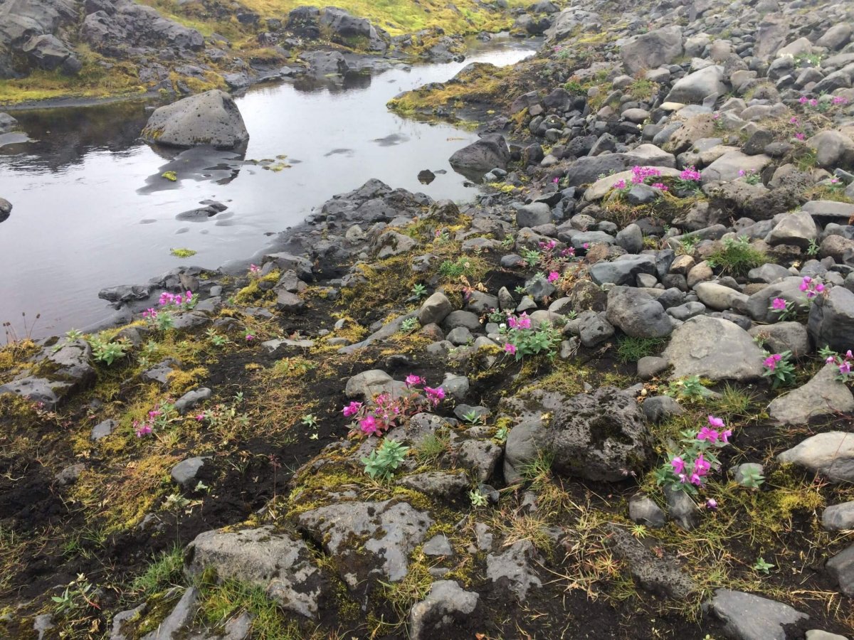 Po nějakých 500 metrech opravdu pršet začalo, ale žádná bouřka to nebyla, spíše takové nepříjemné mrholení, které sice nebylo silné, ale přinášelo s sebou chlad, a co víc.. vydrželo až do noci. Potom se navíc změnil povrch, takže místo po ušlapané trávě jsem teď šel, po ostrých kamenech, které byly opravdu všude, kam jsem dohlédl. Kousek před mým prvním stanovištěm mě poprvé (a naštěstí naposled) chytly křeče do stehen a každým krokem to bylo horší a horší. Sedl jsem nachvilku na kámen a v duchu jsem se modlil, aby to přešlo, protože takhle bych opravdu pokračovat nemohl. Po pěti minutách jsem vstal a vše se zdálo být ok, jako kdybych žádné křeče předtím vůbec neměl a do konce mého výletu na Islandu jsem už žádné nezažil. Oddychnul jsem si a pokračoval dál.