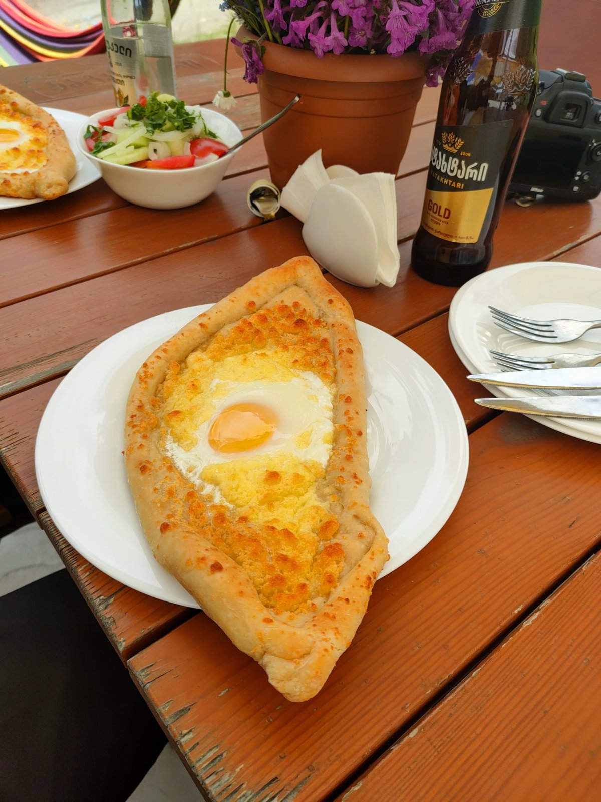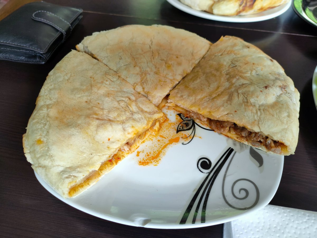 Je čas oběda, zastavuji u malé hospůdky Cafe Taso s výhledem na přehradu Enguri. Dáváme si typické Gruzínské jídlo, kubdari, chačapuri, salát z okurek a rajčat a domácí šťávu ze zavařených třešní. Jsme tu sami, jídlo opravdu chutné a porce které nejdou ani sníst, bereme si litr Coke na cestu, platím s dýškem 60 GEL a vyrážíme dál.