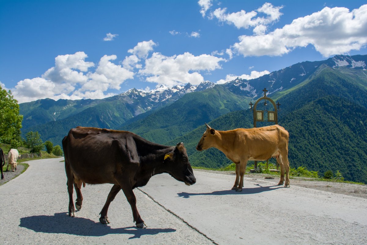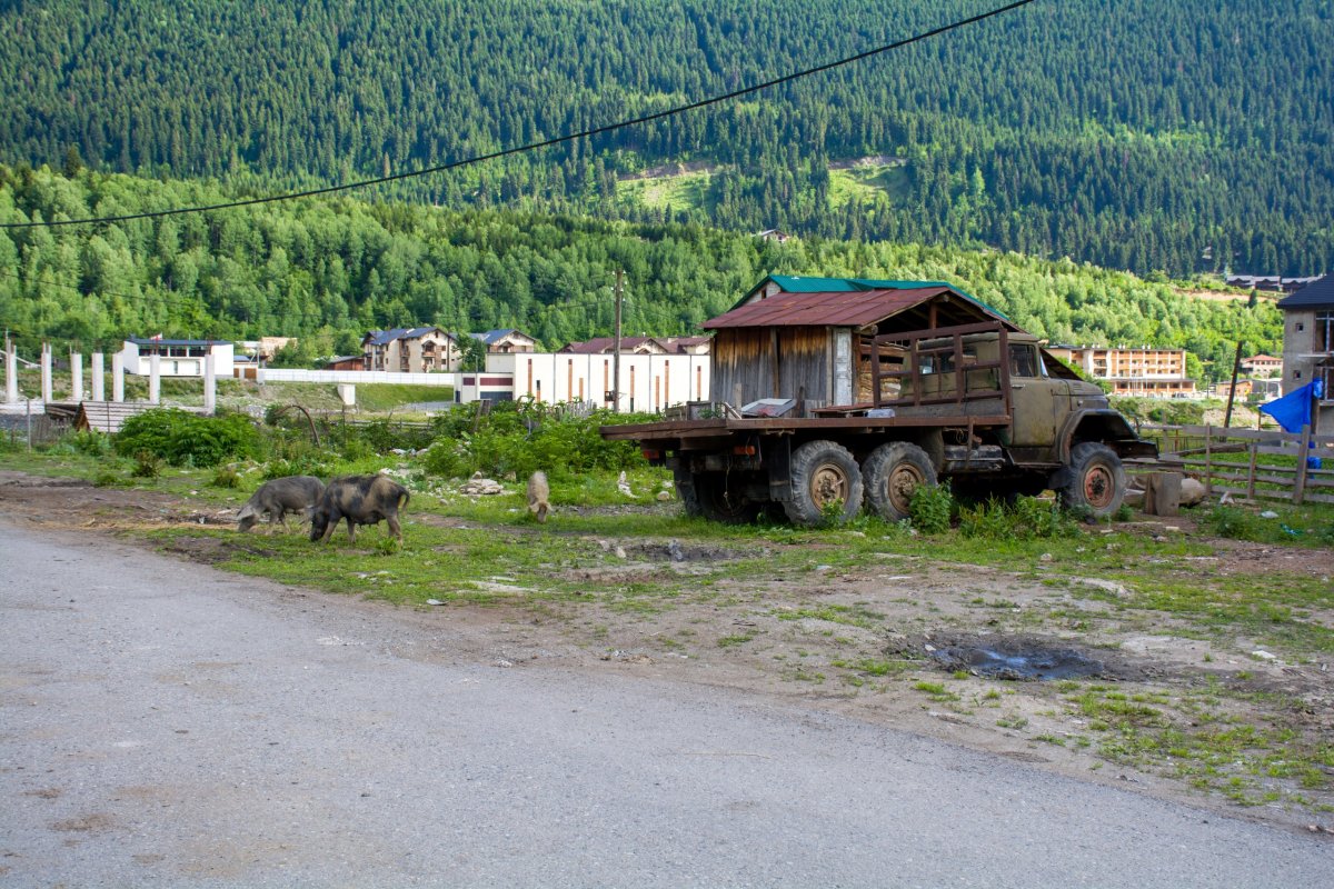 Je neděle 3.7. ráno a my vstáváme na hotelu Ponte v Kutaisi. Moc se nám nechce, šli jsme spát snad ve dvě ráno, letadlo mělo hodinu zpoždění, dlouhá řada na SIM, zdrželi jsme se. Za chvilku mi přijde na WhatsApp zpráva s fotkou hotelu, jdu na balkon a stojí tam řidič s autem. Vycházím ven a přebírám si ho, je to rychlé, spočívá to ve vyfocení stavu paliva a to je všechno, auto má plnou pojistku. Nejvíc nás zdrží, když se mi iniciativě snaží ukázat elektrickou ruční brzdu, kterou neznám. Po prvním zatažení se ozvou divné zvuky a zpátky ni krok, vleze vzadu pod auto, do něčeho kopne a dobré. Nemám to prý dělat, stačí dát páku do P, moc se mi to nezdá u domu stojím trochu z kopce, jednou jsem zapomněl dát ruční brzdu a pak to z P pomalu nešlo vytrhnout, ale budiž. Měl jsem objednáno Subaru XV a dostal Subaru Outback, což mi nevadí, je to větší, starší a ze všech stran odřené, pohnutý přední nárazník, aspoň nebude problém s případným škrábancem navíc. Po snídani vyrážíme, napřed do města do směnárny a pak směr Mestia. Před námi 225 kilometrů a navigace ukazuje 5 hodin cesty, což se mi zdá hodně, ovšem jsem v Gruzii poprvé. Snažím se dodržovat rychlost, ale pořád se mi zdá, že auto jede nějak rychle, je to 2,5 litru benzín, stačí trochu přidat a jede to. Po chvíli zjišťuji, že tachometr je v mílích, tak to bude ta rychlost. Cesta vede přes vesnice kde je šedesát, spousty retardérů s třicítkou, vleče se to. Pro středoevropana je udivující spousta krav na cestě, jsou v podstatě všude, za zatáčkou, za horizontem, člověk musí být stále ve střehu. Prasata jsou ukázněná, chodí po kraji a vesměs se rochní v bahně ve škarpě v noci pršelo. Silnice v nížinách je ucházející sem tam velké díry, ale jde to. V horách je to horší, občas kde je sesuv cesta zmizí, různě se to objíždí po šotolině(pochopitelně bez jakéhokoliv značení), ale pořád to zvládají i normální osobáky.