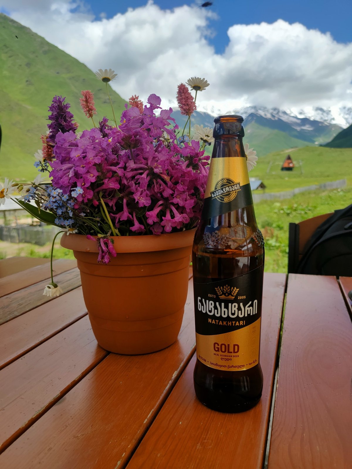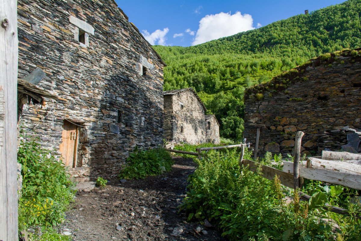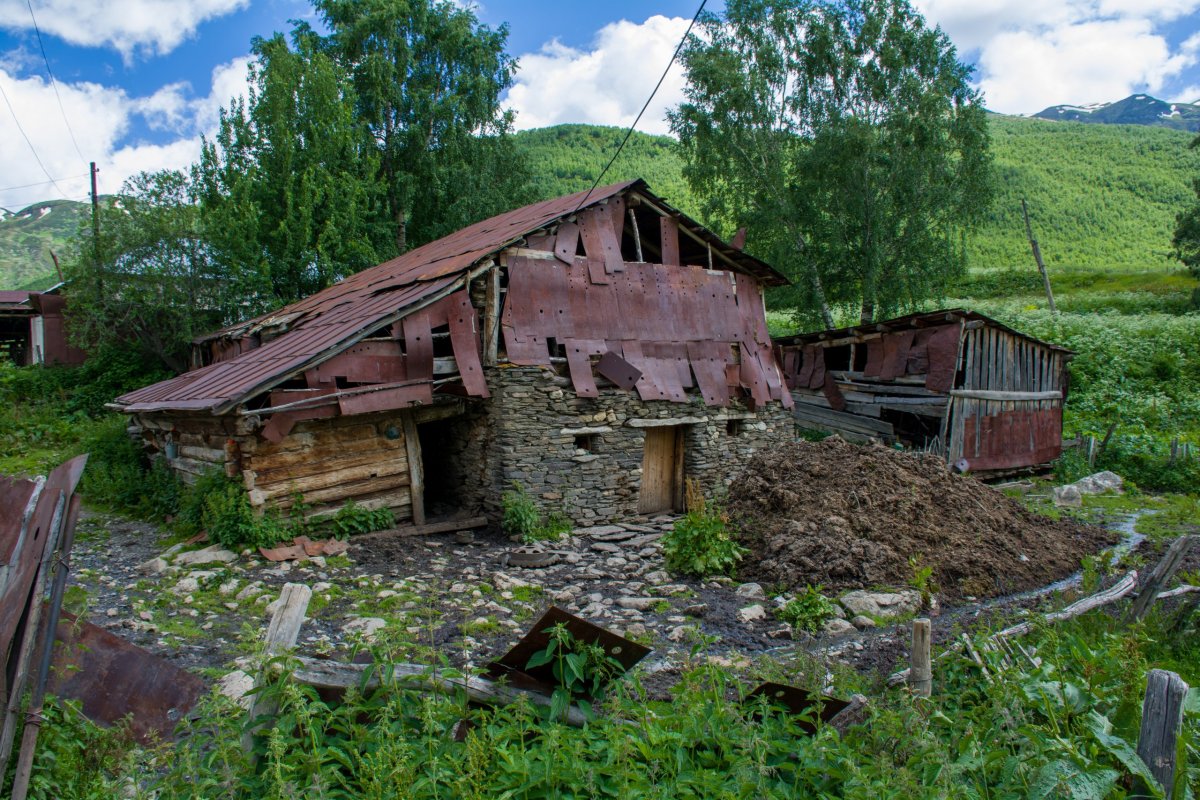 Po obědě se vydáme cestou k ledovci, kocháme se přírodou, koně, krávy a všude spousta potoků. Asi po dvou kilometrech se otáčíme a jdeme do vesnice u lyžařského vleku potkáváme sedm chlapů, zpívají si a pijí víno z kanystru, nabízí nám, ale nemáme tu odvahu. Ve vesnici je to skutečně jako ve středověku, jen auta to kazí. Domy zchátralé, opravy mají stejný mustr jako v Mestii, cesty kamení a bahno, je potřeba dávat majzla na kravince. Vesnice je malá, procházíme si to za chvilku a pak objevujeme Cafe Svaneti, milá paní nás zve dovnitř a tak usedáme. Paní povídá, že ráno odjela skupina Čechů na motorkách, má u toho i penzion. Dáváme si kafe, čaj, domácí trnkové buchty a každý stakan domácího gruziňaku (bratr je prý specialista). Paní je rozená obchodnice, nabízí bylinné čaje, pletené čepice, rukavice a povídá a povídá. Lidé tam jezdí z celého světa a někteří se zdrží klidně i měsíc a chodí po horách. V zimě je víc turistů jak v létě, jezdí lyžovat. Loučíme se, platím 15 Lari a jdeme směr Chazhashi. Chceme do muzea, bohužel je v pondělí zavřeno, tak si procházíme tuto asi nejzachovalejší vesnici. Chci vylézt na skálu ke kostelíku a zničehonic vyjde z domu vedle ženská a začne gruzínsky hrozně řvát. Leknu se a rusky ji vysvětluji, že se chci jen podívat a udělat si pár fotek, jestli je to problém. Říká že můžeme klidně jít, ona volá na krávu, asi se prý zaběhla. Vracíme se do Murkmeli po levém břehu řeky, všude zase potůčky z hor, tráva je jako houba, člověk si musí dávat pozor kam šlape. Zapadající slunce nádherně osvěcuje Chazhashi, u penzionu je mostek a jsme v Murkmeli. Máme ještě čas, jdeme na obhlídku vesnice. Krávy se samy vrací z pastvy, tři ženy stojí u plotu v gumových holínkách po kotníky ve sračkách a povídají si, na cestě se rvou psi s býkem, opravdu středověk. Ob jeden dům od našeho desetiletý kluk dojí před domem krávu, ptám se ho, jestli si ho můžu vyfotit, rozumí zřejmě jen gruzínsky, raději odcházím. Je čas večeře, paní domu udělala boršč, kubdari, chačapuri, domácí sýr, salát a pan domácí dodal své víno. Po večeři jdeme spát, jsme unavení.