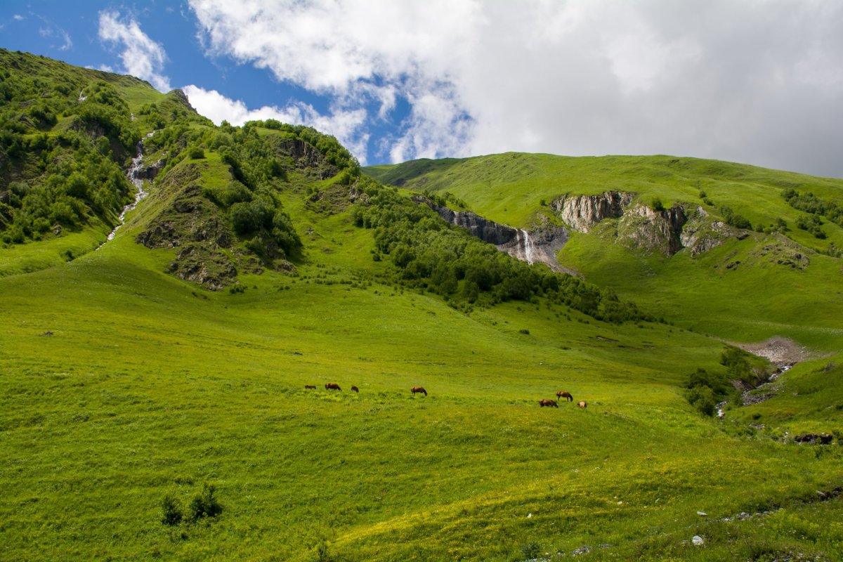 Snídani máme objednanou na osmou a vyrážíme k našemu hlavnímu cíli vesnici Ušguli. Tímto názvem je označen shluk několika malých vesnic, ležících cca 2300 m/nm a je uváděna jako nejvýše položená obydlená vesnice Evropy. Pro svůj středověký ráz a věžové domy je zapsáno na seznamu UNESCO. Cesta 43 kilometrů, 1,5 hodiny, ovšem dle toho co jsem četl cesta velmi špatná, proto ta čtyřkolka. Mám ještě jeden problém, na Agodě jsem si objednal penzion v Murkmeli, uvedená adresa na Google maps neexistuje a majitelka nekomunikuje. Říkám si, že se poptám na místě a když to nenajdeme, vezmu něco na místě. Jedeme, zpočátku cesta pěkná, asfalt, serpentiny nahoru, dolů, velké převýšení, krásný výhled. Po čase šotolina, posledních cca 7 km cesta dost špatná, obrovské sesuvy, všude tekoucí voda(posledních 14 dnů každý den pršelo), koleje jen pro jedno auto, vyhýbání si s protijedoucím je zajímavé, naštěstí ne tak časté. Nikdy jsem čtyřkolku neřídil, Subaru se brání statečně, ani při průjezdech řečištěm, na mokrých kamenech nehrabalo. Když člověk objíždí mnoha tunové balvany a nad ním jsou ve značně zerodovaném kopci další, jde z toho strach, přítelkyně sedí jako na trní a ptá se, jestli nepojedeme zpátky. Když vidím dodávky Maršrutky, co nás míjí, jsem přesvědčený, že to dokážeme taky a taky že jo kolem desáté přijíždíme do Murkmeli! Ve vesnici je cesta už jen směs ztuhlého bahna a kravského trusu, koleje, skoro dřeme o břicho. Po pravé straně sedí na zídce tři strejdové a probírají zřejmě nějaké chlapské problémy, zastavuji a z okénka se rusky ptám na penzion Eno Grand. Jeden ochotně vstává a vede nás, je to padesát metrů a on je bratr majitele, bingo. Vychází starší pár a ujímá se nás o rezervaci nic neví, ale mají volno, ráno odjelo pět Čechů, pokoj jenom stačí uklidit. Pán se rozpovídá, žijí v Tbilisi a tady tráví léto, narodil se tu a vyrostl. Ukazuje nám starý kamenný dům i s věží který začíná rekonstruovat. Vysvětluje nám, že teď je jen jedna cedule Ušguli, ale dřív to tak nebylo, byli samostatní. V Murkmeli je hodně domů opuštěných a bez střech, v roce 1989 napadlo 5 metrů sněhu, na protějším kopci se utrhla lavina a zasypala vesnici. Několik lidí zemřelo, pobořilo to domy no a lidé odešli. V celém Ušguli teď žije natrvalo kolem 60 lidí, když jsem se ptal co dělají, čím se živí? Odpověděl, že chlapi nedělají nic, většinou jen pijí a ženy pole, krávy a hodně turismus. Poradí nám kam se vydat, na osmou si objednáme večeři a vyrážíme. Včera i dnes polojasno, bez deště, ani bundy si nebereme, je relativně teplo. Do Ušguli je to kousek, po cestě míjíme stádo koní a přicházíme na most přes řeku Enguri, je to centrum veškerého dění. Zatáčíme doprava k hradu královny Tamary, odkud se dělají ikonické fotky. Chvilku čekáme na světlo až přejde mrak a přichází mladý pár. Anglicky se ptáme jestli chtějí vyfotit spolu a odkud jsou. Velmi neochotně odpovídají, že jsou Rusi, vyfotit jo, ale nějak se nebaví. Rusky se ptám odkud a tedy z Moskvy, odvětvím že Moskvu znám, pracoval jsem nedaleko (Зеленоградский), ledy trochu povolí, ale do řeči jim není. Ani se jim moc nedivím, v Mestii jsme viděli nápisy - Rusy neobsluhujeme, bohužel realita dnešních dní. Pokračujeme dál po cestě okolo vesnice až ke Cafe Shumeri, kde si dáme oběd. Sedí se venku, výhled jako z fotek cestovních kanceláří, všechno tak zelené až přechází zrak.