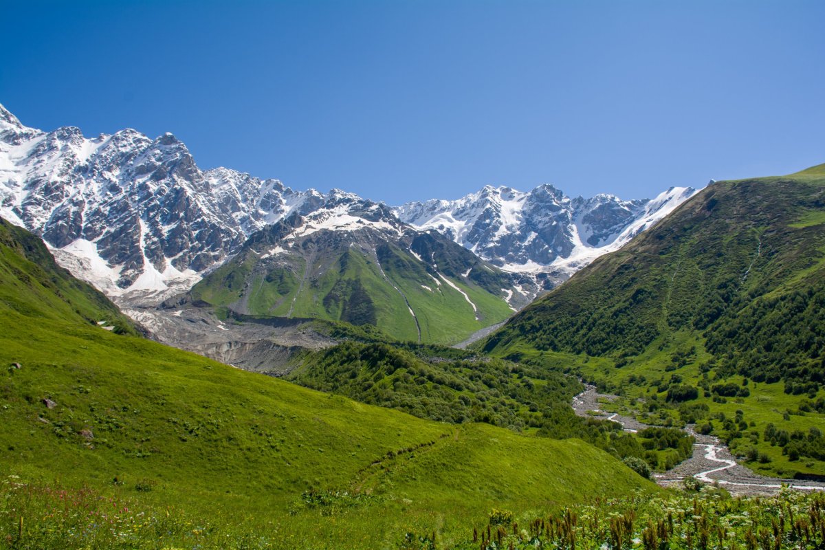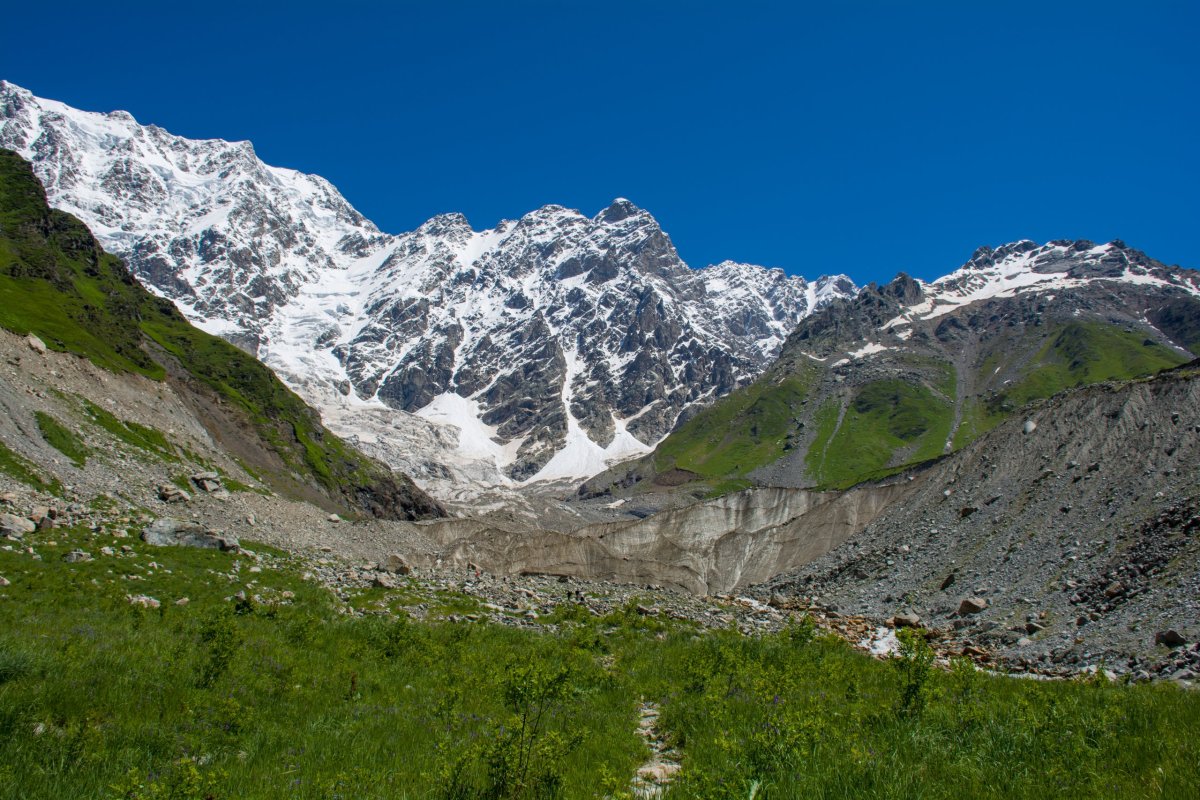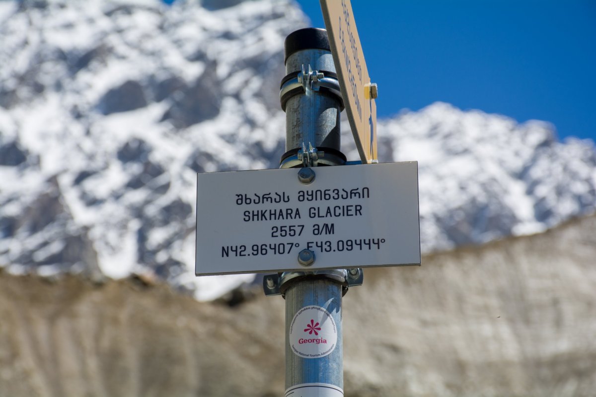Míříme na ledovec Shkhara, je to 9,5 km, sedm se dá autem a zbytek pěšky. Dá se to jít pěšky celé, ale nemáme tolik času. Cesta je ta samá po které jsme šli včera, ale čím dál jedeme tím je to horší, od vody vymleté koryta přes cestu, občas projíždíme vyschlým korytem plným valounů, kterým se nedá vyhnout. Někdy se cesta rozdělí na několik, stačí si vybrat tu správnou, nevěřím, že se to dá projet autem. Přijíždíme k místu kde si potok, řeka prorazila koryto přes cestu, šířka šest metrů, hloubka odhadem minimálně 30 centimetrů, dravý proud. Podle všude přítomných stop od pneumatik je jasné, že tudy auta jezdí, říkám si, projedu to taky. Opatrně vjíždím do vody, auto zastavuje a hrabe, proud opravdu silný. Zmatkuji přidám plyn auto se chytne a vyrazí vpřed, naráz, výskok a jsme na druhém břehu. Ze předu pára, něčím dřeme o zem, krve by se ve mě nedořezal. Vystupuji a jdu se podívat, co se děje. Břeh byl zřejmě ostrý, pod vodou to nebylo vidět a já chytil trochu spodkem předního nárazníku. Pára byla naštěstí jen od vody co stříkla na motor, dřeli jsme značkou, co na jedné straně upadla, nárazník byl trochu pohnutý. Značku přišroubuji klíčkem od auta, nárazník nakopu na místo a jedeme dál ještě opatrněji než před tím, bojím se. Valouny jsou všude, nedá se vyhnout, přijíždím k dalšímu brodu a odmítám jet dál, auto odstavuji do křoví a pokračujeme pěšky. Jsme bez signálu, za celou dobu jsme potkali jednoho chlapa na koni, dost hrdinství. Za cca 500 metrů přicházíme k místu kde se odstavují auta a dál už všichni po svých. Po pár set metrech přicházíme k rozdvojení a vybíráme si tu špatnou cestu, což zjistíme až po 1,5 km a 200 výškových metrech. Projít dál by se to možná dalo, ale v sedle je sníh, nevím na kolik je vespod odtátý a riskovat už dnes opravdu nebudu. Vracíme se a jdeme správnou pěšinou k ledovci, po chvilce potkáváme skupinu německých turistů. Ke konci je chůze velmi obtížná, skáčeme po kamenech jako kamzíci. Přicházíme k hraně ledovce, je obrovský, aspoň 20 metrů vysoký, široký daleko víc. Nemám z toho dobrý pocit, ledovec pracuje, neustále praská, padají kameny, drolí se led, fotíme se a jdeme nazpět. Přes řeku u odstavné plochy je otevřený Shkhara Glacier Restaurant, kde si dáme vychlazenou colu a vydáme se k autu. Při zpáteční cestě potkáme několik pěších a snad deset aut s turisty, už jsem trochu klidnější, kdyby něco, pomoc by byla. Přijíždíme k brodu, pocit nic moc, ale z druhé strany to jde úplně hladce a bez problému, oddechu si, to ještě nevím co mě čeká.
