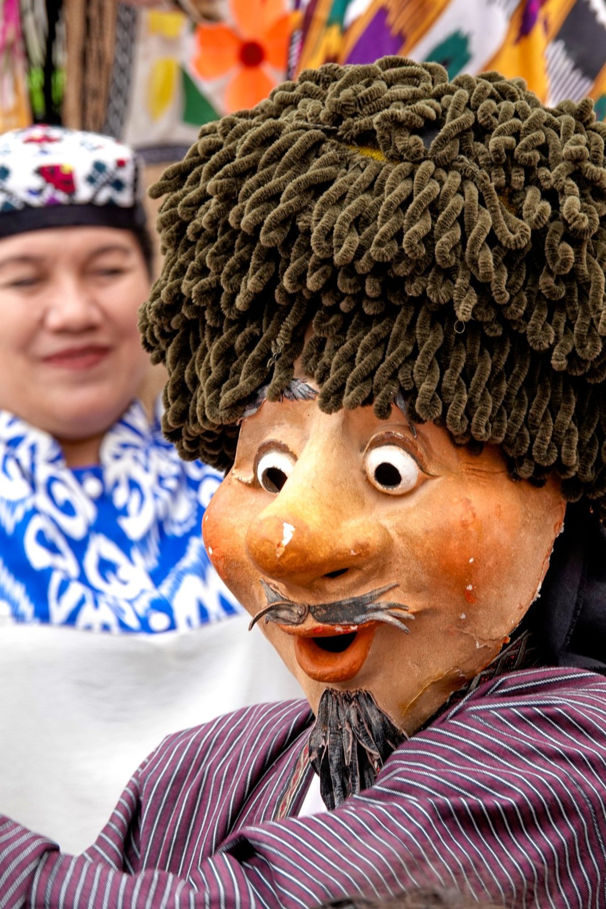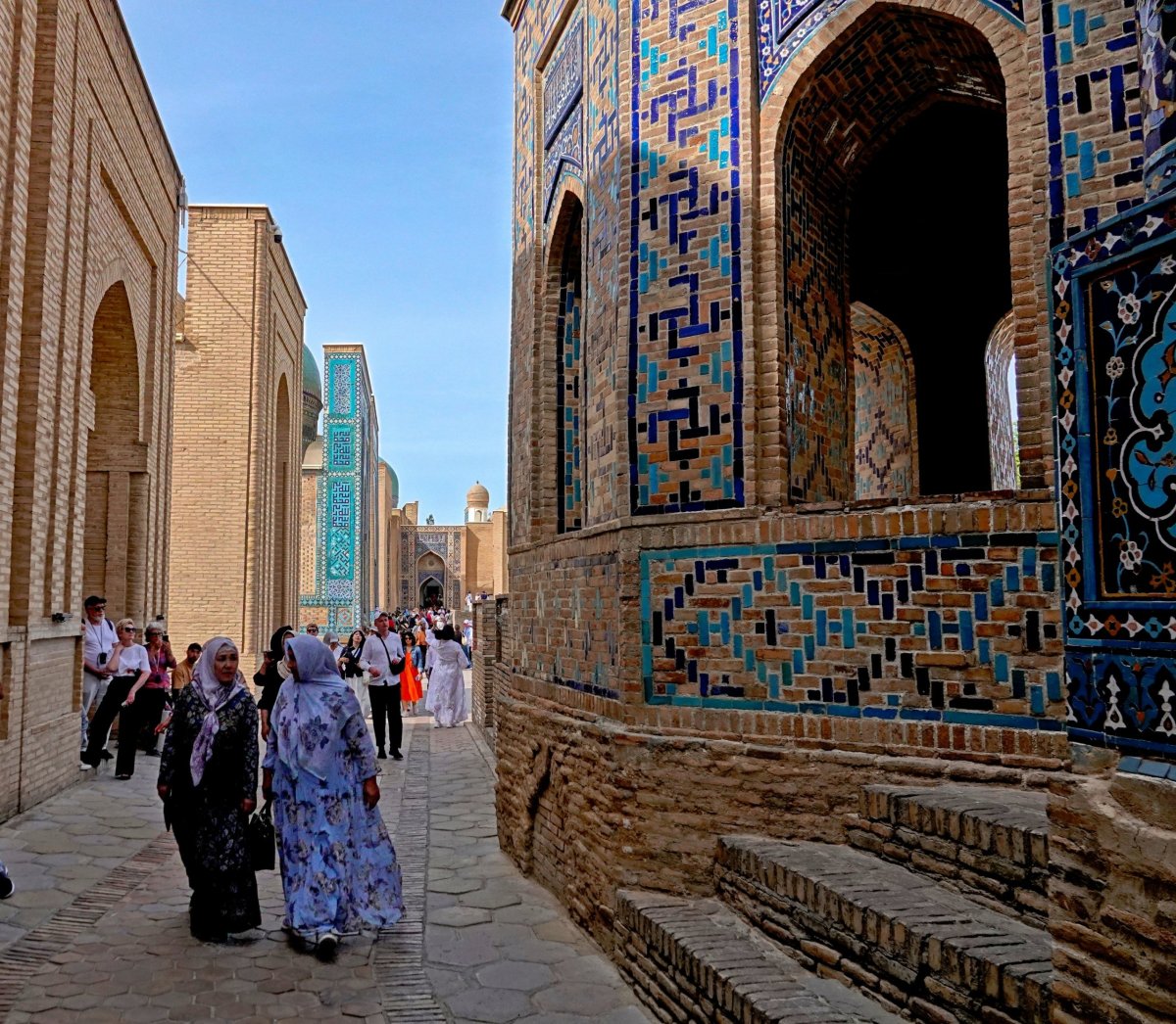 Druhý den se věnujeme památkám, které důsledně prokládáme jídlem a to zhruba v tomto pořadí: Snídaně v hotelu, banana šejk u Registánu, pirožky cestou z Gur-e-amir, nákup oříšků, chleba a sušeného ovoce na Siyeb bazaru, pilav se žlutou mrkví před mešitou Bibi Xonin, který završujeme sirníky (sýrové palačinky) a další pirožky cestou z komplexu Shahi Zinda. Pak už jen dojídáme oříšky a chleba na náměstí Registán a přitom čekáme na light show. Komplex je parádně nasvícen už od půl osmé, kdy zapadá slunce a v devět se pouští muzika a barevné variace. Večer parky příjemně ožívají, tu je improvizovaná diskotéka, vedle živý zpěv a jinde borci předvádí provazoskákání. To je jako provazochodectví s tím rozdílem, že týpek místo nudné chůze na laně dost akčně skáče. Do toho všude jezdí různorodé skupinky převážně místních na vtipných šlapohybech.