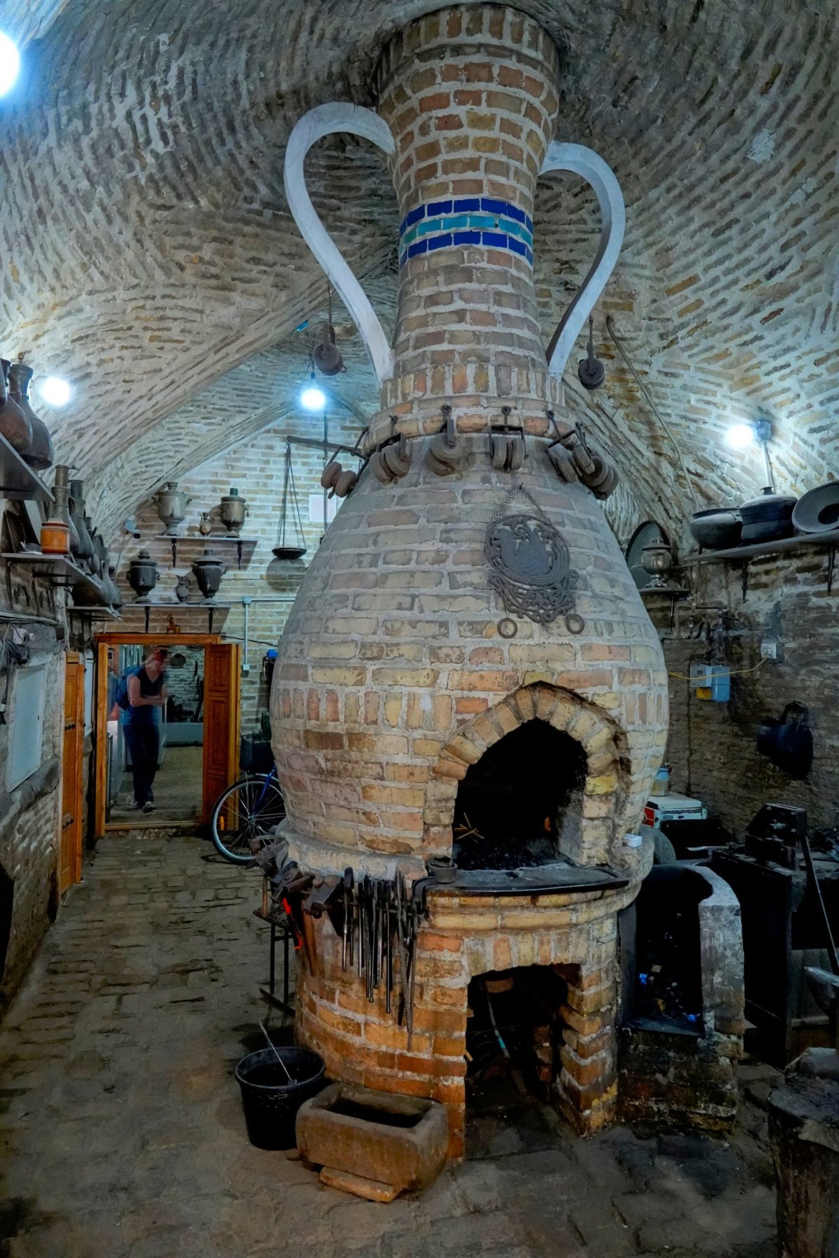 Zamluvil jsem kurz pečení chleba. Dostáváme ingredience a zaděláváme těsto, poté dostaneme druhé již vykynuté těsto a pokračujeme v tvarování a zdobení razítkováním. Do pece ho plácla paní raději sama, my jenom přihlížíme. Za pár vteřin se chleba nafukuje a my jej pak baštíme s dalším šálkem čaje. Opět vše prokládáme památkami a stále se točíme kolem krátkého minaretu. To je ta válcová modrá stavba, kterou fotím pořád dokola. Jedná se o nedostavěný minaret. Jiný minaret tu byl zase postaven za peníze, které místní hospodář obdržel na stavbu železnice. Už nevím, jak to dopadlo, když to prasklo.