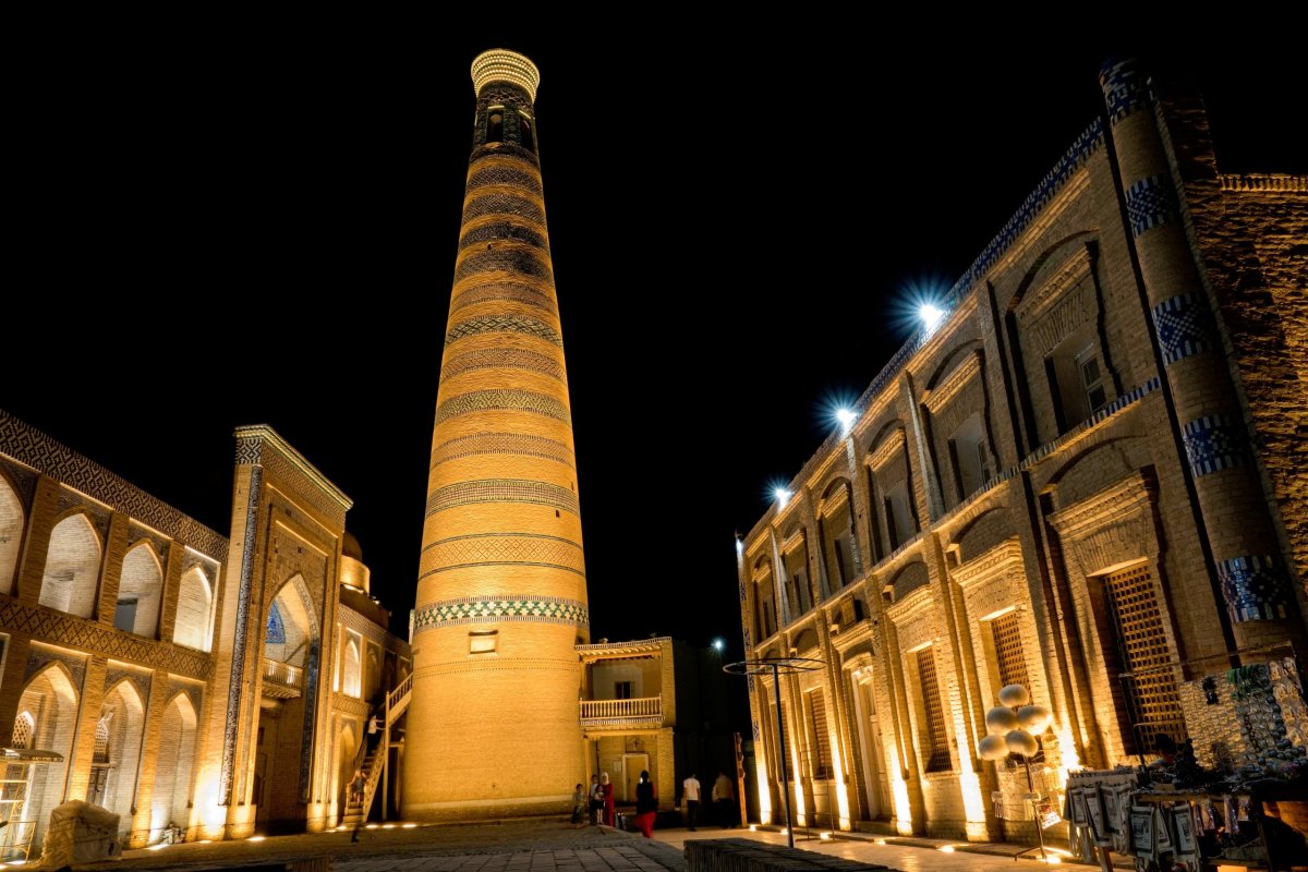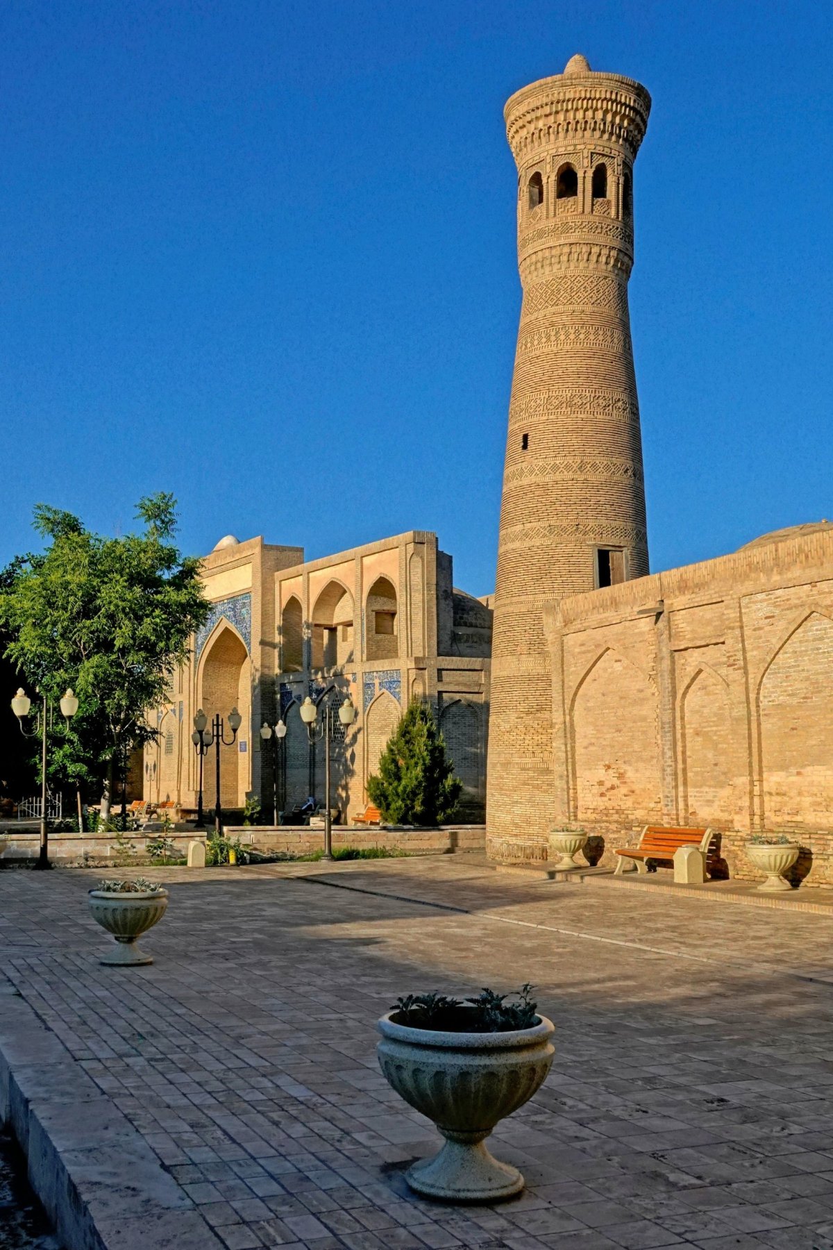 Večer trávíme na terase našeho hotelu, odkud je krásný výhled na velký minaret (Kalon minaret), který je fakt nádherný a vlastně mi v reálu připadá ještě hezčí než na fotkách a vůbec se nedivím pohádce o tom, jak svou krásou učaroval i samotnému Čingischánovi, a ten jej jako jedinou stavbu města nenechal zbourat. Škoda, že už se nemůže nahoru.