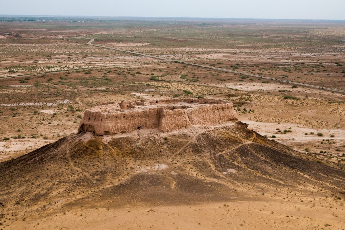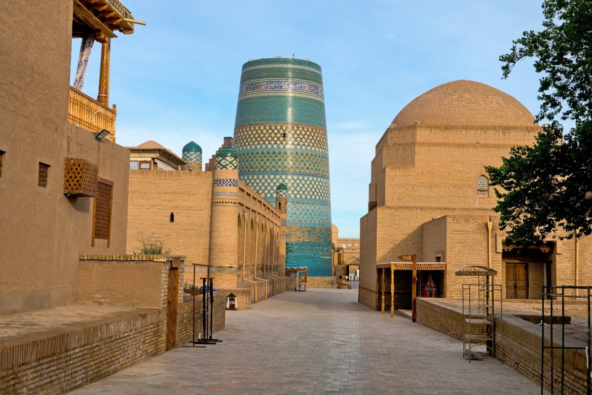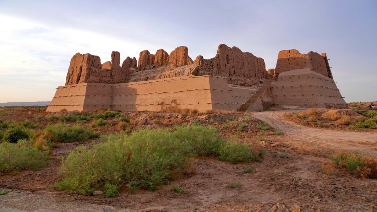 Odvoz do Khivy jsem domluvil v hotelu taxíkem. Vyzvedává nás přesně a razíme opět několik hodin pustinou. Taxík na celý den pro skupinu nás vyjde cca na 1600Kč. Tady už poušť zdaleka tolik nekvete. O to větší kontrast je mohutný tok řeky Amudarji, kterou občas potkáváme. Stavíme v luxusní turistické restauraci na oběd jako v nějakém novodobém karavanseraji. Ceny jsou překvapivě nízké a jídlo dobré. Pomalu si zvykáme na kopr v každé zelenině a vlastně nám to chutná. Řidič nabízí za malý příplatek zajížďku k pouštním hradům. Je mu jasné, že tam stejně chceme a tak šetříme budoucí kilometry i peníze a objíždíme hrady vpodvečer v klasickém pořadí Ayaz-kala – hezké místo v pustině, Toprak-kala – nicmoc, nakonec Kizil-kala – částečně zrekonstruovaný hrad u vesnice. Všude jsme sami. Večer za tmy přijíždíme do Khivy a ubytováváme v historickém hotelu v původní madrase uvnitř starého města Ičan Kala.