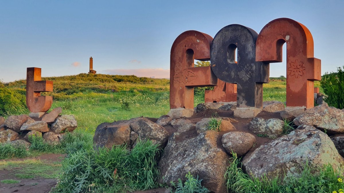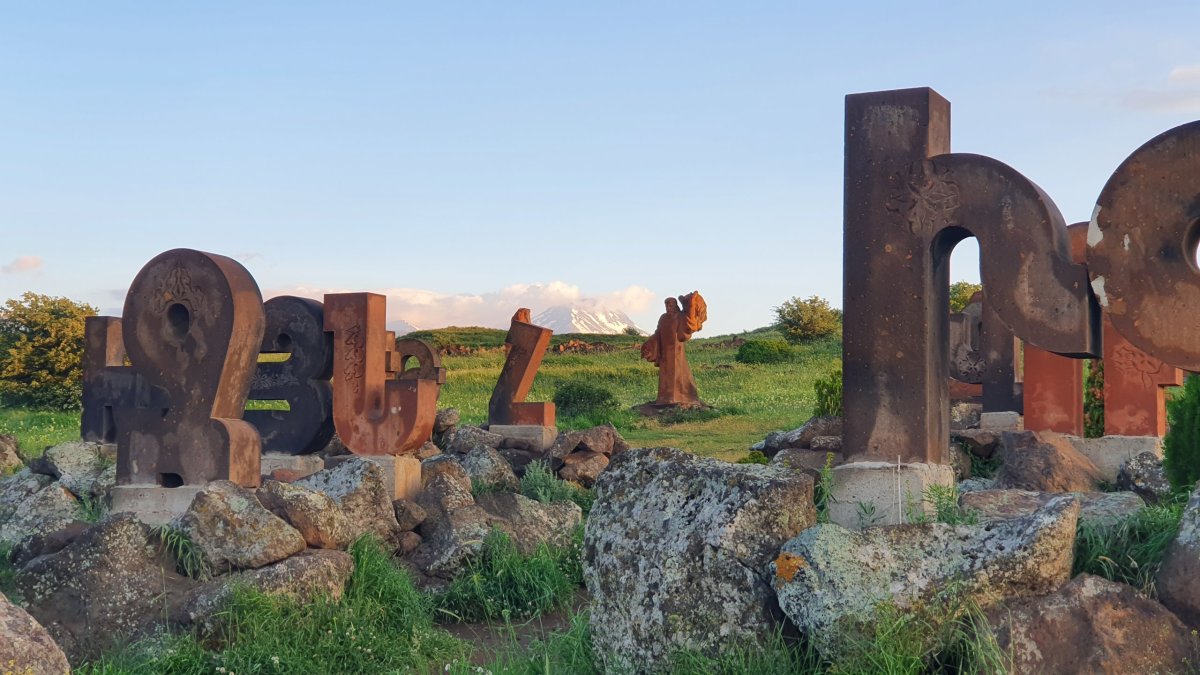Jedeme hodinu a půl autem k jezeru Kari, cestou navštěvujeme Památník arménské abecedy. Arménská abeceda je stará více než 1600 let, skládá se ze 39 písmen a dodnes se používá v původní podobě. Arméni jsou na ni patřičně hrdí.