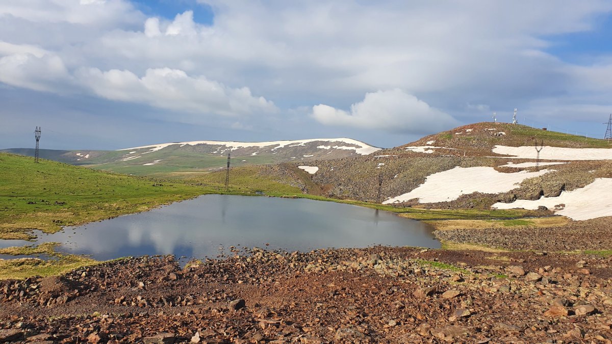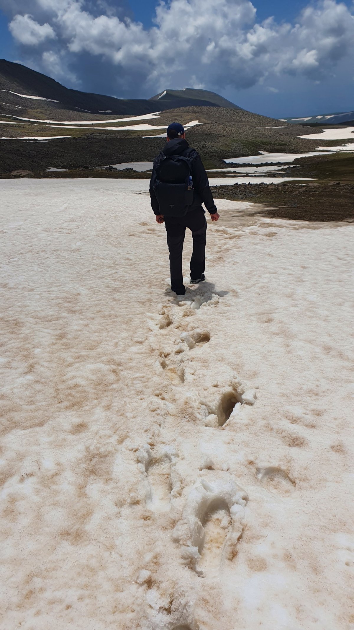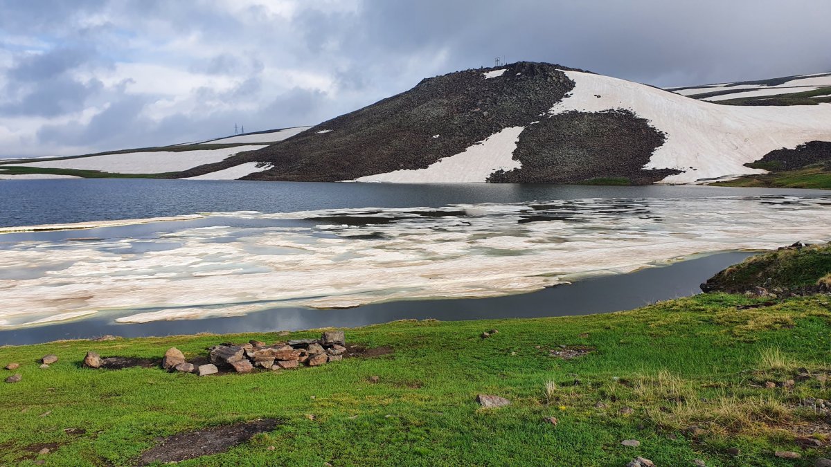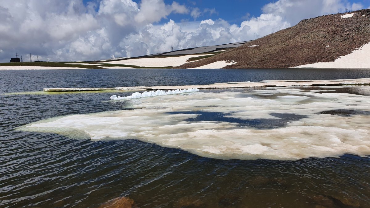 První jezero je ve výšce 3100 m. Tady někde se má kvůli aklimatizaci aspoň 1 noc před výstupem přespat, ale výškové nemoci se nebojíme. Přijíždíme k jezeru Kari (3200 m) a na parkovišti vidíme pouze 1 karavan a víc nic. Hm. Jak to? V červnu už tady má být spousta aut a lidí, co sem jedou přespat. Zaparkujeme a jdeme s jedním batohem k jezeru Kari. Naše nadšení z výstupu okamžitě opadlo. Na jezeře si klidně plave ledová kra! Co tady jako v červnu dělá? A ještě asi 2 metry tlustá? Podle fotek na Internetu tu už nic takového v červnu není! Koukám znovu do itineráře: „Hora Aragats lze vylézt pouze od června do září, kdy je tu minimum sněhu.“ Dnes je 15.6., ideální! Tak já to mám správně, jen to počasí se mým itinerářem neřídí.