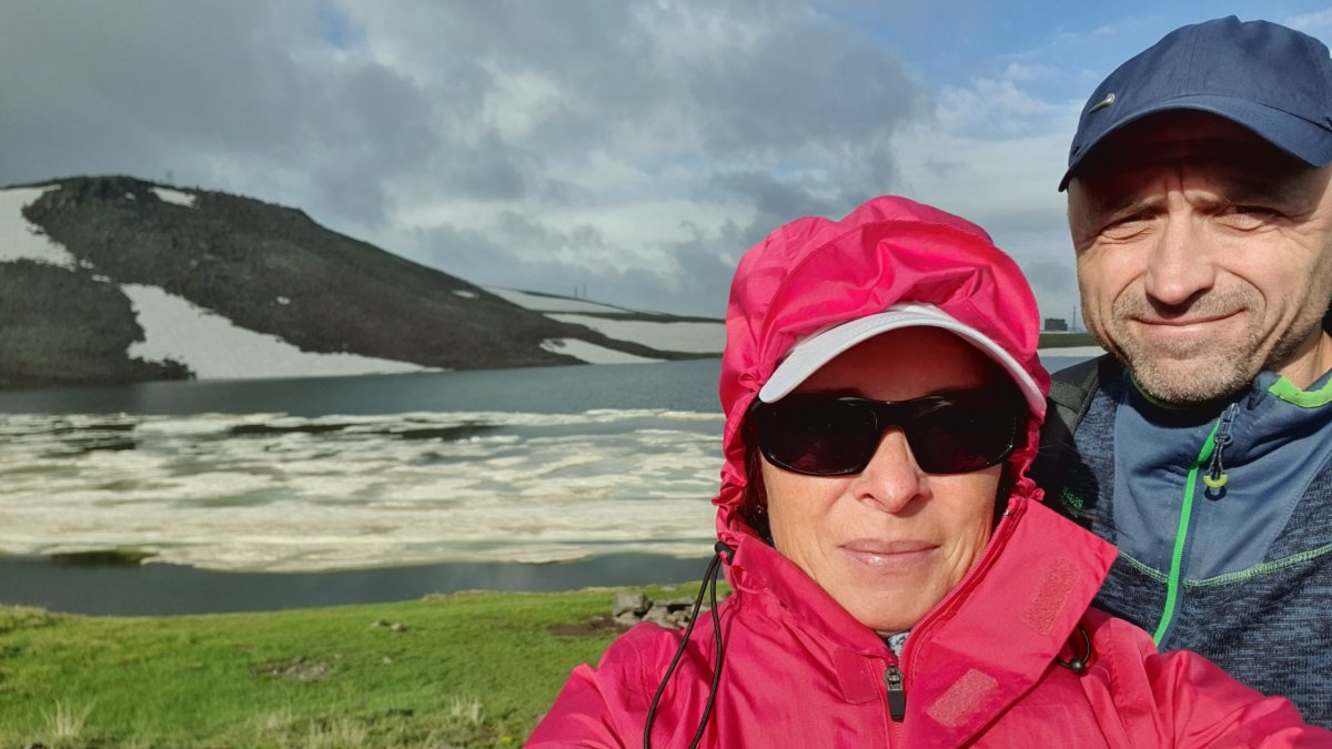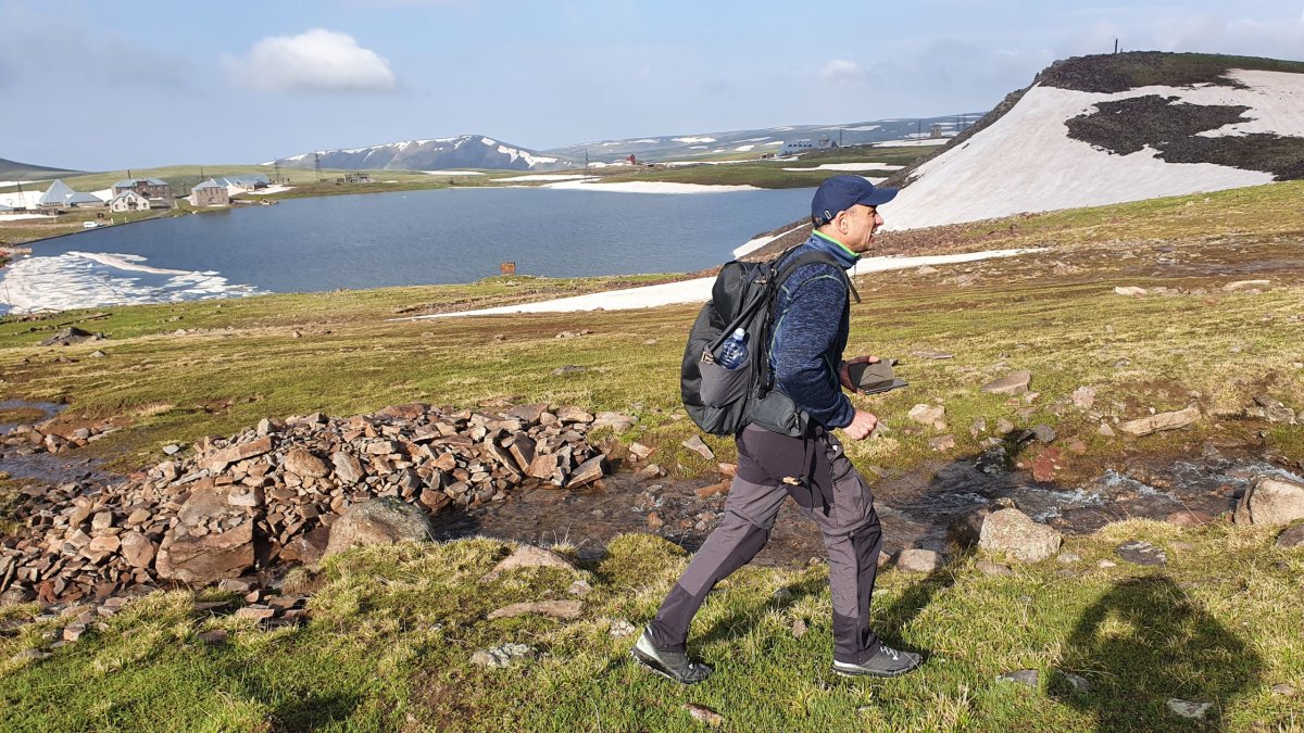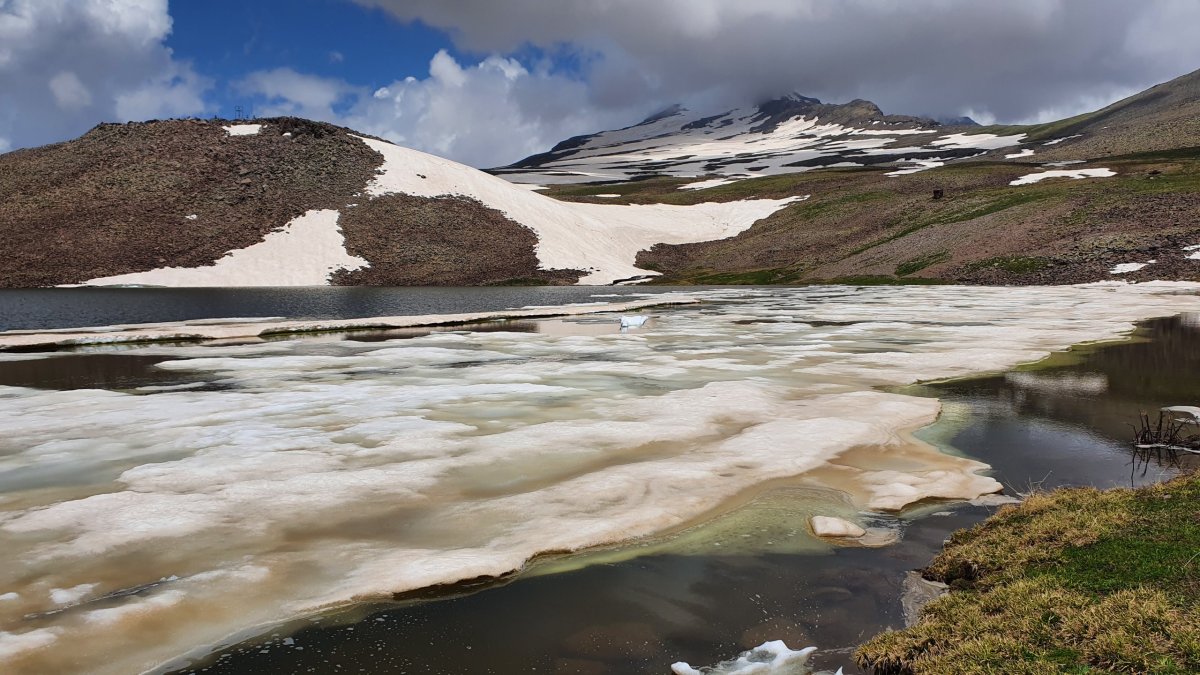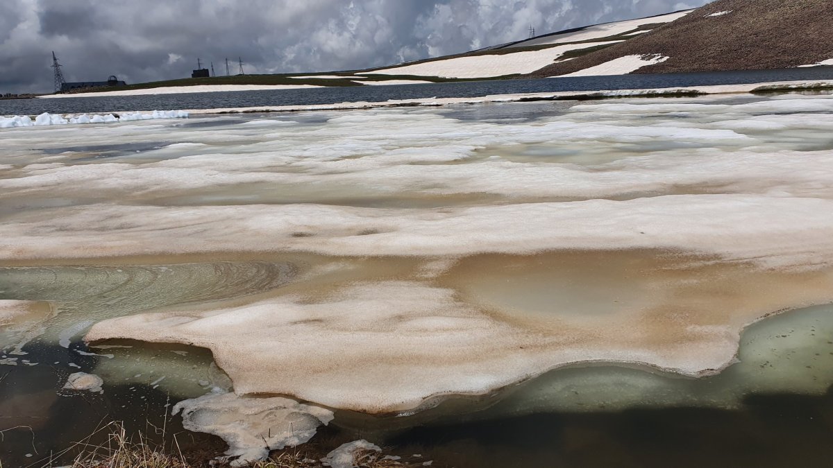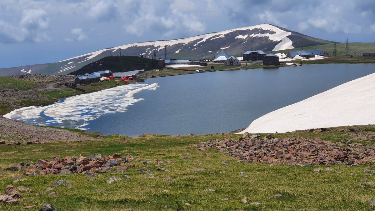 První jezero je ve výšce 3100 m. Tady někde se má kvůli aklimatizaci aspoň 1 noc před výstupem přespat, ale výškové nemoci se nebojíme. Přijíždíme k jezeru Kari (3200 m) a na parkovišti vidíme pouze 1 karavan a víc nic. Hm. Jak to? V červnu už tady má být spousta aut a lidí, co sem jedou přespat. Zaparkujeme a jdeme s jedním batohem k jezeru Kari. Naše nadšení z výstupu okamžitě opadlo. Na jezeře si klidně plave ledová kra! Co tady jako v červnu dělá? A ještě asi 2 metry tlustá? Podle fotek na Internetu tu už nic takového v červnu není! Koukám znovu do itineráře: „Hora Aragats lze vylézt pouze od června do září, kdy je tu minimum sněhu.“ Dnes je 15.6., ideální! Tak já to mám správně, jen to počasí se mým itinerářem neřídí.
