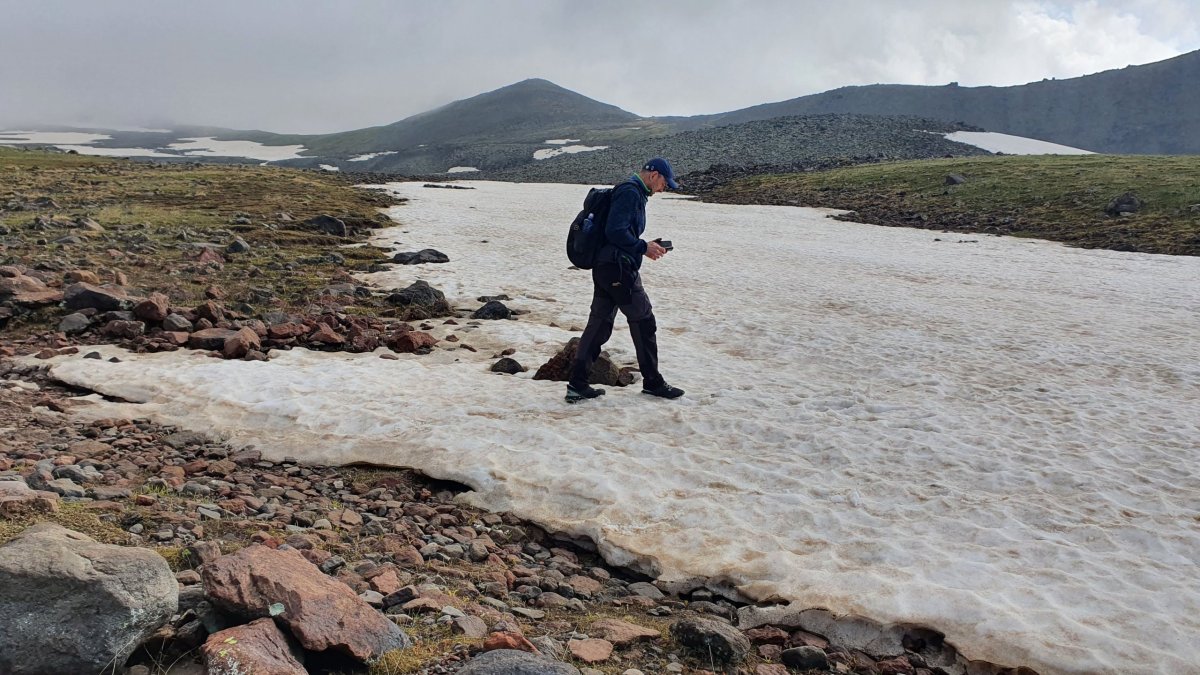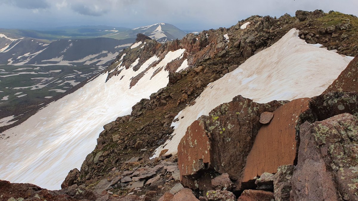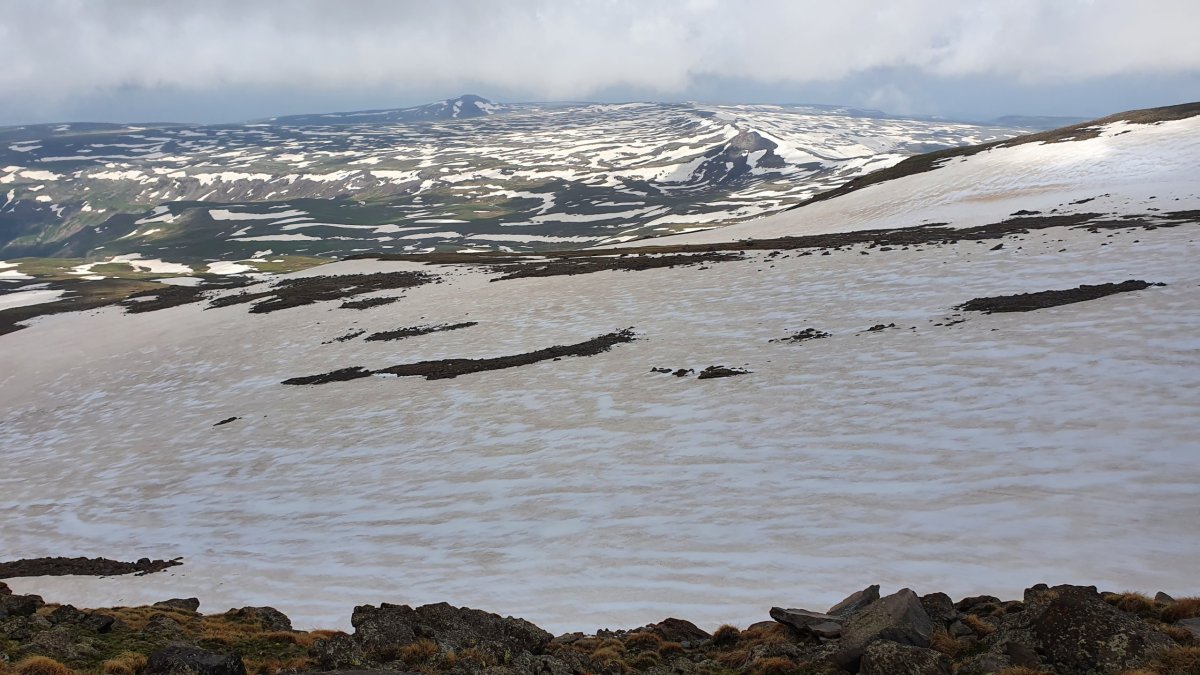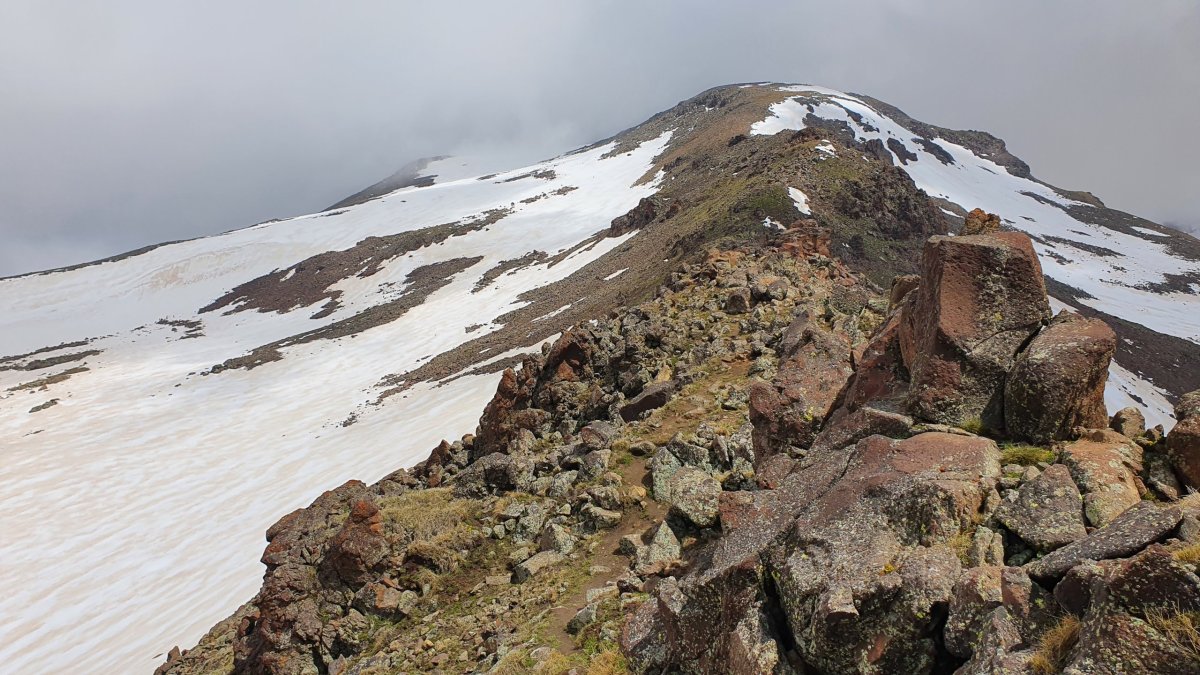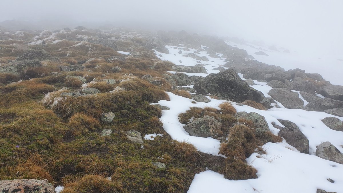 Cesta i počasí se kazí rychleji, než jsme čekali. Jdeme přímo do mraků. Všude kolem jen sníh a kameny a sníh a kameny. Na tohle nejsme připraveni. Ani oblečením, ani psychicky. Konečně nám dochází, že se nahoru na Aragats letos ještě nechodí, proto je parkoviště u jezera Kari prázdné a restaurace zavřená. Sněhové plotny jsou už ve výšce 3300 m a těžko se to bude zlepšovat. A ta široká oficiální cesta nahoru vede prostě letos v červnu ještě sněhem.