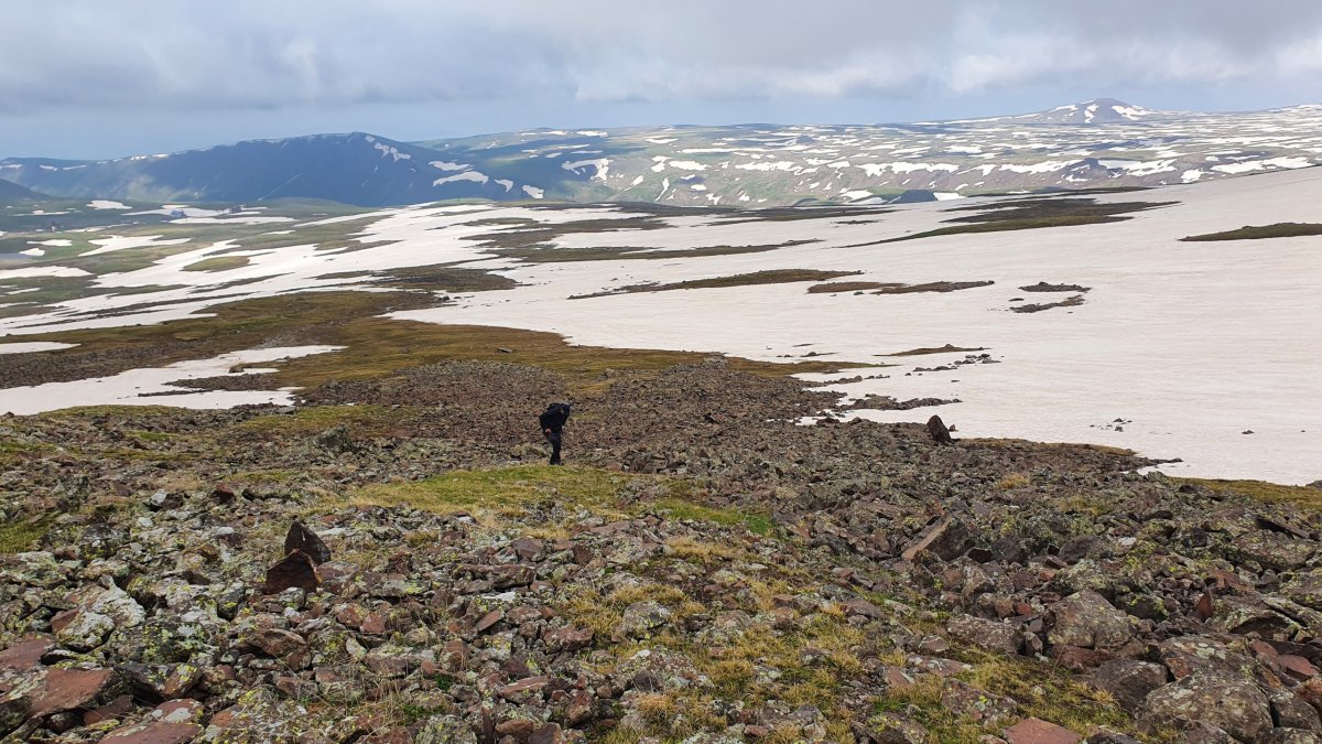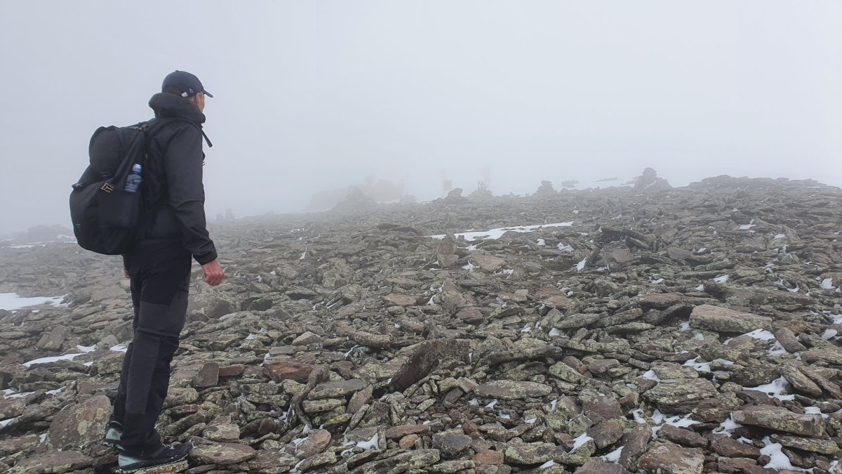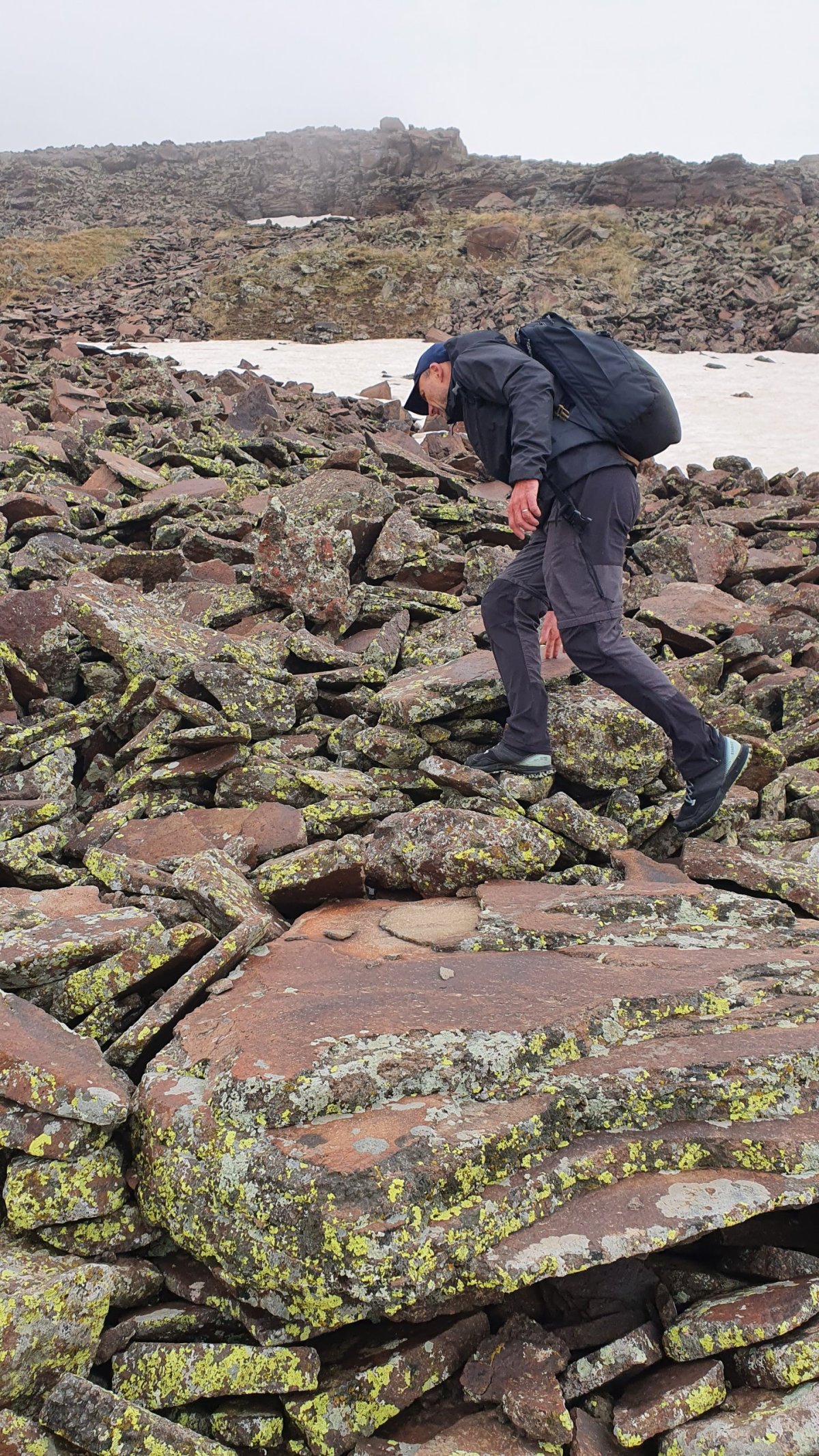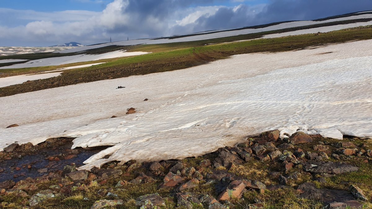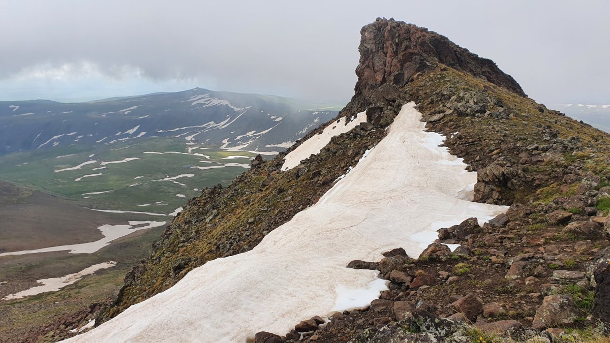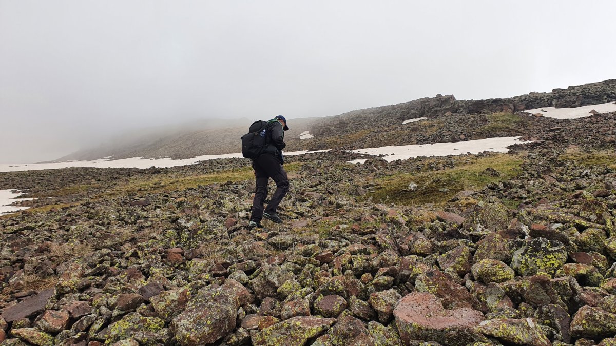 Cesta i počasí se kazí rychleji, než jsme čekali. Jdeme přímo do mraků. Všude kolem jen sníh a kameny a sníh a kameny. Na tohle nejsme připraveni. Ani oblečením, ani psychicky. Konečně nám dochází, že se nahoru na Aragats letos ještě nechodí, proto je parkoviště u jezera Kari prázdné a restaurace zavřená. Sněhové plotny jsou už ve výšce 3300 m a těžko se to bude zlepšovat. A ta široká oficiální cesta nahoru vede prostě letos v červnu ještě sněhem.