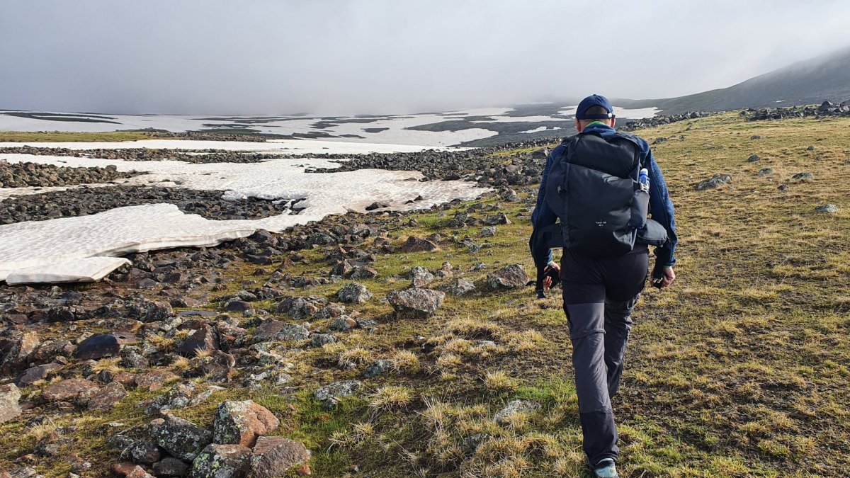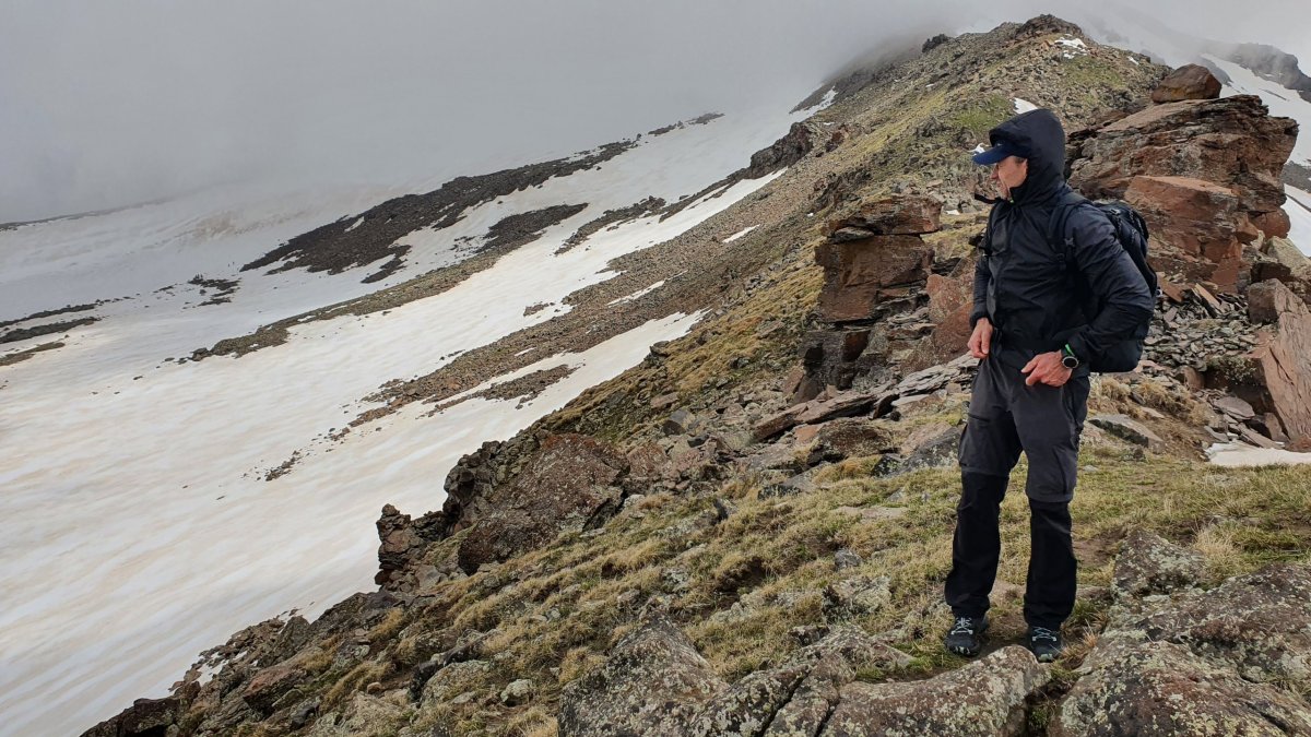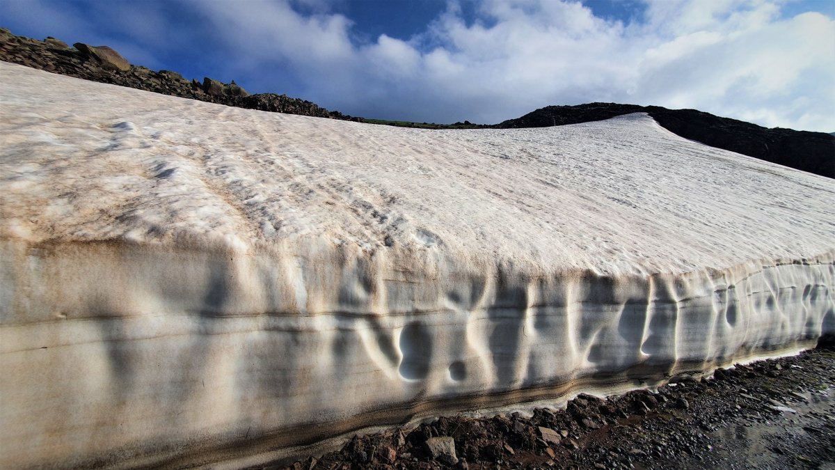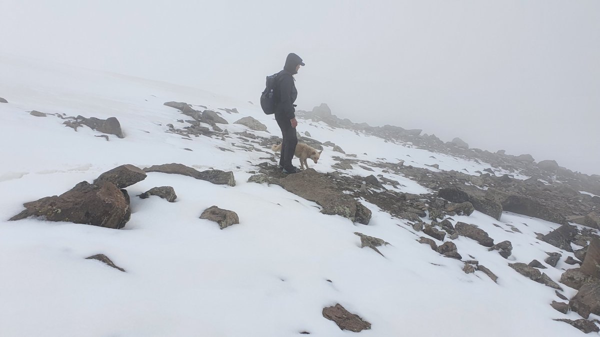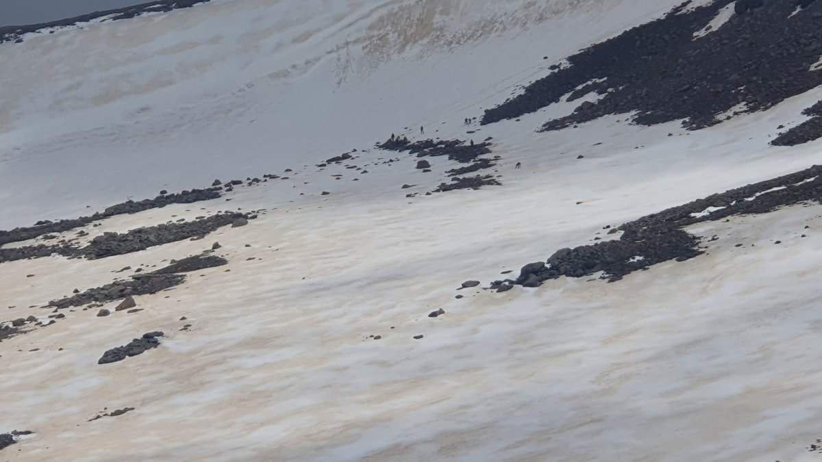 Cesta i počasí se kazí rychleji, než jsme čekali. Jdeme přímo do mraků. Všude kolem jen sníh a kameny a sníh a kameny. Na tohle nejsme připraveni. Ani oblečením, ani psychicky. Konečně nám dochází, že se nahoru na Aragats letos ještě nechodí, proto je parkoviště u jezera Kari prázdné a restaurace zavřená. Sněhové plotny jsou už ve výšce 3300 m a těžko se to bude zlepšovat. A ta široká oficiální cesta nahoru vede prostě letos v červnu ještě sněhem.