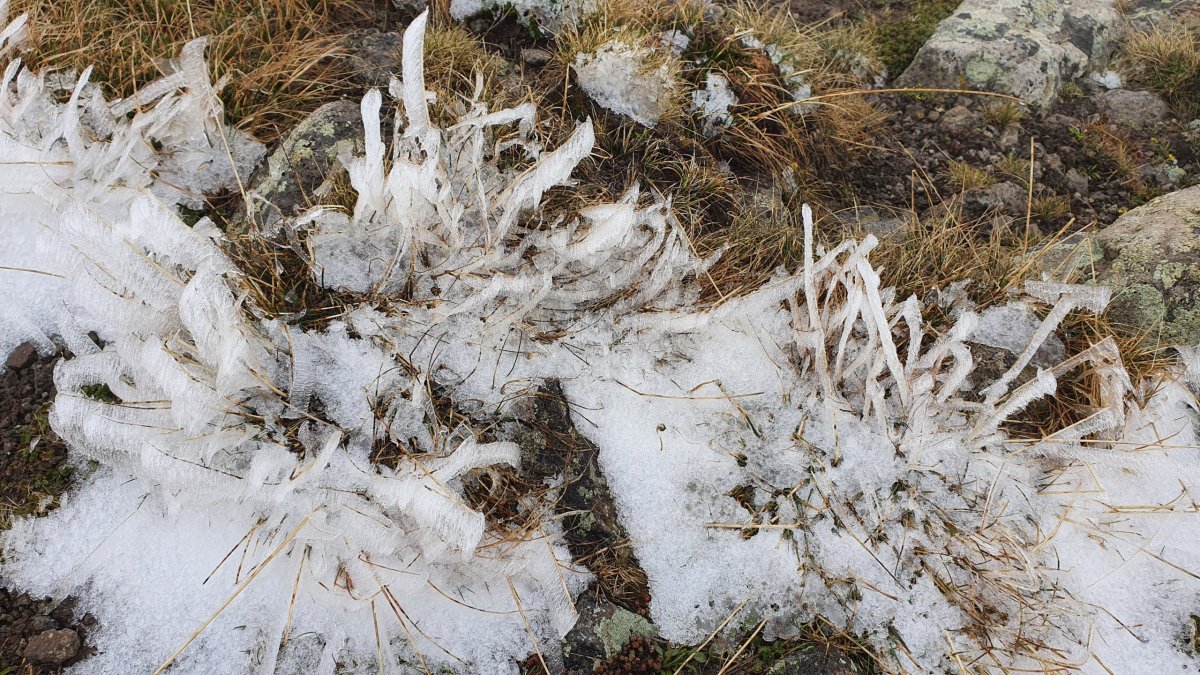 Obdivujeme východ slunce a okolní krajinu, nikoho nepředjíždíme ani nikdo nás, všichni ještě spí, to je super, cestou nahoru dnes nebude tlačenice :) Zbytky sněhu kolem nás nerozhodí, jsou to přece avizované zbytky.