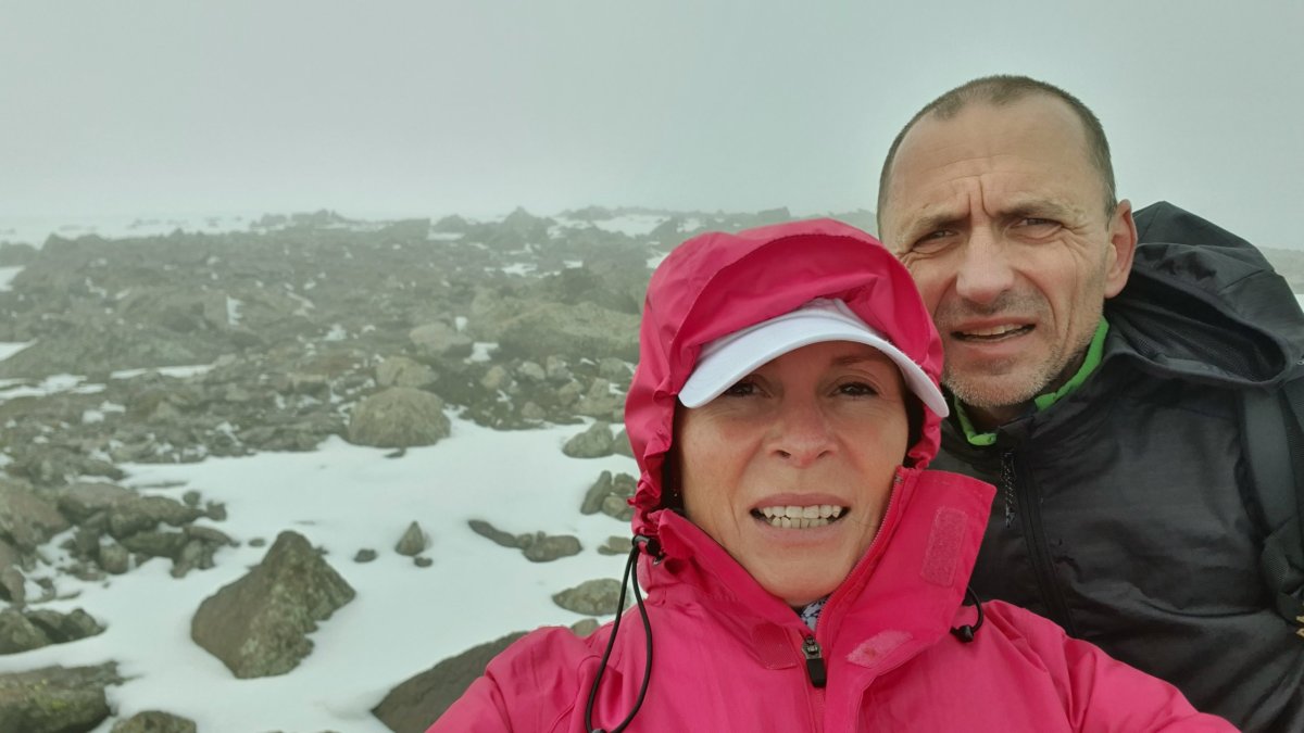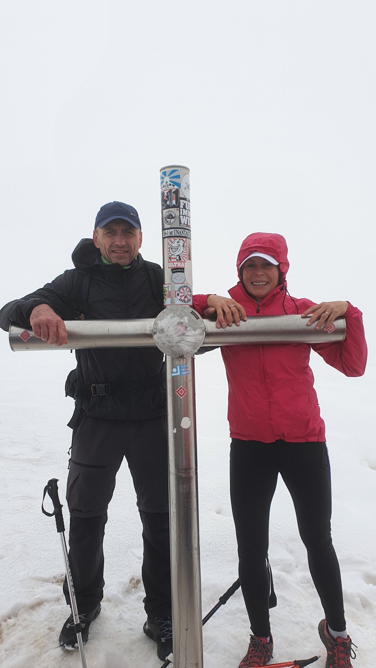 Konečně jsme na hřebeni!! Fičí tady jako blázen a my začínáme stoupat někam do mraků. Dýchá se nám trochu hůř, ale jdeme pořád docela rychle a bez přestávky, je tu prostě jen trochu řidší vzduch. (Víme, že se má jít pomalu, kór když jsme se vyprdli na aklimatizaci, jenže se bojíme zhoršení počasí.) Fotíme se radši každých 50 výškových metrů, protože každým metrem už překonáváme náš dosavadní životní výškový rekord!
