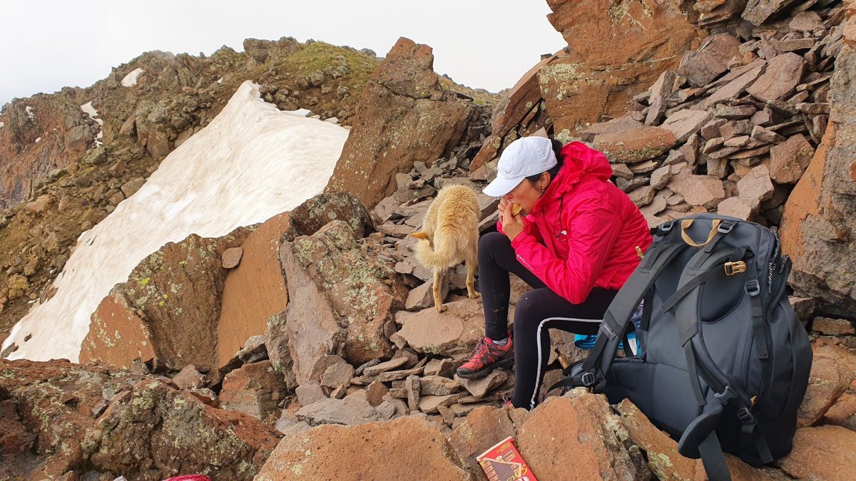 Od 4 hodin od rána jsme nikoho neviděli a s nikým nemluvili a najednou nás v cíli vítá parta zvědavých a vysmátých Íránců v profi horolezeckém vybavení a raduje se společně s námi z dosažení jižního vrcholu nejvyšší hory Arménie! A tak se tu všichni společně radujeme a fotíme a oni neví, jaká je nám už kosa, ani jak strašně jim závidím ty teploučké bundy a rukavice a čepice a šály a koukám, co všechno s sebou ještě mají, boty s píchákama (říká se tomu mačky), to snad musí chodit v tom sněhu samo a taky termosky a v nich určitě teplý čaj a trekingové hole a (asi nějaké speciální horské) sluneční brýle a vyteplené kalhoty a na tom ještě návleky...