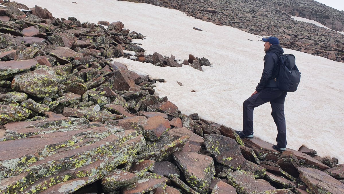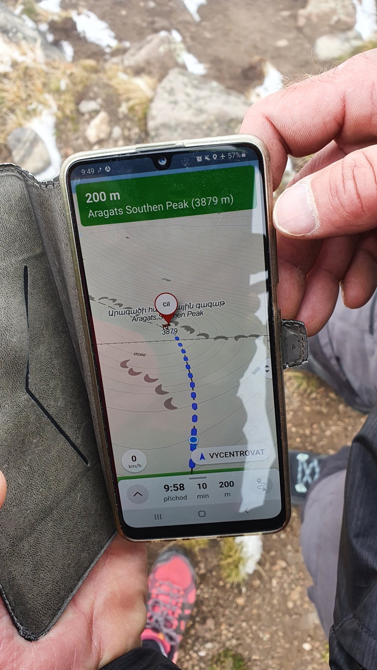 Fotíme se už ve výšce 3400 m. Fouká a je nám zima. Poprvé přemýšlíme, že se na to všechno vykašlem. Zásadní rozhodnutí nás čeká už po pár metrech. Buď půjdeme tajícím sněhem (a to v teniskách fakt nejde) a nebo kolmo na hřeben a pak dál po hřebeni směrem na jižní vrchol: "V žádném případě nechoďte přes hřeben, nahoru vedou 2 jiné, bezpečné cesty!" Na sekundu se zamyslím... chviličku zní lákavě vyprdnout se na celý Aragats a jít se opalovat do Jerevanu (kde je dnes neuvěřitelných 30 stupňů a v Bagratově bazénku jsme ještě ani nebyli)... Ale přece to nevzdám! Vyberu si druhou možnost: jít přes plotny pohyblivých, placatých kamenů do prudkého kopce kolmo na hřeben, kde z našeho pohledu sníh není. Prostě dojdeme nejvýš, co to půjde.