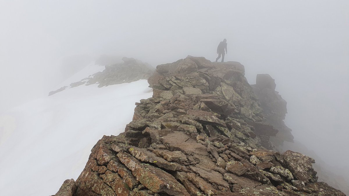 Lehká výšková nemoc se zřejmě dostavila. Jsme trochu malátní a když zastavím, nakláním se na doleva. Hlavně, ať mě nezačne bolet hlava!.. (mám načteno).. trochu mi hučí v uších.. měli jsme tu sakra radši tu jednu noc přespat!.. a do toho slyším občas v tom vichru nějaké hlasy.. a smích.. tak to není dobrý.. protože Luky nic neslyší!! Halucinace! Příznak výškového otoku mozku! Přece to teď nezabalím? A jestli tady omdlím, nevím, jak mě Luky odtáhne dolů nebo jak zavolá pomoc? A zhoršuje se to. Už slyším křik a smích několika lidí najednou! A taky Lukyho větu: "Už to slyším!" Uf! On má Luky malinko horší sluch než já, no už nám není 30 ani 40 a lepší už to nebude :) Tak si to srovnáme. Před námi je jen mlha a my slyšíme smích. Vylučujeme párovou halucinaci (existuje vůbec?) a hned je nám jasné, že to bude náš jižní vrchol a někdo ho dnes dobyl před námi, sice nevíme kudy a jak, ale nahoře jsou lidi!!! Zastavíme a snažíme se očima rozehnat mlhu před námi a ono to funguje a na chvilku zahlédneme v dálce v mlze postavy, které hned zase mizí! Nemůžu už moc fotit, strašně to bolí (mráz).