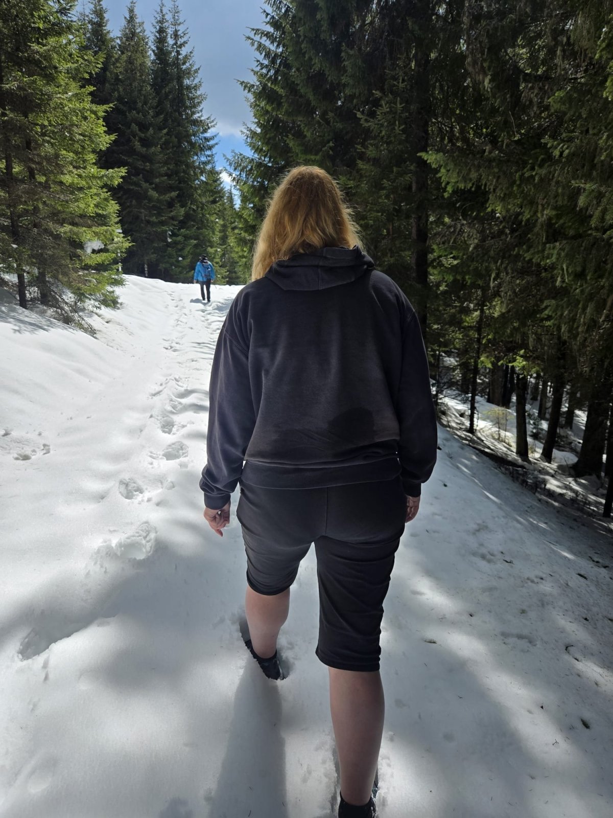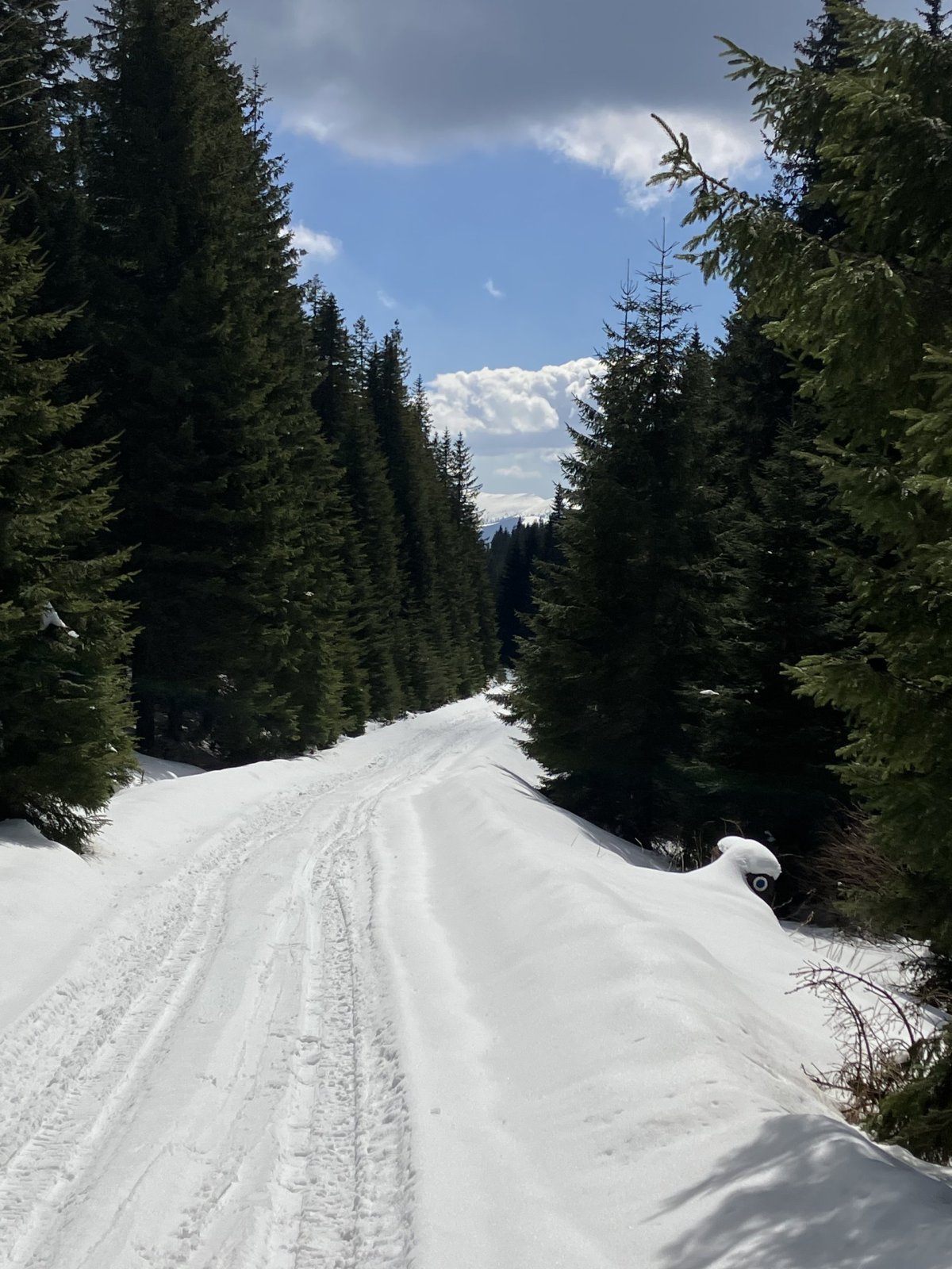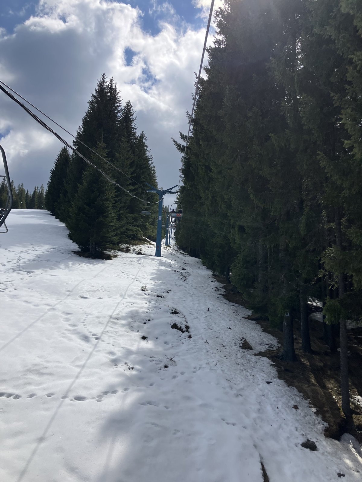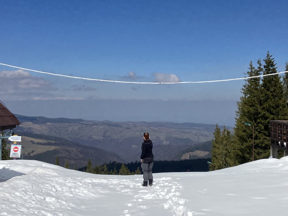 Další den míříme do hor v Păltiniș, kam se dostáváme autobusem číslo 22, a plán zní jednoduše: lanovkou nahoru a dolů po svých. Zatímco dole už to vypadá skoro na jaro, nahoře nás čeká úplně jiný svět, kde leží asi třicet centimetrů sněhu a cesta není vůbec prošlapaná.