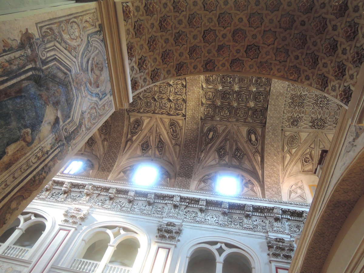 Směřuji do hotelu a v dáli na konci ulice mne jak magické oko přitahuje k sobě zdobná kachlová kupole kostela. Neodolatelné! Tak ještě jedna zastávka. Zde se arabští štukatéři (zvaní Mudéjarové) náramně vyřádili – zírám se zatajeným dechem na uchvacující strop mudéjarského stylu s tóny kultury islámské, křesťanské a židovské, splývající v jednu překrásnou harmonii (Santiago El Mayor).