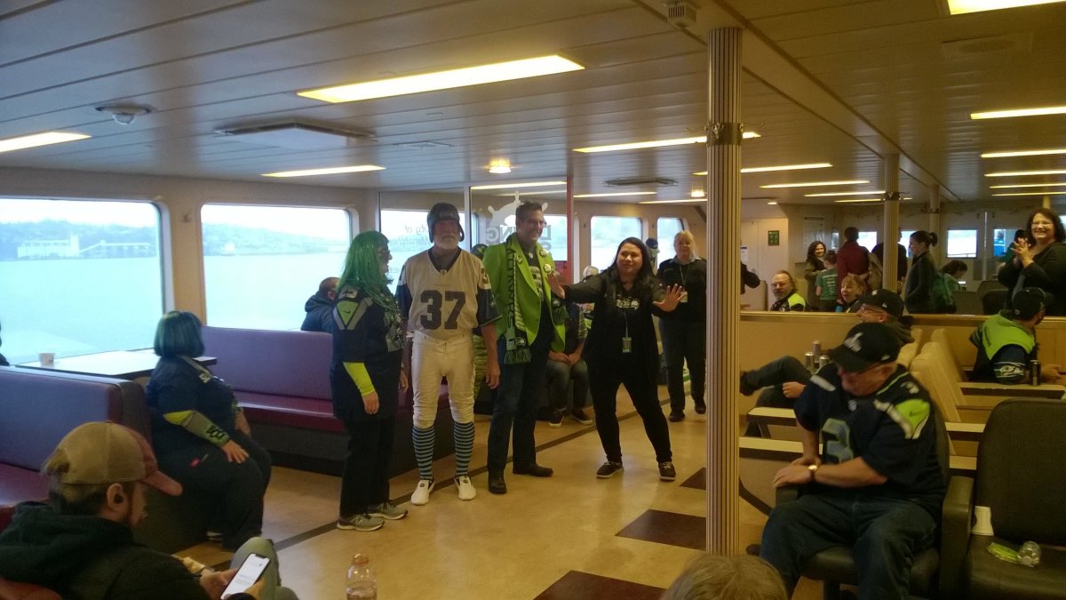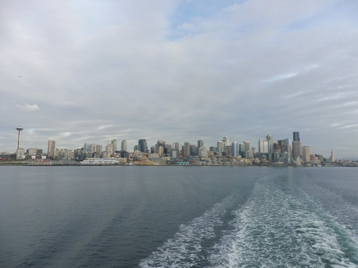 Kolem Seattlu se nachází množství ostrovů a poloostrovů. My se téhož dne vydali trajektem na ostrov Bainbridge. Na ostrově najdeme sice spoustu zajímavostí, ale bez auta je to k ničemu. Šlo nám zejména o pohled na panorama Seattlu, který ovšem stál za to. Na cestě zpět se na trajekt nahrnulo spousta lidí v šedivo-zelených dresech týmu Seattle Seahawks. Hrál se totiž Super Bowl, což je pro Američany velkolepá událost, byť vstupenky údajně mohou stát hodně přes 100 dolarů. Během cesty se také konala soutěž o nejbláznivější kostým. Američany zkrátka na blbosti všeho druhu užije.