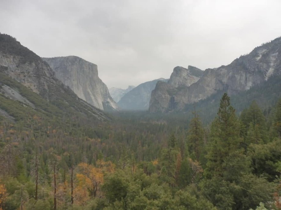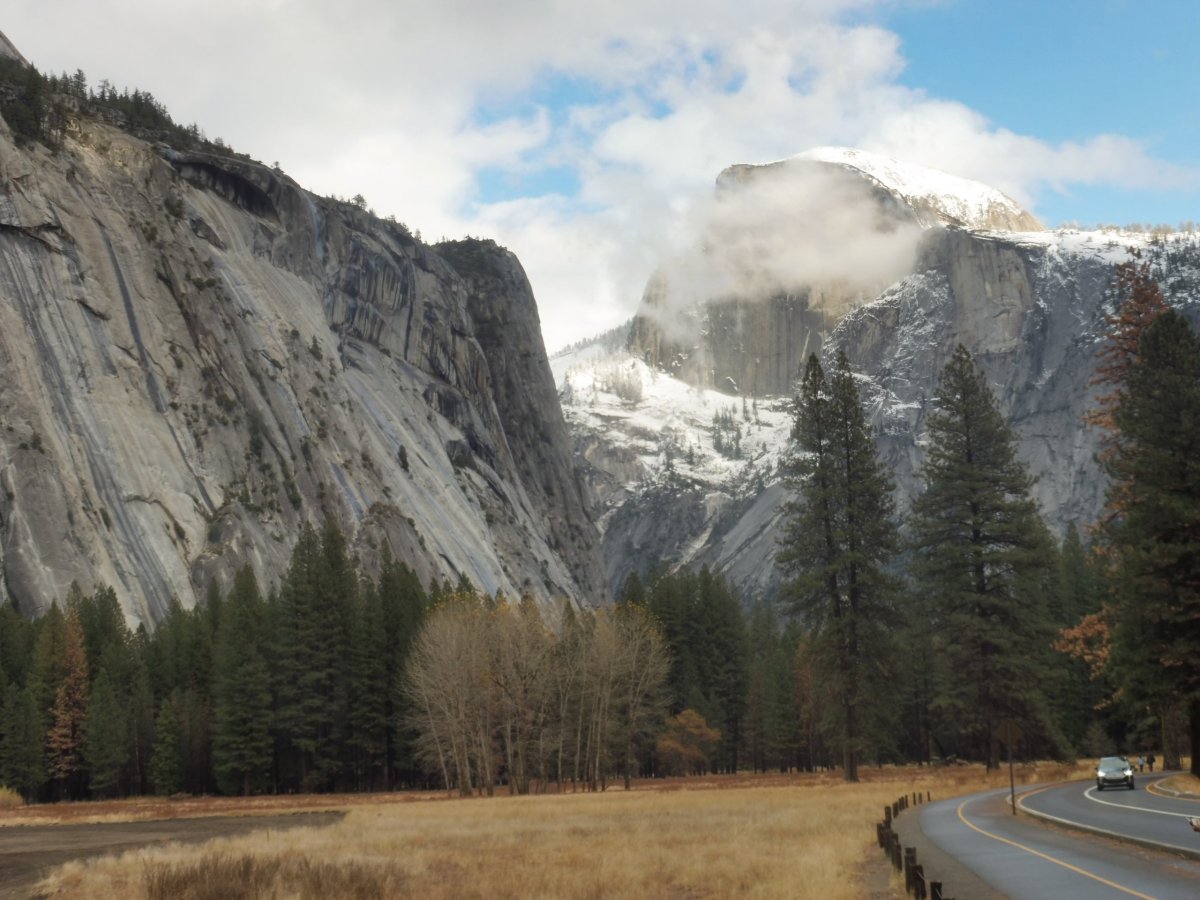 Cestovali jsme tam autobusem společnosti Greyhound, v Mercedu jsme si přesedli na autobus společnosti YARTS, který nás dovezl přímo do ubytování, které jsme na tři noci měli zajištěné v Cedar Lodge. Po ubytování jsme si museli odpočinout (zejména teplotami sužovaný Michal), abychom byli ready na zítřejší výlet. Autobus (jednosměrné jízdné činilo 7 USD) nás následující den přímo od ubytování dovezl do Yosemite Village, odkud jsme podnikli asi 20 km dlouhý okruh k oblíbené vyhlídce - Yosemite View Pointu, cestou jsme obdivovali skalní masívy hor El Capitano, Half-Domu i jiných, mohli jsme vidět potůčky, pokoušeli se objímat obrovské stromy, potkali jsme dokonce i skupinku medvědů. Jediné, co jsme neviděli, byl Yosemitský vodopád, Kalifornii totiž postihlo v tu dobu velké sucho, takže se nedostatek vody projevil i zde. Výlet to byl vskutku namáhavý. V návštěvnickém centru jsme si dali pivko na regeneraci, Michal si vybral mexické Modelo, nějak ale přehlédl, že se jedná o pivo tomatové, ani netušil, že něco takového existuje. Následující den jsme zvažovali výstup na Yosemite Point, s velmi strmým stoupáním, Michal byl ale velmi vyčerpaný, přes noc navíc sněžilo, takže jsme až ve 12:00 vyrazili pouze na krátkou procházku k Mirror Lake. V ten den byl také Den díkuvzdání, chtěli jsme si dát v restauraci krocana, ale nepochodili jsme, tento svátek se slaví pouze doma v rodinném kruhu. Dali jsme si tedy, co bylo, pokecali se sympatickou barmankou Catherine, zapili to pivem a šli jsme spát, abychom byli připraveni na následující přesun.