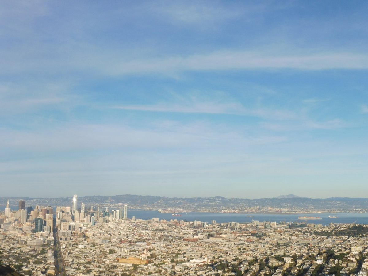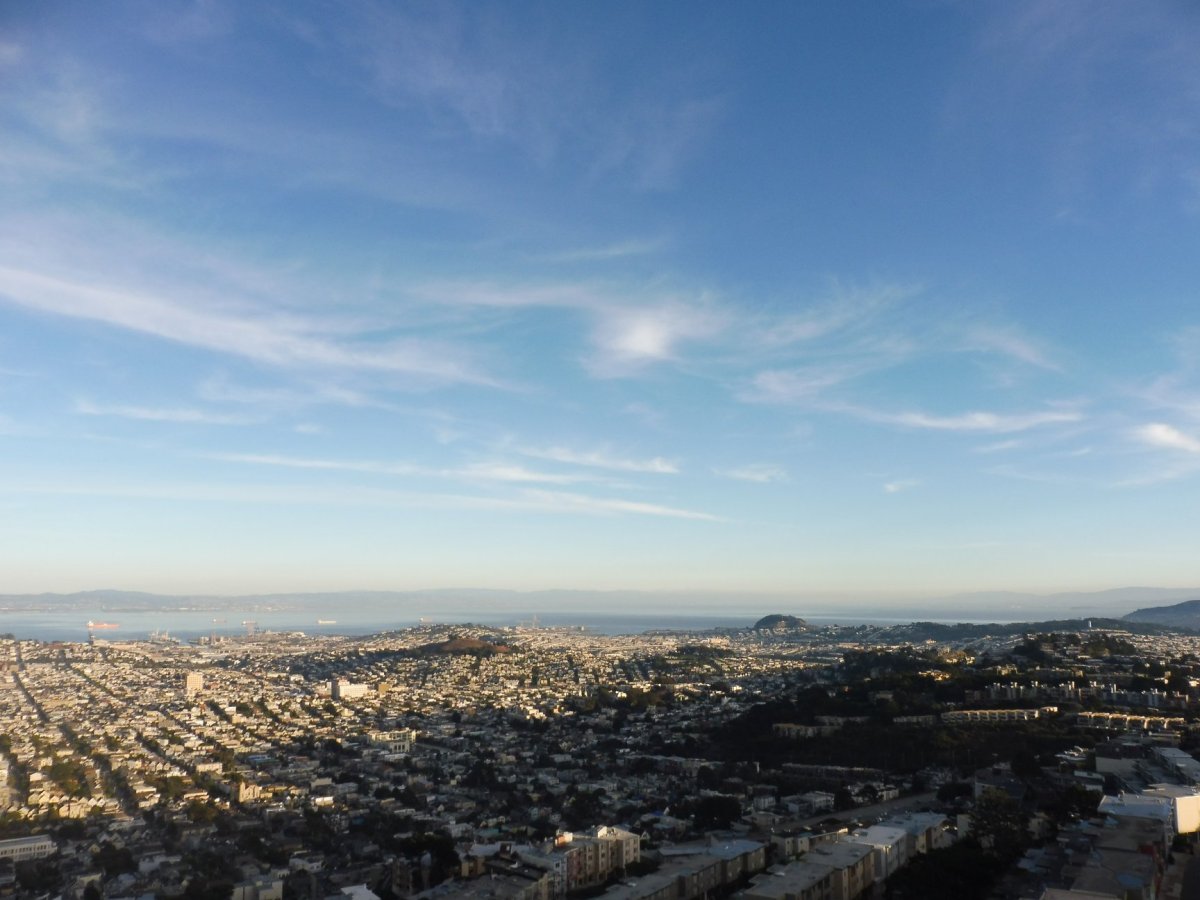 Dalším z výhledů je kopec Twin Peaks. Dorazili jsme do LGBT čtvrti Castro a odtud se drali po silnici do kopce po svých. Námaha však stála opět za to. Nebe bylo téměř bez oblačnosti.