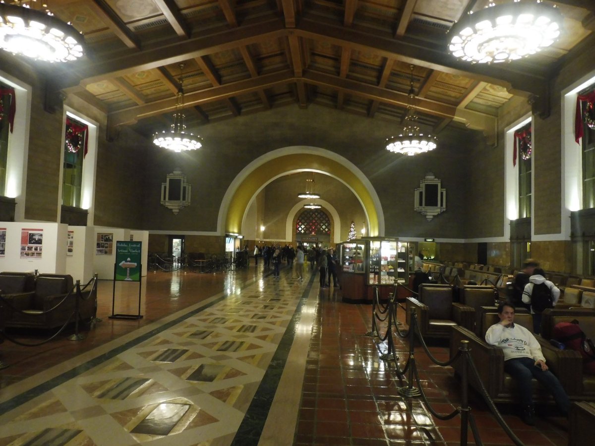 Vegas i jeho okolí byly fajn, my však museli opět dál. Flixbusem jsme se v sobotu ráno prvního prosincového dne přesunuli od Colossea do poslední destinace, a tou bylo Los Angeles. Autobus nás vyplivl u Union Station, jednoho z nejkrásnějších vlakových nádraží v USA, natáčel se zde i kultovní snímek Blade Runner. Za 25 USD jsme si koupili lítačku na 7 dní a jeli jsme do ubytování v poněkud omšelém City Center Hotelu, který sice nebyl nic moc za (stál "pouze" 850 Kč/noc/osoba), ale nacházel se v bezpečné lokalitě (za nebezpečné jsou kromě Skid Row považovány Pico-Union, Watts, Westlake, Boyle Heights a South Central) asi 500m od metra 7th St / Metro Center a s nákupními možnostmi (zejména potraviny v řetězci Target v OC FIGat7th). Poté jsme se jeli podívat na staré město nacházející se na Olvera Street, které je sice malé, ale dokáže evokovat koloniální časy.