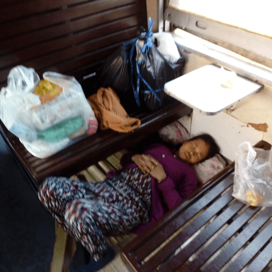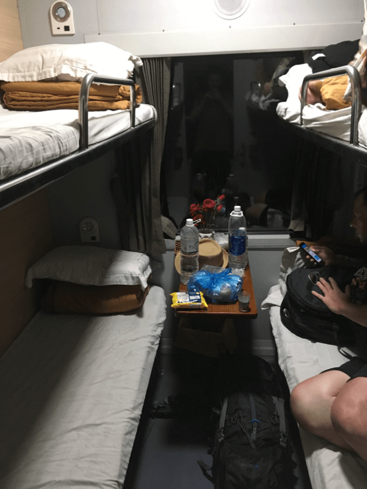 Nasledujici noc travime ve vlaku. Cesta je naplanovana na nejakych 10 - 11 hodin a k memu prekvapeni zatim vse jezdi na cas. Uprime jsem to po zkusenostech z Thajska vubec necekal, spis jsem si myslel, ze to bude jeste horsi. Prvni trida sice neni zadny velky luxus, ale kdyz vidime jak cestuji vietnamci, tak si rozhodne nestezujeme. No posudte sami.