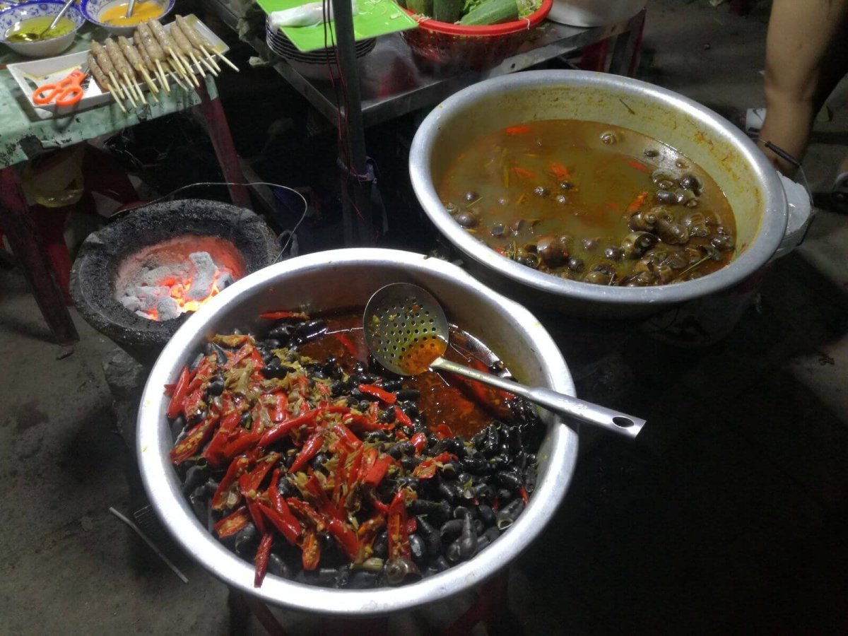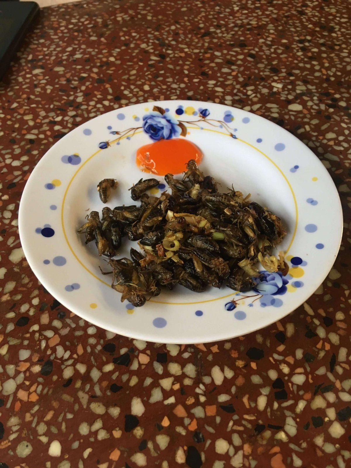 Nasleduje navsteva vyrobny ryzove palenky a cvrcci farmy s ochutnavkou. Palenka je nam servirovana vytokem rovnou z kotle. Jedna se o destilat s 20-30% alkoholu. Nasledne je nam ukazano jak pestuji cvrcky, jaky je rozdil mezi samici a samcem. Pruvodce nas zve ke stolu a ja se z hruzou obavam co se nachazi na taliri priklopeneho poklickou. Na otazku jestli jsem chicken nebo strong jednoznacne odpovidam, ze chicken. Se slovy “you will be stronger after this” prede mne stavi panaka ryzove palenky a ja si zacinam uvedomovat, ze se z toho asi nevykroutim. Do rukou dostavame hunting tools (paratka) a ja se navic zacinam obavat, ze je budeme konzumovat zive. Three, two, one poklice se zveda a k me velke uleve jsou uprazeny. Nejak se mi do toho nechce, ale nakonec preci jednoho ochutnam a je to vlastne takovy krupavy nic.