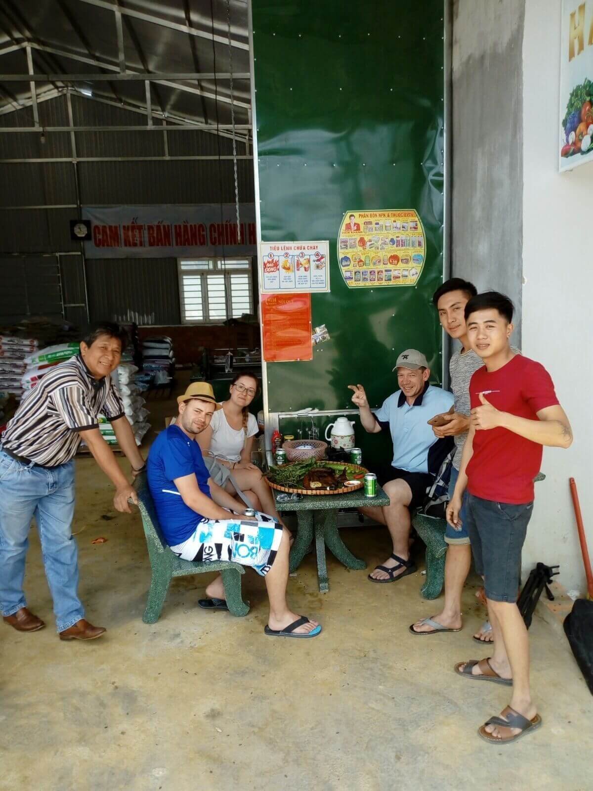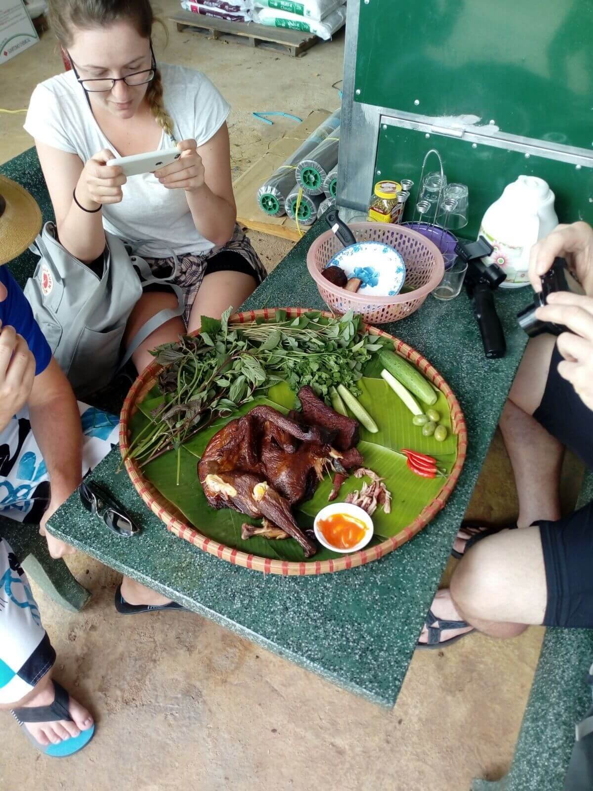 Uz to vypada, ze pojedeme na dalsi zastavku, kdyz nam pruvodce oznamuje, ze mame stastny den a ze nas mistni pres ulici zvou na uzeny bucek a uzeny kure. Vyborna svacinka, dostavame k tomu kazdy jeste zdarma plechovku piva na zapiti a v ramci podekovani mirime na vietnamsky fb a instagram prostrednictvim selfie s mistnima.