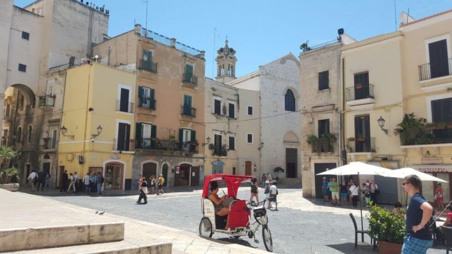 Po menšom kráčaní z dlhého prístavu sme sa ocitli priamo v starom centre Bari, ktoré mi pripomína skoro všetky talianske mestečká - úzke uličky obvešané sušiacim sa prádlom, tísickami topánok do hladka obrúsená kamenná dlažba a miestami zachované artefakty dávnych stavieb Rímskej ríše. Väčšina turistov sedí po kaviarničkách a reštauráciách, čo sme my aj napriek nastupujúcemu obedňajšiemu hladu nevyužili, keďže máme plno jedla na lodi. Prešli sme ale okolo najhlavnejších bodov, baziliky sv. Nikolu až ku katedrále di Bari, hľadajúc obchod s najlepšími magnetkami, ktoré pre kamarátov proste musia byť. Už pred plavbou sme dostali presné inštrukcie, z ktorých miest máme magnetky nosiť a na ktoré zabudnúť. Takto nás popoludňajšie výlety stoja maximálne tak 4 € na celý deň (až na niekoľko výnimiek neskôr).