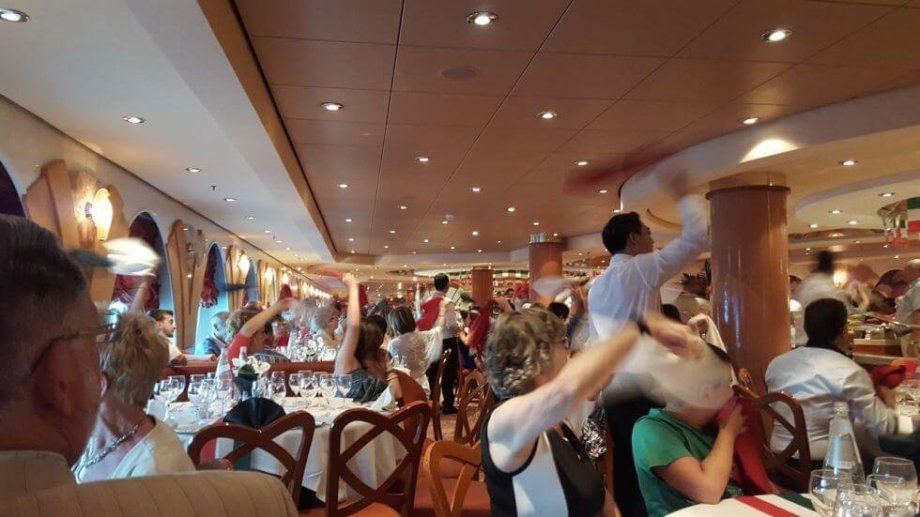 Ani nevieme ako a bol už aj čas večere. Vlastne vieme ako.. Práve sme sa zhodou okolností prechádzali okolo našej reštaurácie. Každá kajuta má totiž na večeru rezervovaný stôl vo veľkej à la carte reštaurácii na určitú hodinu. Buď sa ukážete, alebo sa môžete ísť najesť do niekoľkých samoobslužných reštaurácií v iných častiach lode. Keď už sme tu boli, tak reku, ideme sa rovno navečerať. Všetko je to na veľmi vysokej úrovni, každý stôl má určeného presne jedného obsluhujúceho čašníka a tým našim bola Candra z Indonézie. Aspoň tak to hovorila menovka na stole, ktorá nám oznámila, kto nás príde obslúžiť. Z Candry sa nakoniec vykľul muž, čo nám ani vo sne nenapadlo, že by mohlo byť mužské meno :D Podal nám menu, v ktorom sme si každý večer mohli vybrať z predjedla, polievky, prvého hlavného jedla, druhého hlavného jedla, dezertu, prípadne ešte nejakého špeciálneho dodatku. Samozrejme my, neskúsení európsky konzumenti odchovaní na menučkovej strave a rôznych pofidérnych reštauráciách východného bloku, sme si objednali polievku a niektoré z hlavných jedál, že veď to bude určite stačiť. Jasné, že nestačilo. Porcie sú menšie, ale menu je zložené presne tak akurát. Stačí si proste objednať všetko a z večere odídete naozaj najedený. To sme zistili teda až po prvom dni, tak sme dnes dopĺňali zásoby ešte v bufetovej reštaurácii. Mimochodom, v každej jednej je kvalita jedla na veľmi vysokej úrovni. Či už v à la carte, kde je každý večer iná tematika jedál, plus nejaká tá špecialita od šéfkuchára, alebo v bufetovom, kde si môžete naložiť počas celého dňa jedlá od výmyslu sveta (rôzne pizze, hamburgre, šaláty, mäsá, ryby, koláče, no proste všetko). Nemali sme čas byť niečím sklamaní. Všetko tip-top a personál sa naozaj stále snaží, aby vám spravil vašu dovolenku nezabudnuteľnou.