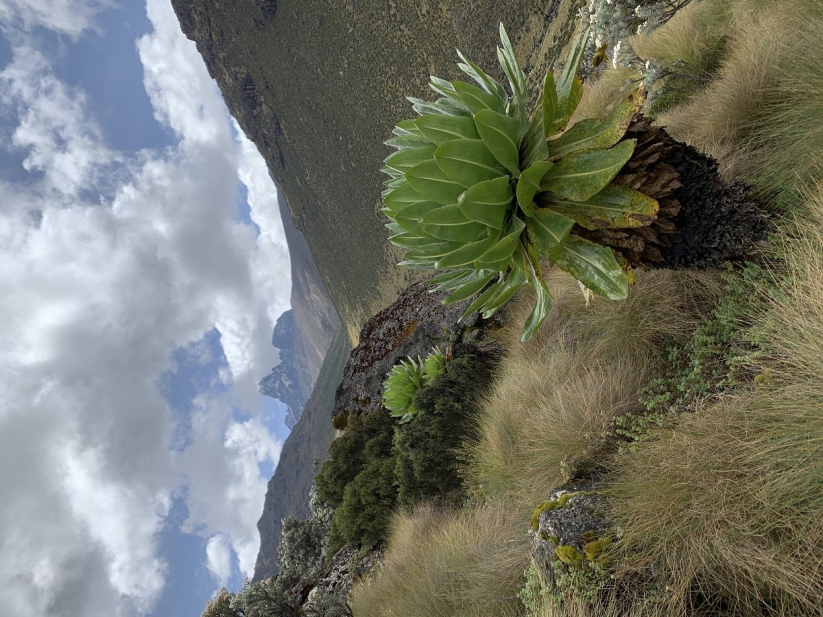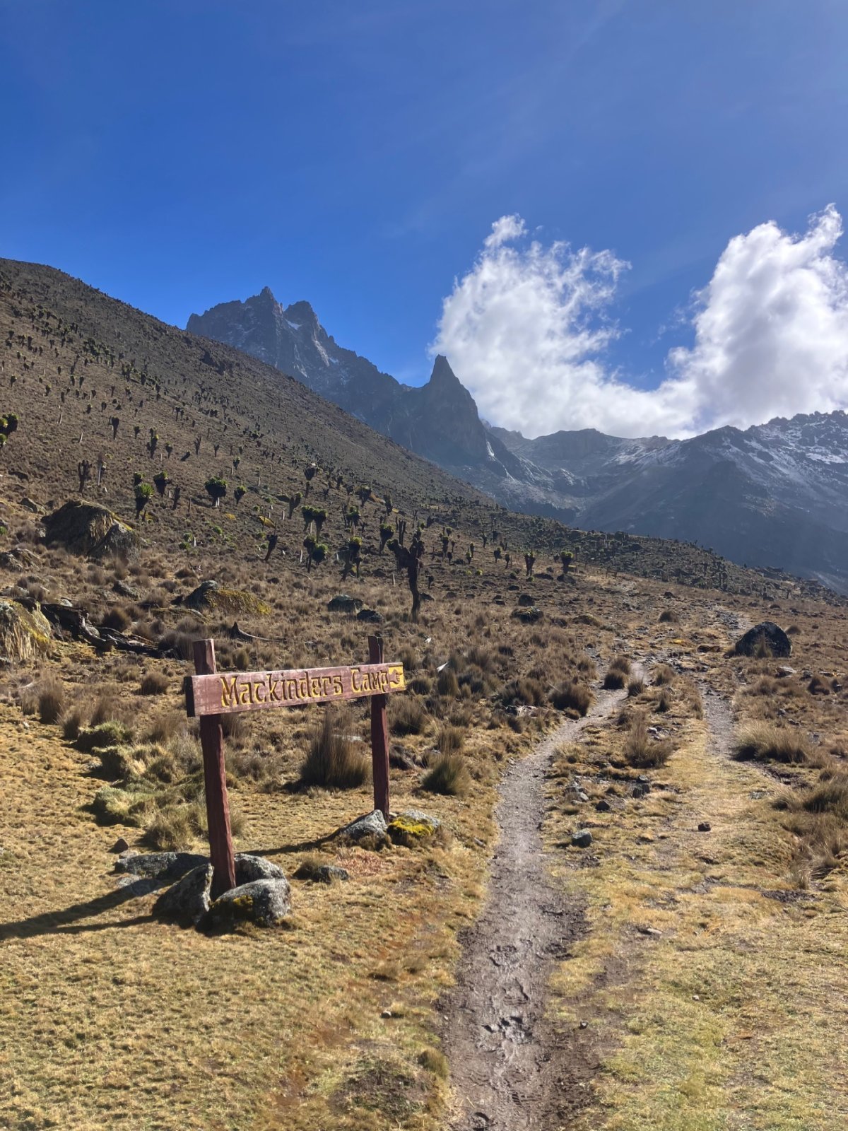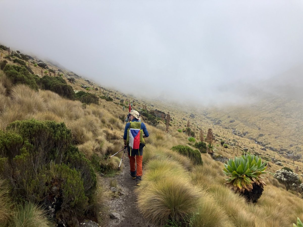 Chvíli jdu do kopce v patách Silasovi, mám chuť ho předběhnout, když on najednou začne zakopávat a klouzat a padat dozadu na mě. Dám si pár metrů odstup, asi se mu motá hlava, boty má ok, moc toho nenese, není důvod, aby tady tak klouzal. Za chvíli chce pauzu a pak už jde zase normálně. Brzy už přímo před námi krásně vidíme oba hlavní vrcholy masivu Mount Kenya: Batian (5199m) a Nelion (5188m). Asi v polovině cesty mám najednou signál a přijdou mi včerejší fotky a zprávy od dcery z Thajska :) Mám radost! Jsem ráda, že po mně to cestování zdědila a rychle jí z výšky 3800 m posílám aktuální fotky.