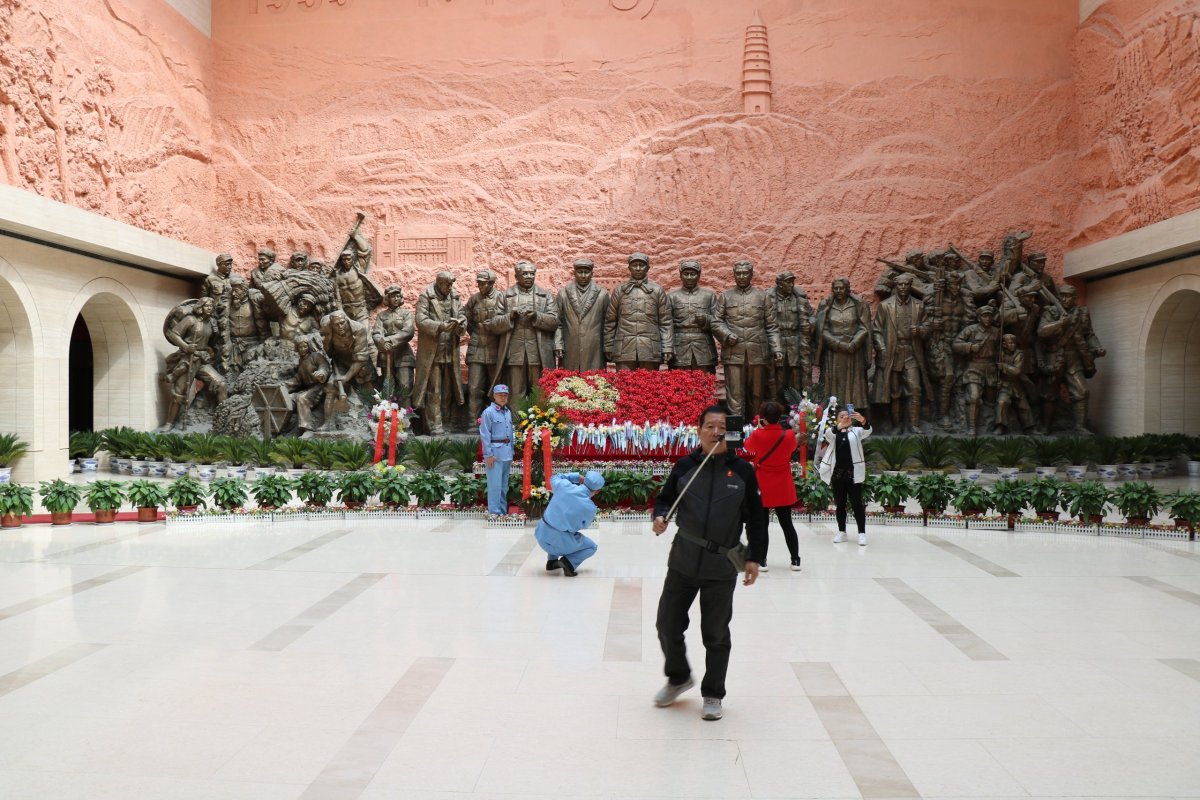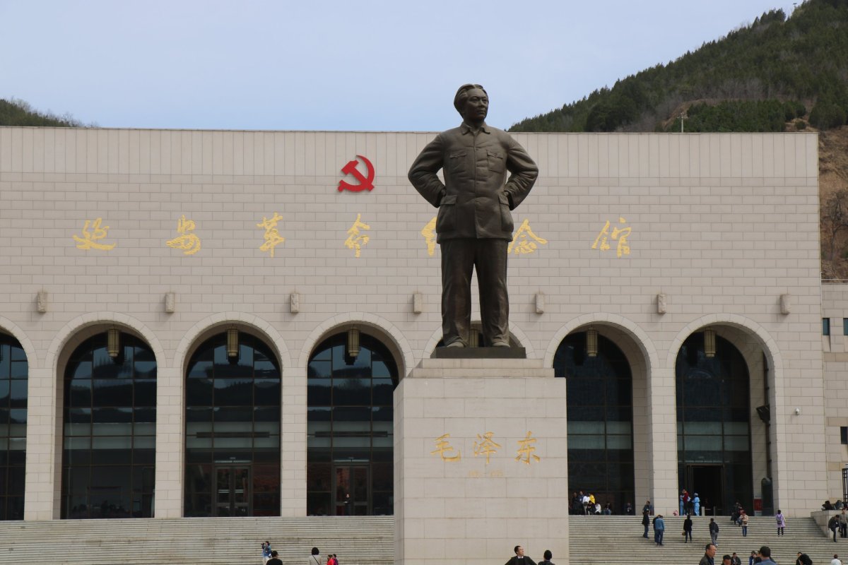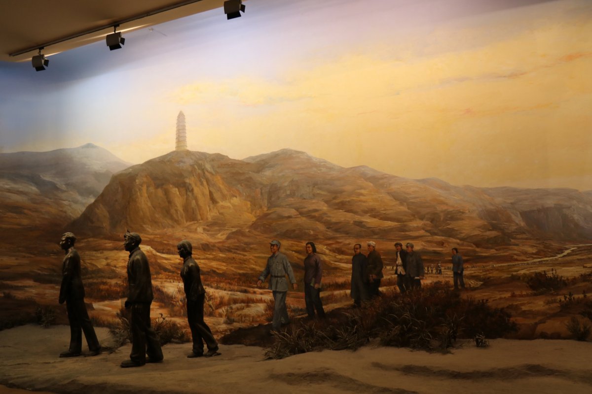Druhý den jdeme poznávat komunistickou minulost města. Právě v Yan'anu totiž končil takzvaný Dlouhý pochod, téměř dva roky trvající cesta čínských komunistů z jihu na sever Číny, kde byli v relativním bezpečí před nepřátelským Kuomintangem. Přešli desítky řek a hor, svedli spousty bitev a nakonec z celkového počtu 200 tisíc lidí dorazila do cíle jen čtvrtina. Hlavními vůdci byli Mao Ce-tung, Zhou Enlai a Deng Xiaoping, kteří se tak stali hrdiny a na dalších několik desítek let si vysloužili stálá místa na nejvyšších postech komunistické strany. Jelikož je Dlouhý pochod jednou z nejdůležitějších událostí čínských dějin, alespoň v tom komunistickém podání, stal se z Yan'anu oblíbený cíl "rudé turistiky". Nasedáme na autobus zastavující u všech pamětihodností města a jako první vystupujeme u Revoluční vzpomínkové haly. Cesta sem je pro správné straníky a školáky z okolních provincií povinností, Číňané se navíc rádi oblékají do oblečení typického pro dané místo a dobu, proto potkáváme spoustu lidí ve starých vojenských uniformách, ti se fotí u veliké Maovy sochy před budovou, pokřikují hesla a všude panuje pravá revoluční atmosféra. Hala je spíše obrovské muzeum věnované rannému komunismu a právě Dlouhému pochodu, najdete tu spoustu fotek, obrazů, zbraní, dobového oblečení, až po kartáčky na zuby a spoustu dalších předmětů ilustrujících tehdejší dobu.